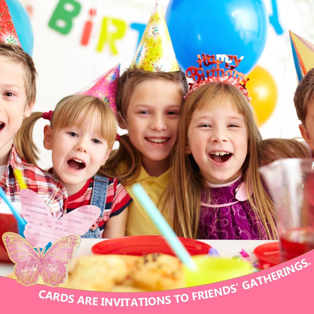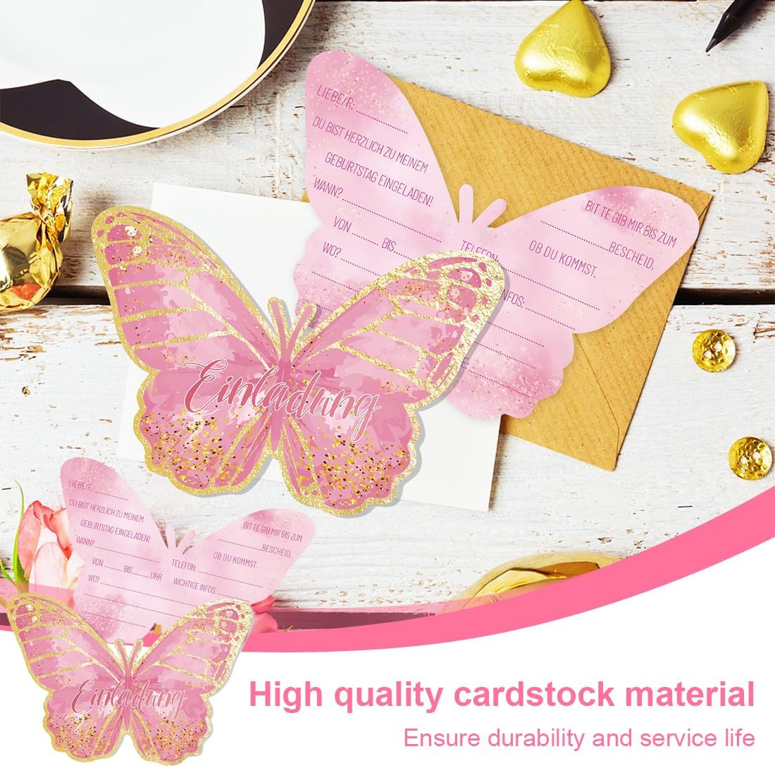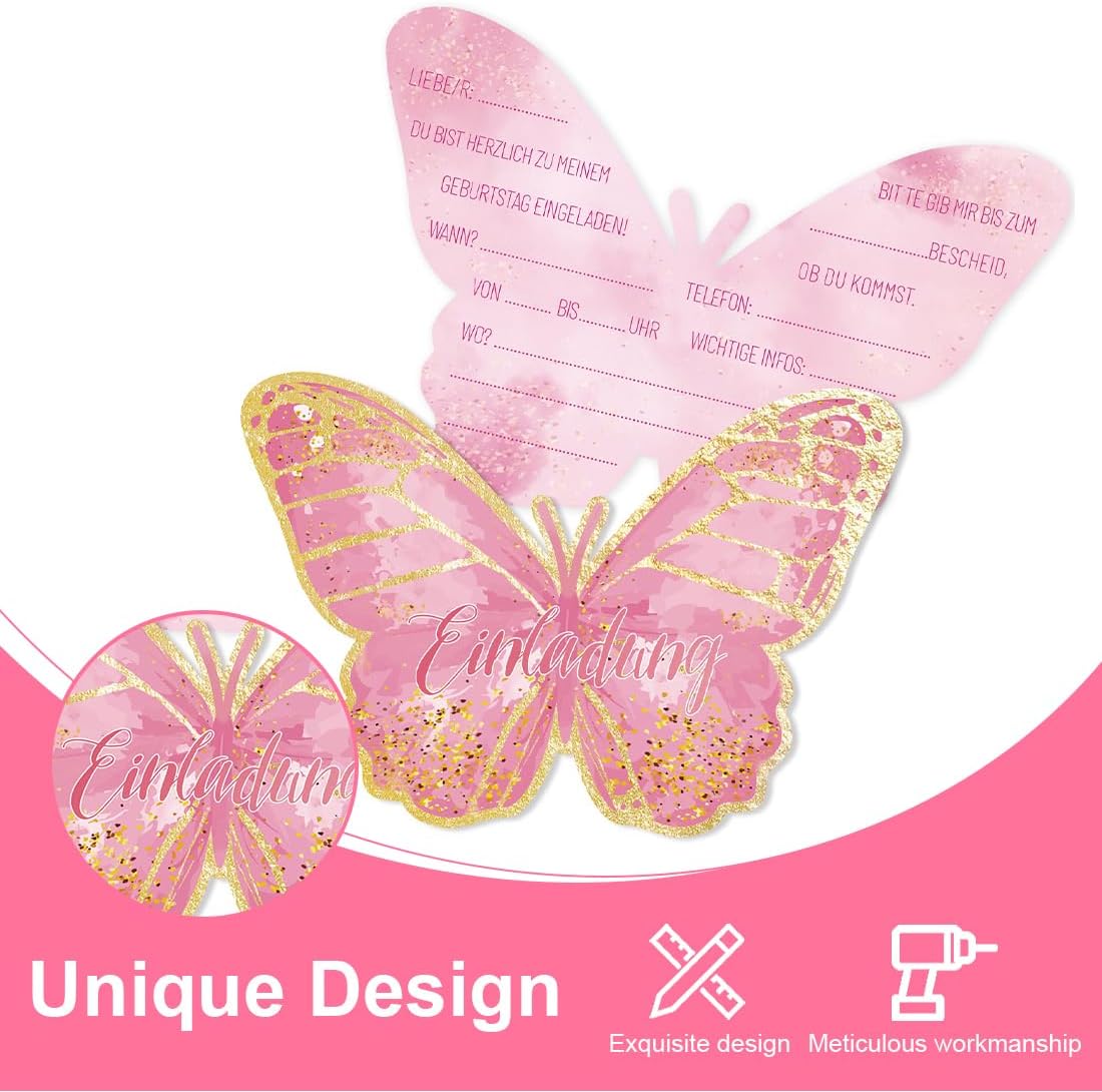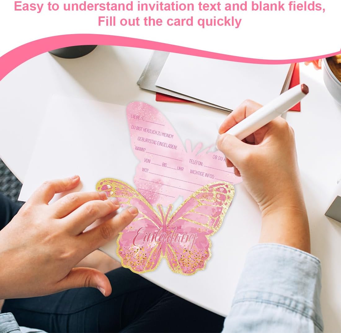 Set di valore: la confezione contiene 12 inviti a farfalla. Materiale di alta qualità: realizzato in cartone spesso di alta qualità, stampa fronte-retro, bel motivo, non sbiadisce. Compilazione rapida: il testo dell'invito è facile da capire e la carta può essere completata rapidamente. Dimensioni del prodotto: la dimensione dell'invito è di circa 16 x 12 cm, può contenere tutte le informazioni importanti, può essere scritto con tutte le penne standard. Multiuso: che si tratti di compleanno per bambini, feste in giardino, feste dei bambini, feste a tema o feste estive, questi biglietti sono perfetti per invitare gli amici a una festa.