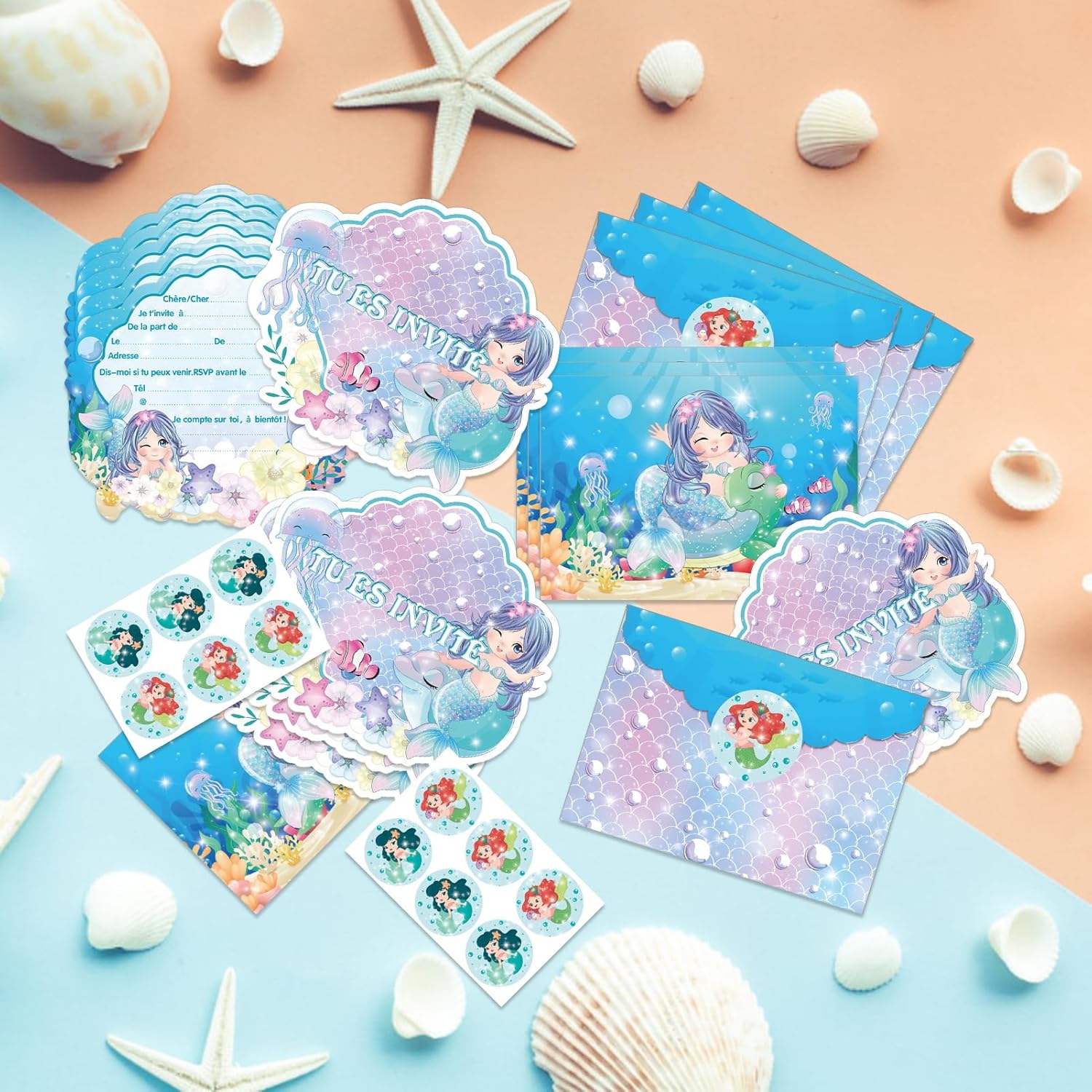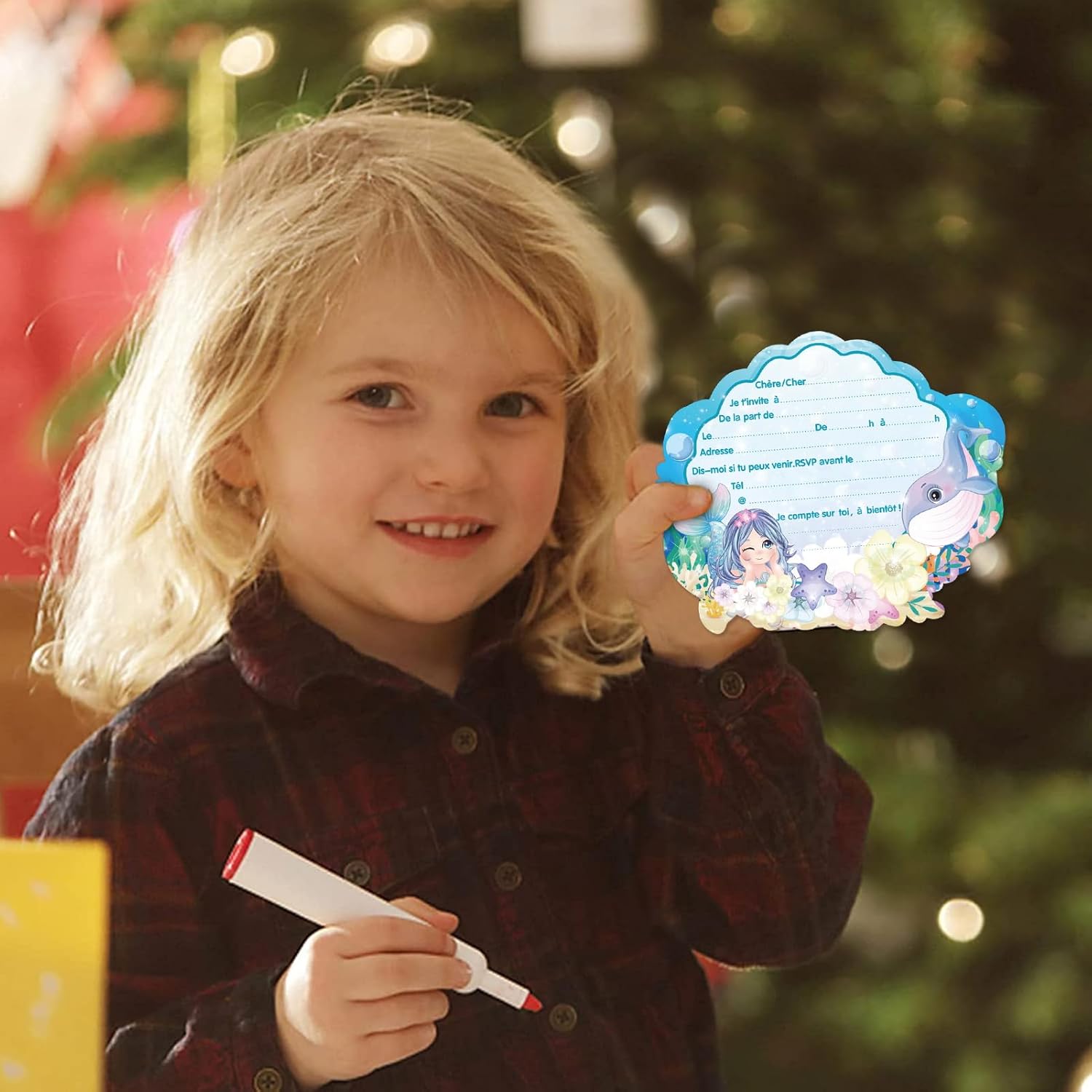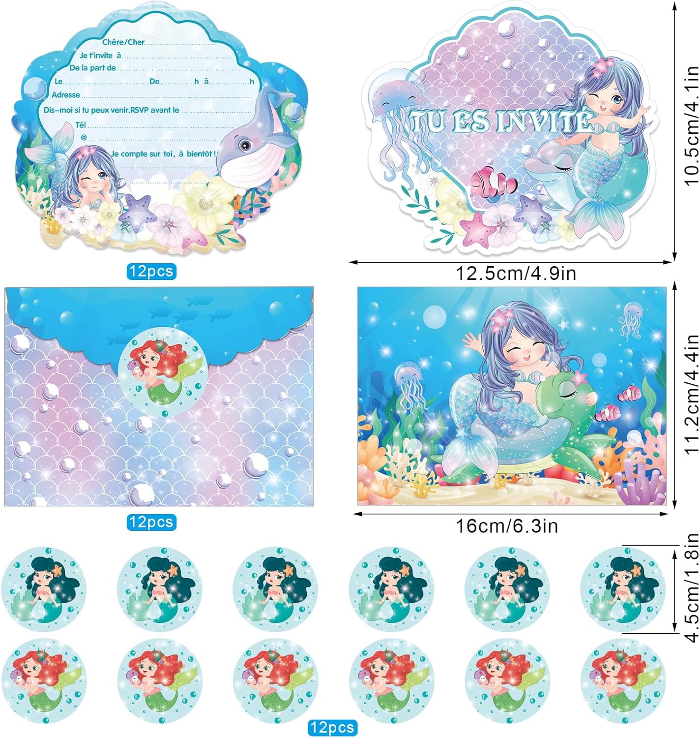 Inviti di compleanno per ragazze: Questo set di inviti di compleanno per bambini include 12 biglietti d'invito in francese, 12 buste e 12 adesivi per sirene. Materiali di alta qualità: Questi biglietti di auguri per la sirena sono realizzati con materiali di carta di alta qualità. La carta è molto stente, non si sgualcisce facilmente e la stampa è chiara e vivace. Tema della sirena: Questo set di inviti per feste imita la forma delle conchiglie, combinato con colori vivaci e vivaci, nonché motivi marini come sirene, stelle marine e alghe, tra cui l'invito una sensazione carina e romantica. Facile da riempire La parte anteriore di questi inviti per feste presenta splendidi motivi di sirene e conchiglie, mentre il retro presenta un segnaposto per informazioni dettagliate come il nome della persona ospite, l'ora, il luogo e il tema. Il riempimento è molto conveniente. Adatto per diverse occasioni: Questi biglietti d'invito per ragazze sono dotati di buste e bellissimi adesivi, garantendo così una buona protezione delle informazioni scritte. Ideali per feste di compleanno per ragazze, feste di benvenuto per bambini, eventi scolastici, feste di Natale, ecc.