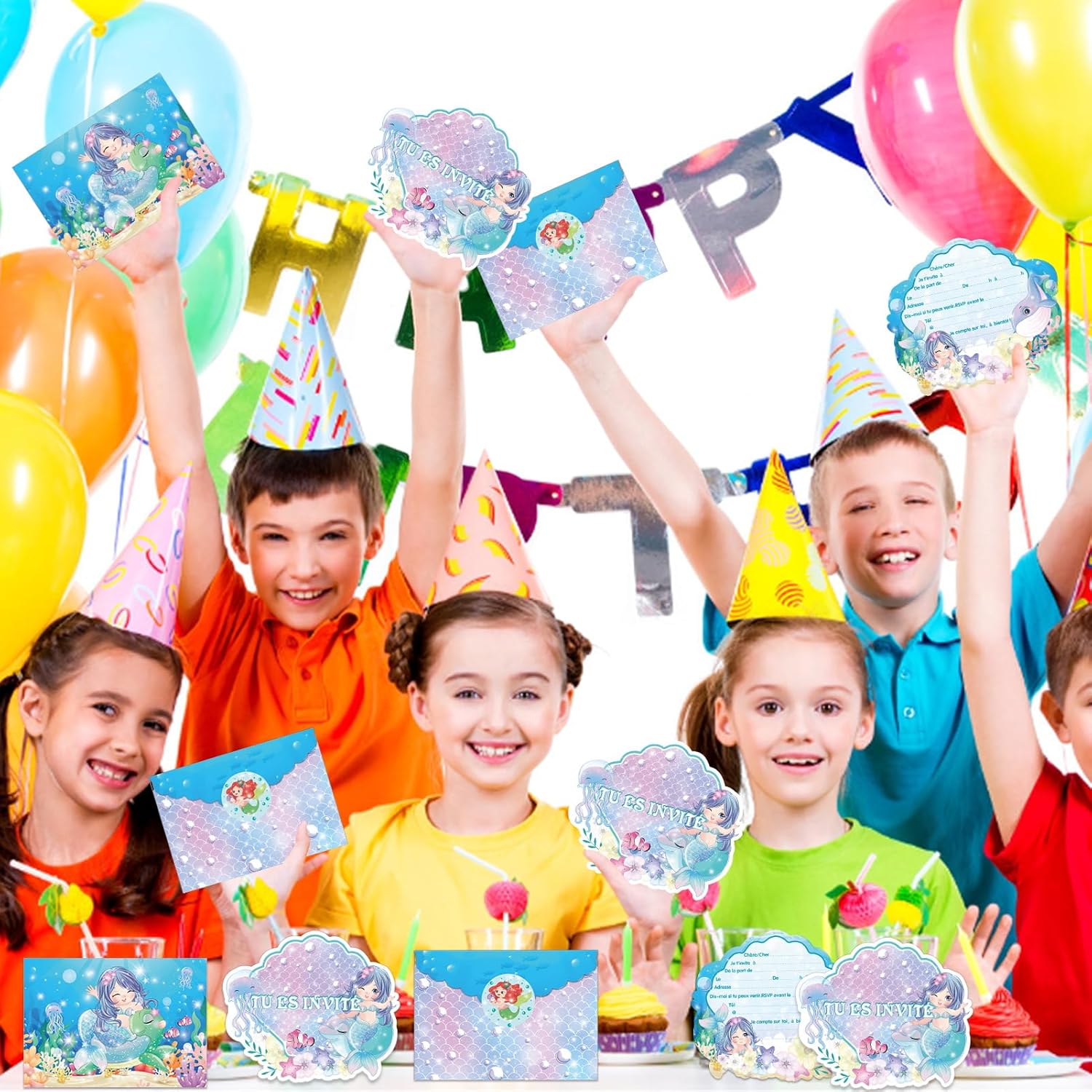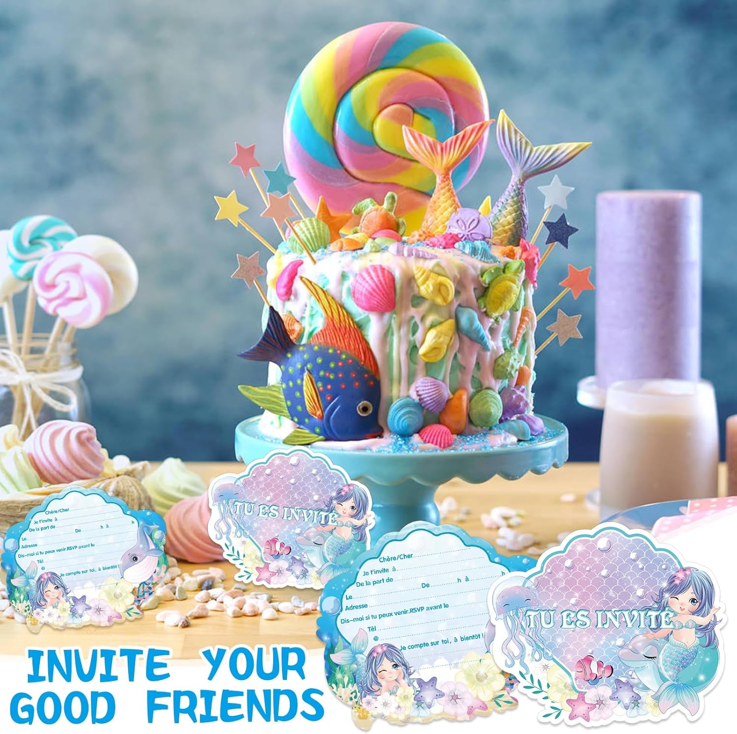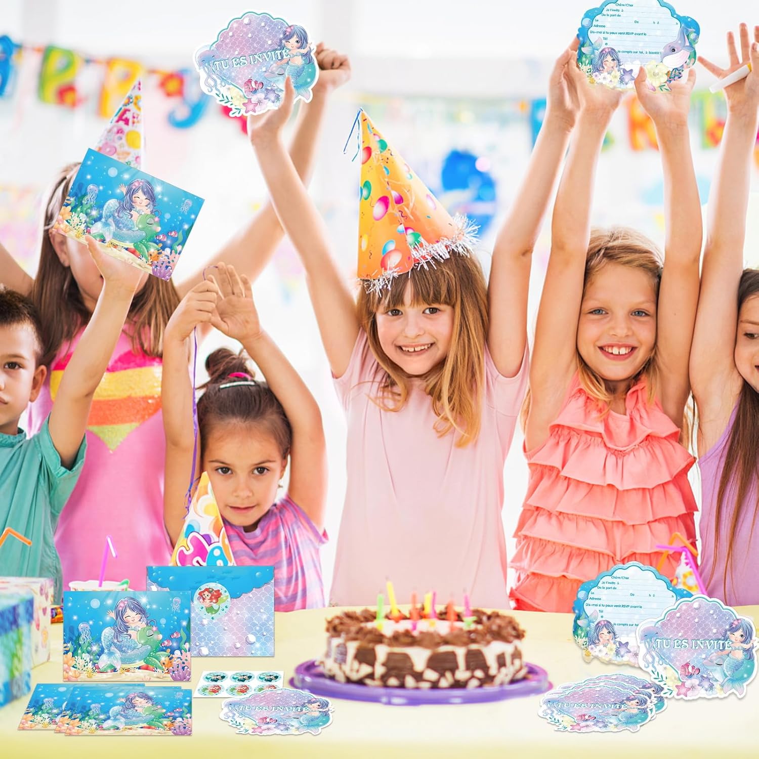 Inviti di compleanno per ragazze: Questo set di inviti di compleanno per bambini include 12 biglietti d'invito in francese, 12 buste e 12 adesivi per sirene. Materiali di alta qualità: Questi biglietti di auguri per la sirena sono realizzati con materiali di carta di alta qualità. La carta è molto stente, non si sgualcisce facilmente e la stampa è chiara e vivace. Tema della sirena: Questo set di inviti per feste imita la forma delle conchiglie, combinato con colori vivaci e vivaci, nonché motivi marini come sirene, stelle marine e alghe, tra cui l'invito una sensazione carina e romantica. Facile da riempire La parte anteriore di questi inviti per feste presenta splendidi motivi di sirene e conchiglie, mentre il retro presenta un segnaposto per informazioni dettagliate come il nome della persona ospite, l'ora, il luogo e il tema. Il riempimento è molto conveniente. Adatto per diverse occasioni: Questi biglietti d'invito per ragazze sono dotati di buste e bellissimi adesivi, garantendo così una buona protezione delle informazioni scritte. Ideali per feste di compleanno per ragazze, feste di benvenuto per bambini, eventi scolastici, feste di Natale, ecc.
