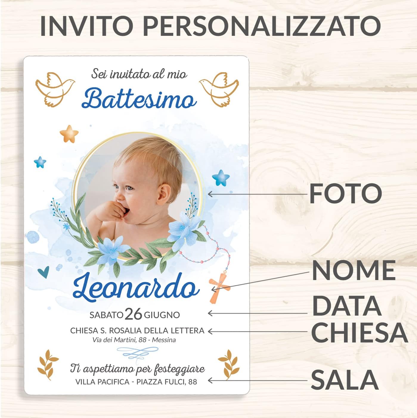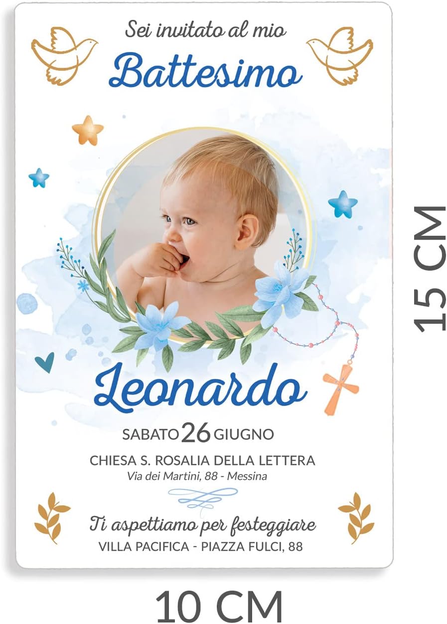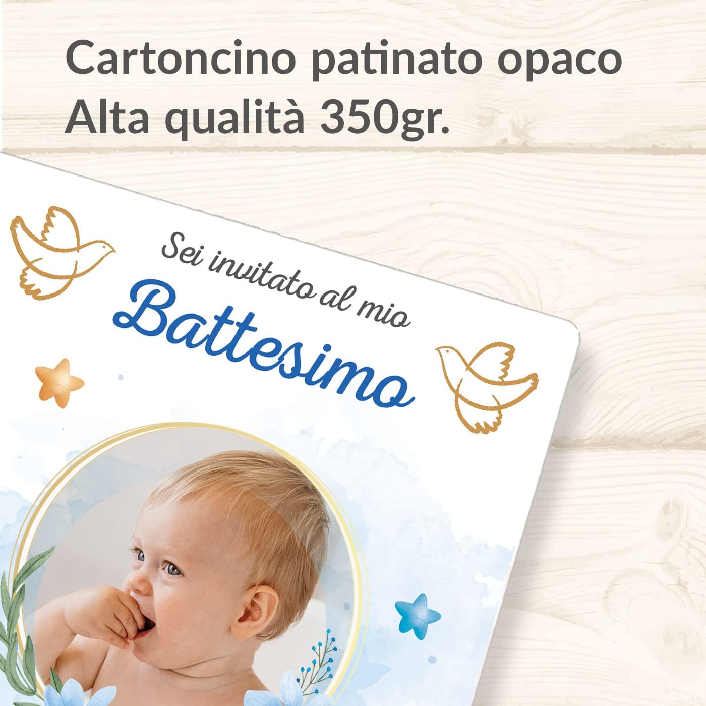 Inviti di Alta Qualità su cartoncino patinato opago da 350 gr. Misura 10cm x 15cm con angoli arrotondati Scelta della quantità da 16 pz a 48 pz. Possibilità di scelta delle buste - Alta qualità Possibilità di scelta del formato digitale per l'invio sui Social Rigorosamente prodotto Made in Italy 100%