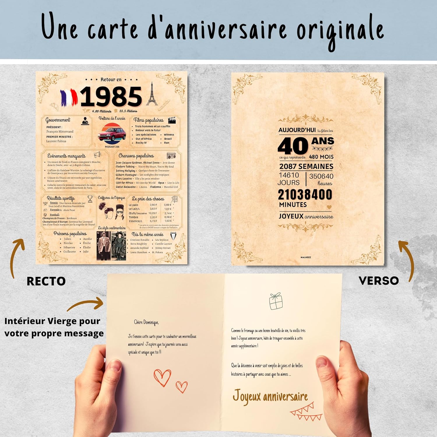 【40 anni! Un'occasione così speciale...】Ci sarà una festa, candele, una torta e ovviamente una decorazione per celebrare la giornata e un biglietto su cui scrivere i tuoi pensieri e desideri per la persona amata. Il nostro biglietto "back in 1985" è il regalo ideale che sicuramente piacerà alla persona amata e la farà sorridere. 【Regalo originale e personalizzato per il 40° compleanno】 La carta 1985 accompagnerà perfettamente i tuoi regali e porterà un tocco originale e divertente ad una festa di compleanno. È un regalo divertente che contiene informazioni pertinenti e divertenti sull'anno di nascita o sull'anno di matrimonio. 【Una carta piena di attenzioni ed emozioni】 Più di una semplice carta ma un invito a condividere conversazioni divertenti ed emozionanti su eventi e ricordi del passato. Il nostro biglietto d'auguri sorprenderà e compiacerà la persona amata, sia che si tratti di uomini (padre, nonno, fratello, amico, padrino, collega, ecc.) o donne (madre, nonna, amica, madrina, sorella, ecc.). 【Alta qualità】 Il biglietto d'auguri "back in 1985" è spesso e molto robusto. L'interno è vuoto e pronto per essere riempito con i tuoi desideri e ricordi. Il nostro biglietto per il 40° compleanno viene fornito con una busta resistente per la protezione. È un regalo bello, robusto, elegante e commovente che la persona amata potrà conservare per sempre. 【Miglior servizio】 Poiché abbiamo fiducia al 100% nella nostra qualità, se non sei soddisfatto del tuo acquisto, per qualsiasi motivo, contattaci! Ci impegniamo a darti completa soddisfazione fornendoti il miglior servizio possibile.