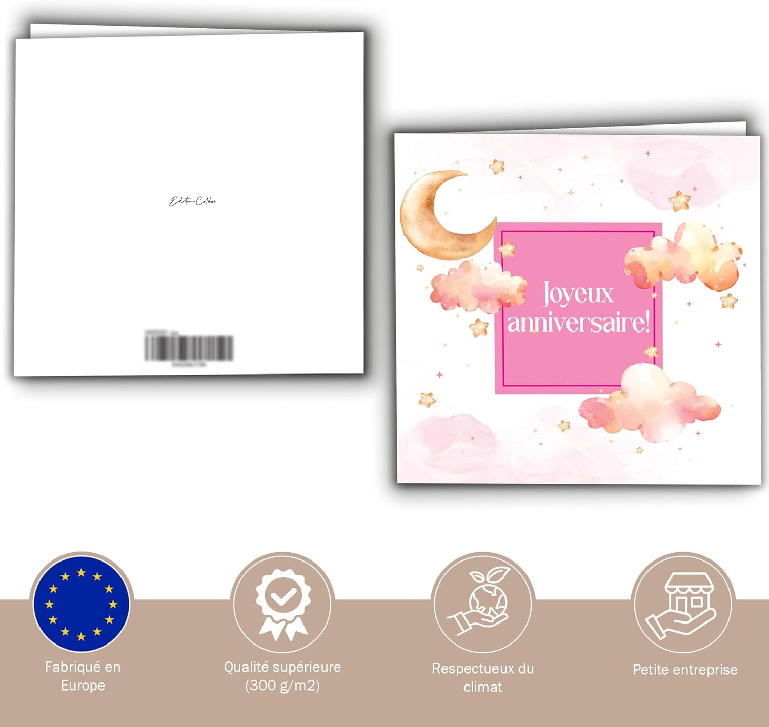 🌙 BIGLIETTO DI COMPLEANNO DA SOGNO: Luna, nuvole e stelle acquerellate in toni pastello – Biglietto dolce e fantasioso per gli amanti delle stelle 📦 CONTENUTO: Un biglietto d'auguri piegato quadrato con busta kraft premium abbinata – ideale per messaggi premurosi. L'interno vuoto offre ampio spazio per parole scritte a mano o tocchi creativi. 📐 DIMENSIONI GENEROSE: design quadrato accattivante (15 x 15 cm): uno stile che si distingue per tutti i tuoi messaggi. Stampato su cartoncino spesso da 300 g/m² con finitura liscia e naturale: durevole e di alta qualità. 🌿 SOSTENIBILE E SOLIDALE: stampato su carta certificata FSC con una busta kraft riciclabile, utilizzando processi rispettosi del clima. Una selezione di prodotti è realizzata in collaborazione con le istituzioni sociali – per carte che hanno cuore e significato. 💛 CHI SIAMO: Ciao, siamo Edition Colibri – una piccola azienda austriaca con un grande cuore. Dal 2012 creiamo articoli di cancelleria illustrati a mano che hanno già deliziato più di un milione di clienti.
