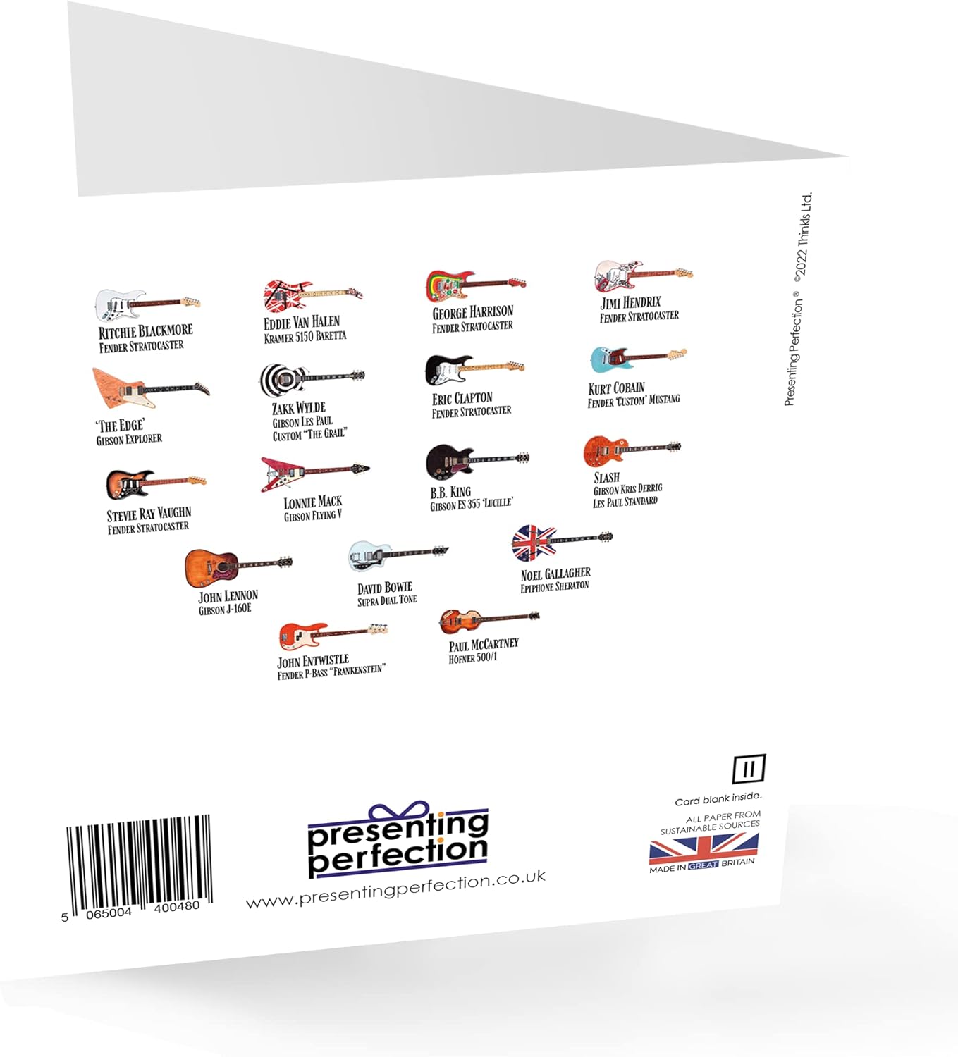 Design: 12 biglietti d'auguri per chitarra rock classica dipinti a mano Dimensioni: 14,5 cm quadrati su carta di qualità da 300 g/m² Prodotto nel Regno Unito, progettato e stampato nel Regno Unito 100% riciclabile: su carta FSC riciclabile di provenienza responsabile e utilizza solo inchiostri vegetali Confezione abbinata: disponibile nel negozio Presenting Perfection, fai clic sul collegamento in "testo blu" sopra Divertimento: guarda il sorriso mentre le famose chitarre sono Glossario: tutti i famosi modelli di chitarra e proprietari elencati sul retro