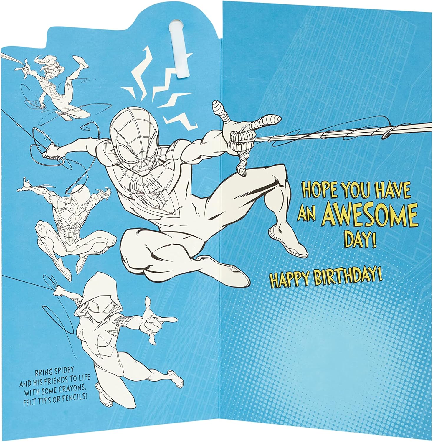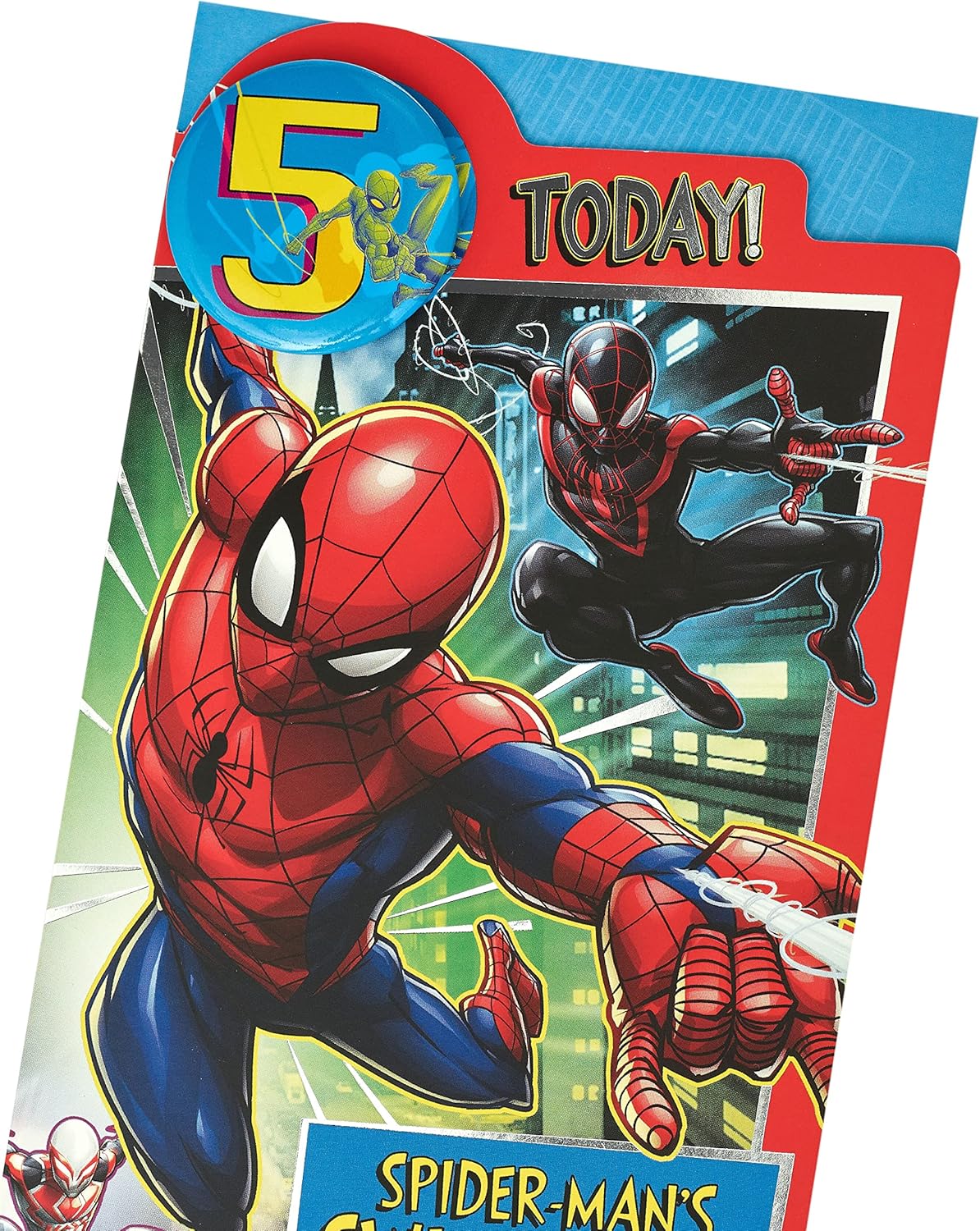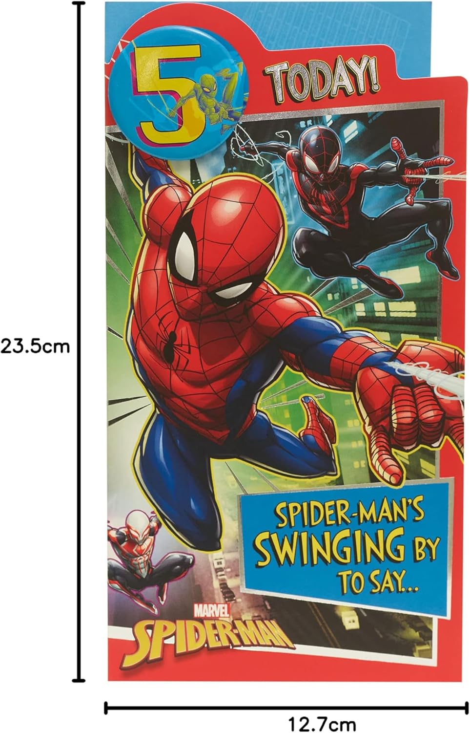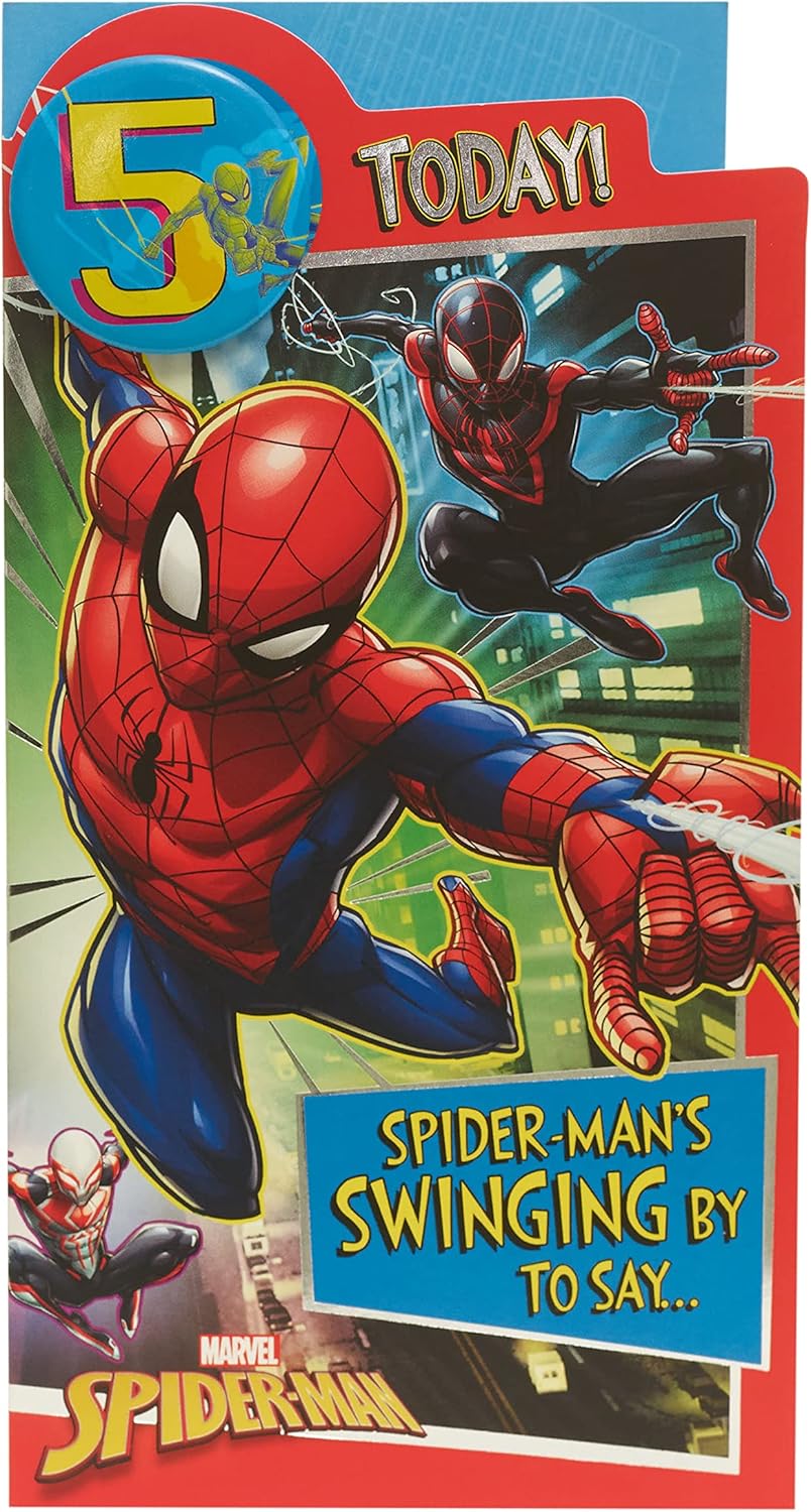 Invia gli auguri per il quinto compleanno del tuo supereroe con questo biglietto Marvel Spider-Man. Viene fornito con un badge e una fantastica immagine di Spidey e dei suoi amici da colorare. Messaggio all'interno: "Spero che tu abbia una giornata fantastica!" " Buon compleanno! Dimensioni del biglietto: 12 cm x 23 cm