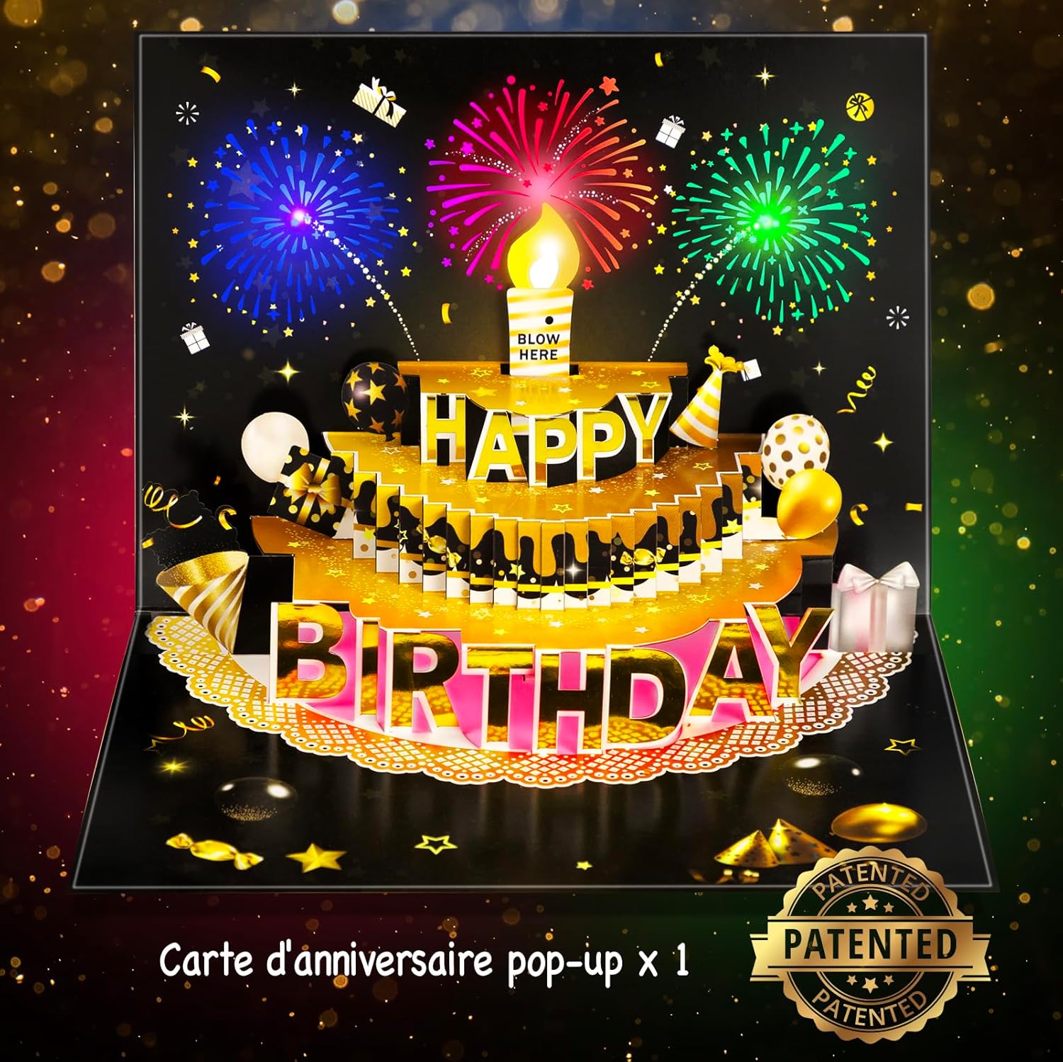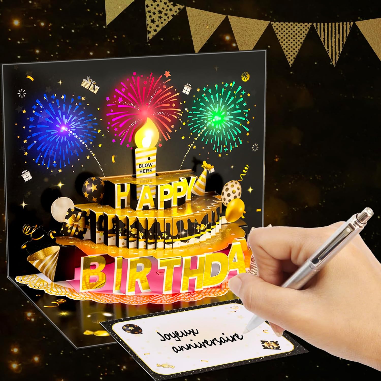 Esalta i tuoi auguri di compleanno: vai oltre i biglietti ordinari e delizia i tuoi cari con questo splendido biglietto d'auguri interattivo 4 in 1. Combina una vivace torta pop-up 3D, un fuoco d'artificio a LED multicolore, una candela calda e luminosa che puoi davvero spegnere e una melodia di buon compleanno. Abbiamo migliorato la luminosità dei LED del 50% e aggiunto il 30% di fuochi d'artificio scintillanti per una celebrazione davvero abbagliante. Una festa indimenticabile in un biglietto: quando il biglietto d'auguri si apre, si svolge una scena magica: la torta di compleanno si illumina, i vivaci fuochi d'artificio a LED danzano in sincronia con 12 secondi di musica "Happy Birthday". Esprimi un desiderio e spegni dolcemente la candelina: risponde con veri applausi e 8 secondi di scintillanti fuochi d'artificio per un momento pieno di sorpresa e gioia. Un regalo che parla dal cuore: più che un biglietto d'auguri, è un ricordo. Perfetto per la famiglia, gli amici o chiunque sia speciale, questo biglietto pop-up unico cattura l'amore e la creatività in un modo che apprezzeranno. Ogni volta che vedranno le luci scintillanti e ascolteranno la musica, sentiranno il calore della tua attenzione. Tanto spazio per il tuo tocco personale: all'interno di questo biglietto di auguri troverai spazio generoso per scrivere il tuo messaggio sentito. È incluso anche un biglietto d'auguri vuoto separato, così puoi aggiungere parole ancora più personali per rendere la loro giornata indimenticabile. Design pronto all'uso: ogni set include un biglietto pop-up 3D premium (20 x 15 cm), un biglietto vuoto abbinato e una busta di alta qualità. Tutto è pensato per un invio semplice: basta descrivere, sigillare e inviare. Nessun problema extra, costruito per durare: realizzato con circuiti resistenti e alimentato da batterie certificate GCC+UL4200A, questo biglietto d'auguri per uomo è testato per resistenza e prestazioni. Goditi la tranquillità grazie alla durata prolungata della batteria e ripeti le celebrazioni