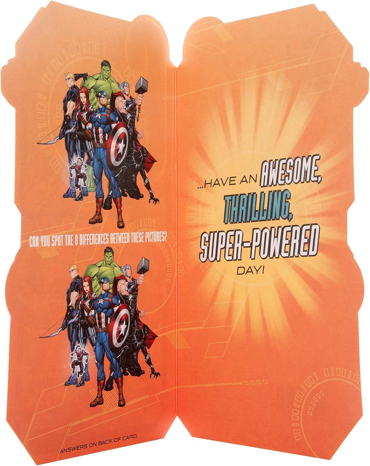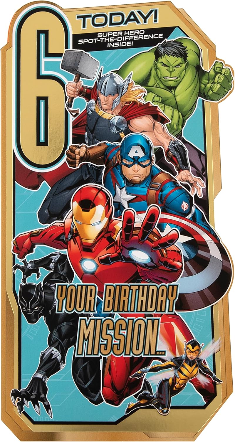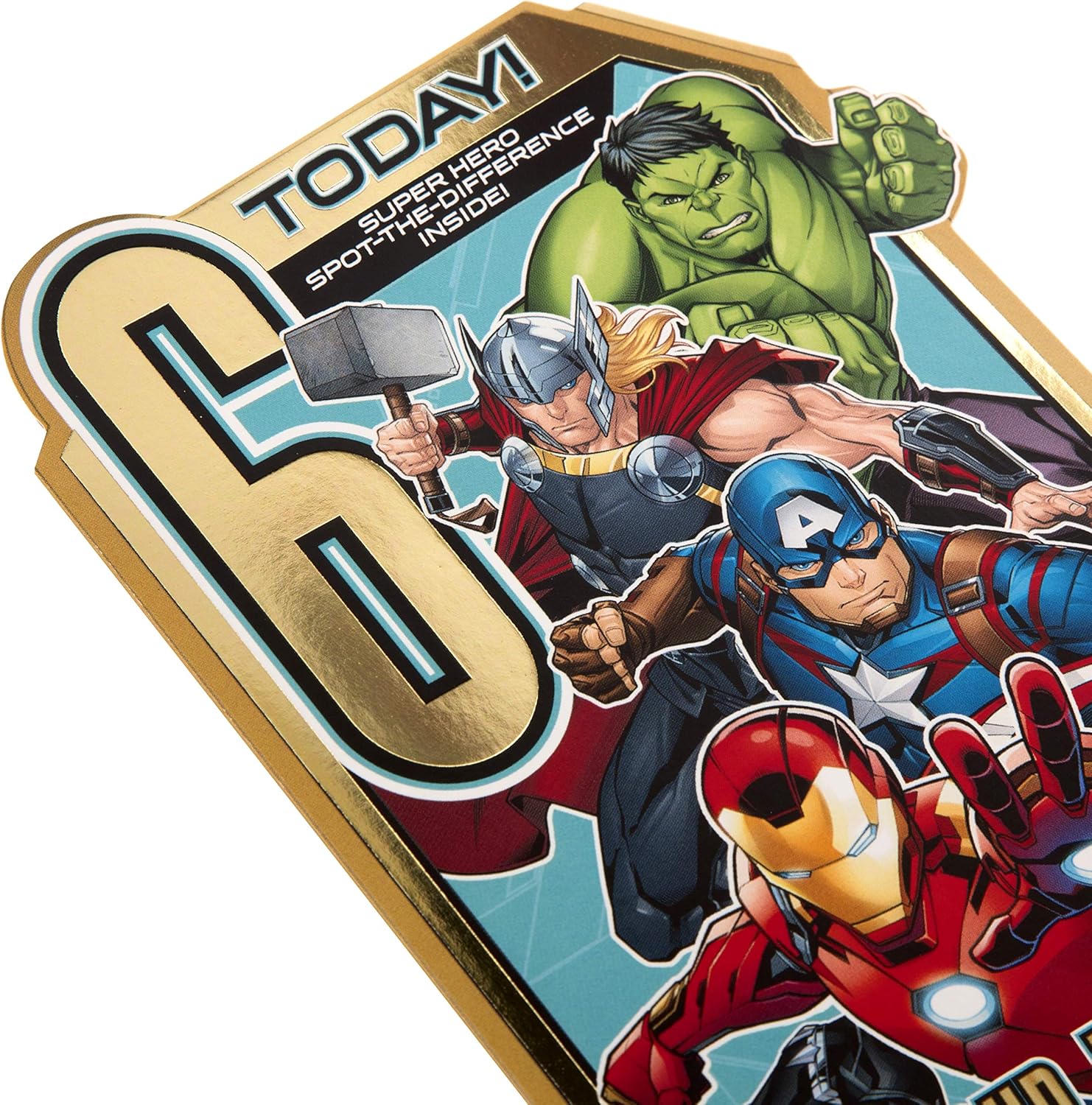 Biglietto per il 6° compleanno: regala al supereroe della tua vita tutti gli epici auguri di compleanno che merita e rendi fantastico il suo sesto compleanno, con questo biglietto per il 6° compleanno MAREL Avengers ricco di azione di Hallmark. Il modo perfetto per celebrare un eroe. Biglietto d'auguri Marvel Avengers: questo biglietto presenta dettagli fustellati, dettagli in lamina d'oro, una divertente attività "Super Eroe Trova la Differenza" all'interno e gli eroi Marvel Hulk, Thor, Capitan America, Iron-Man, Wasp e Black Panther. Biglietto completamente riciclabile e di alta qualità: questo prodotto è completamente riciclabile e realizzato con materiali provenienti da foreste ben gestite, certificate FSC e altre fonti controllate Messaggio ricco di azione: esprimi il tuo desiderio per accompagnare il nostro fantastico messaggio, "... buona, emozionante, super potente giornata!" ". Il modo perfetto per rendere il loro sesto compleanno ancora più speciale e ricco di azione. DIMENSIONE: questo biglietto d'auguri misura 9" di altezza x 4,75" di larghezza ed è la dimensione perfetta per augurare all'eroe del compleanno tanto divertimento. Questo biglietto viene fornito con una busta blu brillante con marchio Hallmark abbinata. Entro i limiti di dimensione standard del Regno Unito.