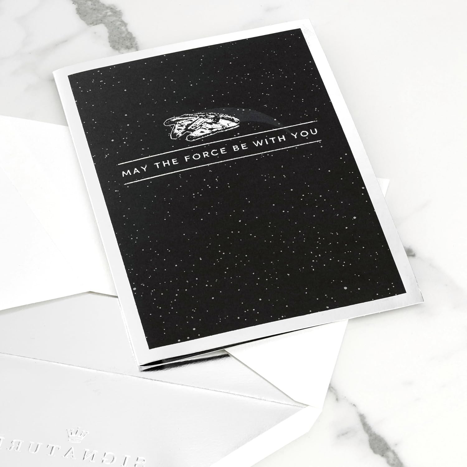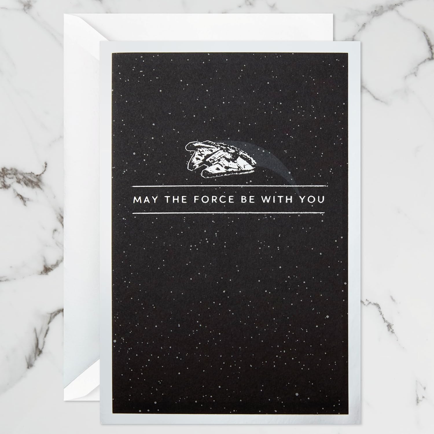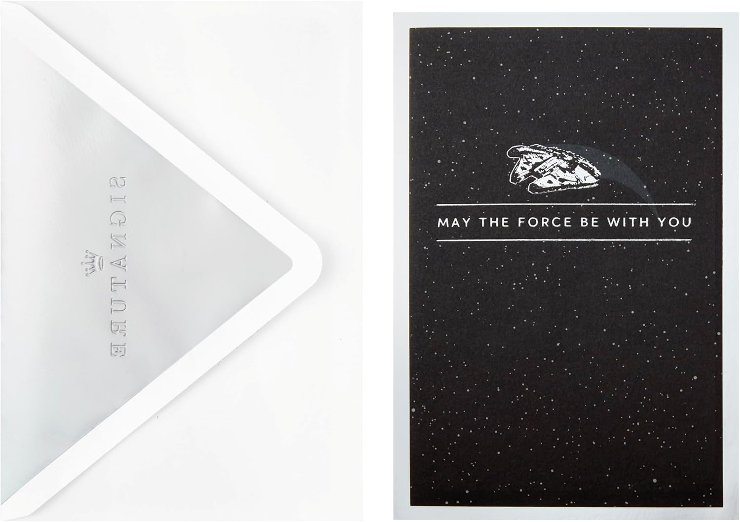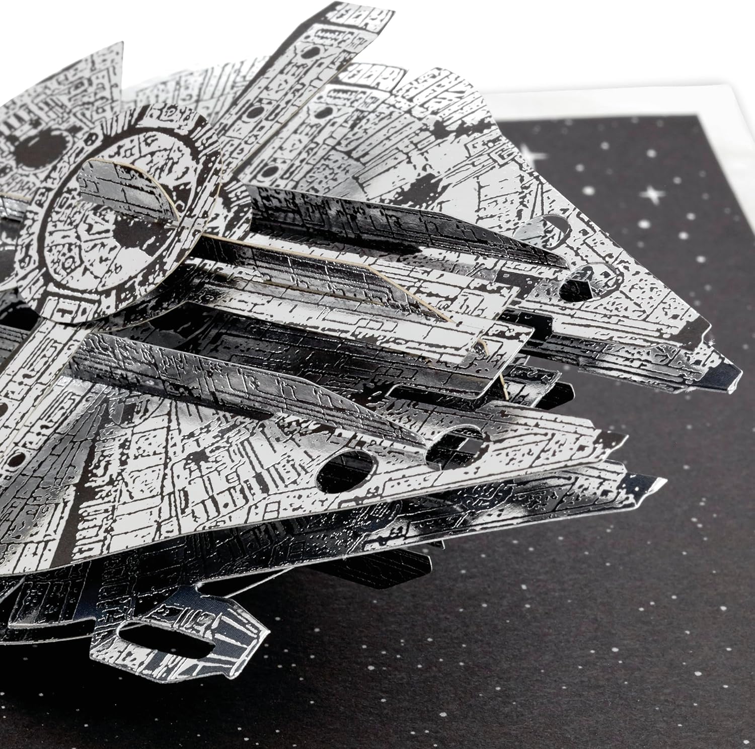 Biglietto di Star Wars per ogni occasione: lasciali con gli occhi stellati con questo splendido biglietto 3D e pop-up di Star Wars per ogni occasione e rendi il loro compleanno, il 4° giorno o la festa del papà memorabili come una battaglia di Star Wars. Biglietto pop-up 3D: basta aprire il biglietto per rivelare un display pop-up 3D dell'intramontabile Millennium Falcon di Star Wars che sfreccia nello spazio. Questa carta presenta dettagli metallici argentati e un design tagliato al laser. Carta premium completamente riciclabile: questa carta è completamente riciclabile e realizzata con materiali provenienti da foreste ben gestite, certificate FSC e altre fonti controllate. MESSAGGIO FANTASTICO: usa la forza per scrivere il tuo messaggio ricco di azione per accompagnare il nostro messaggio a tema Star Wars, "Spero che la tua giornata sia fuori da questa galassia". e festeggia come un ribelle o un Sith ma esci da questo mondo. Dimensioni: piatta, questa mappa misura 11,9 x 17,3 cm e 13,6 x 34,6 x 11,9 cm una volta costruita. Accompagnato da una busta bianca Hallmark Signature abbinata con lamina d'argento, entro i limiti delle dimensioni di spedizione "Lettera grande".