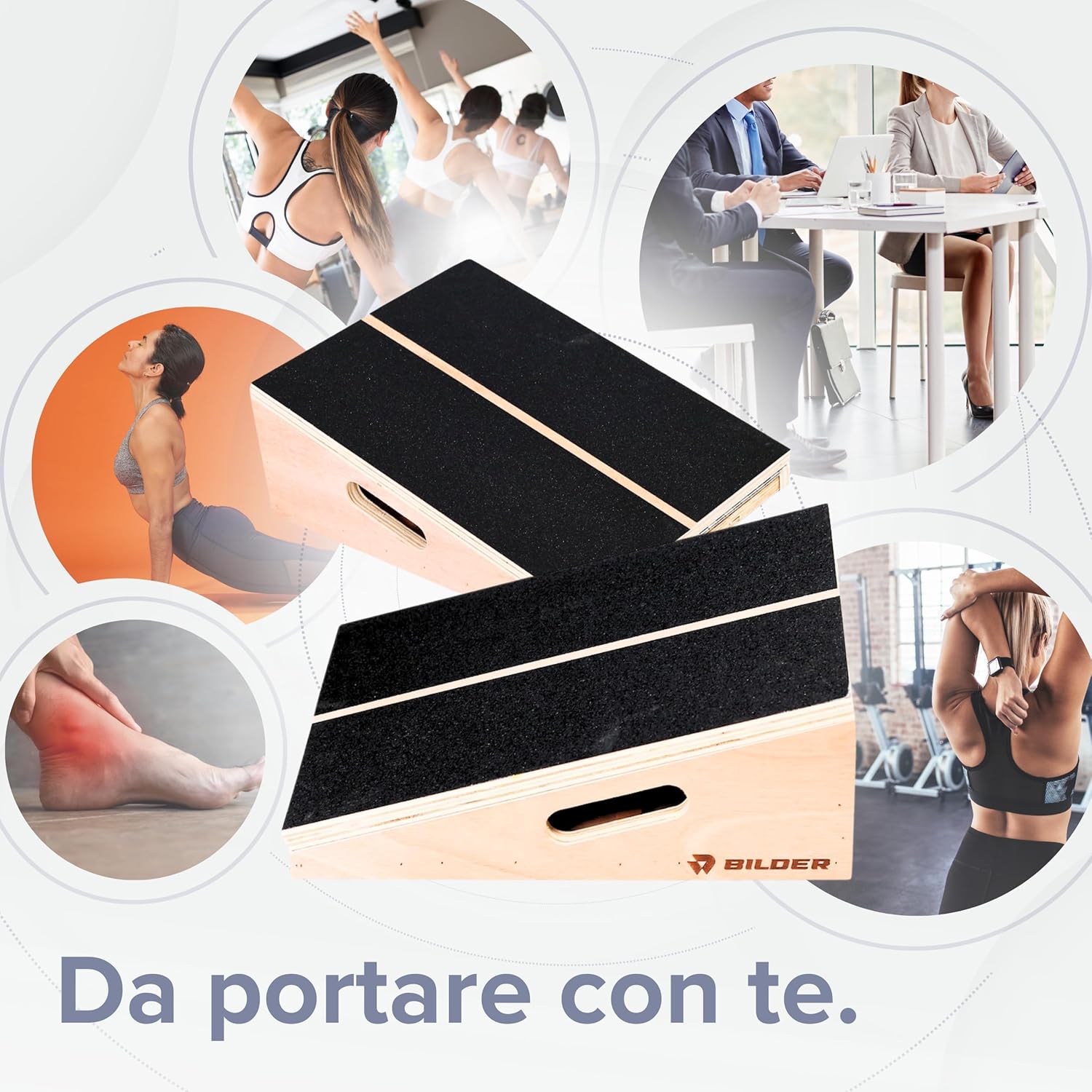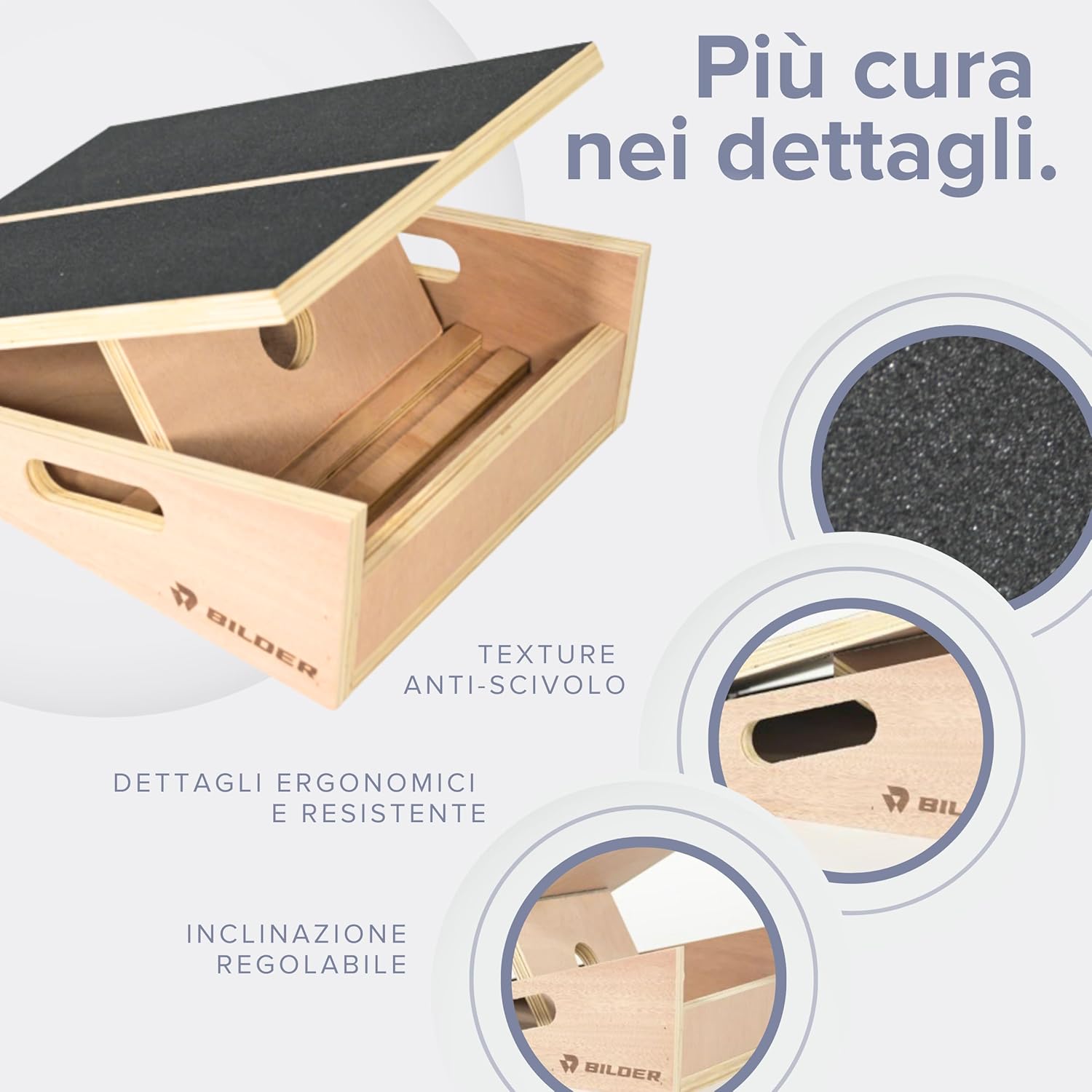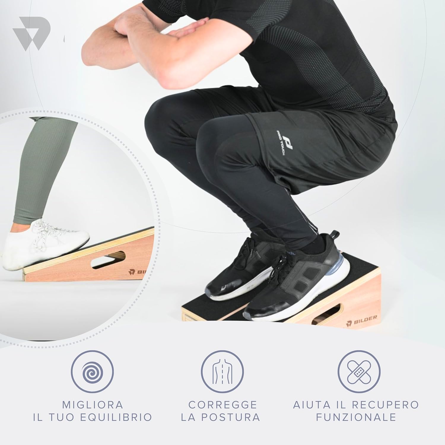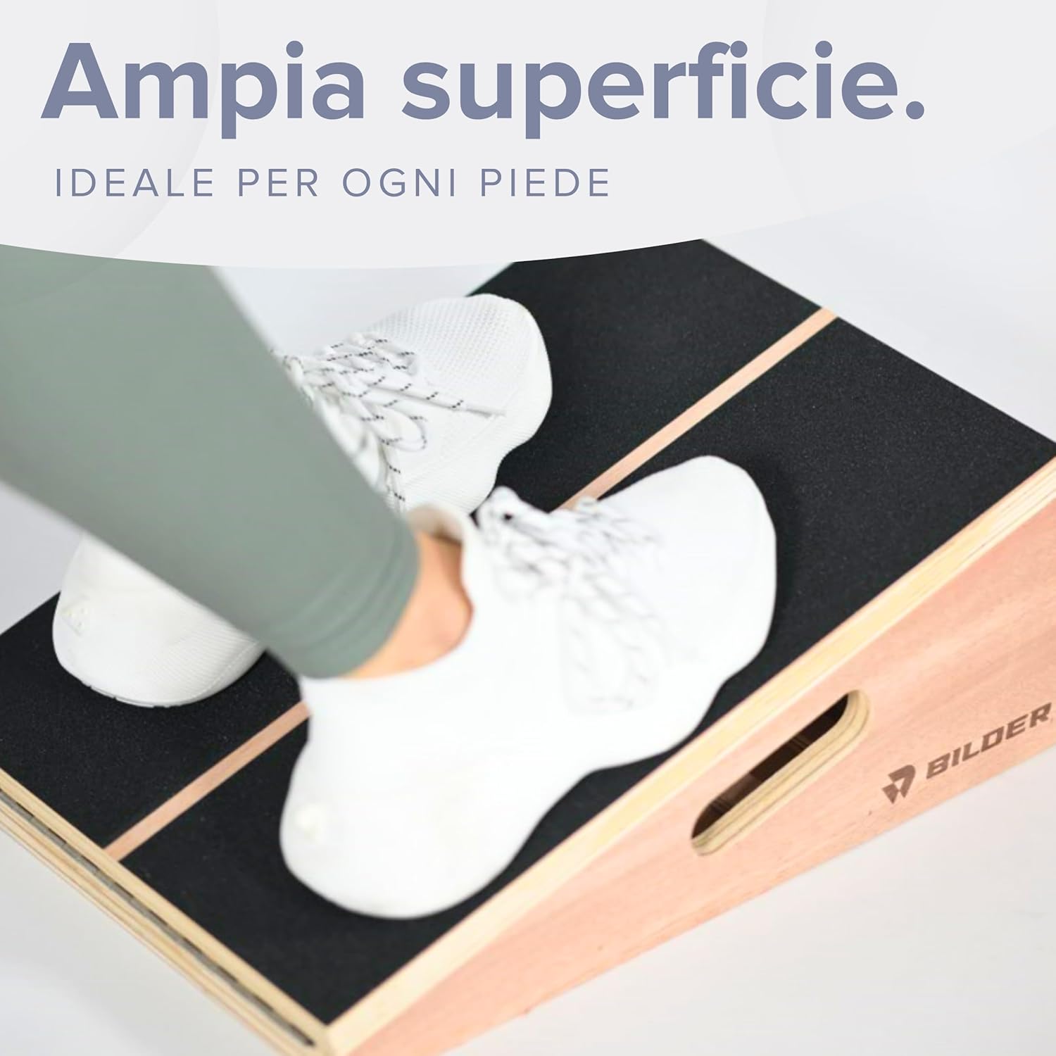 Promuove la flessibilità e il rafforzamento muscolare: Lo Slant Board Bilder è progettato per favorire l'allungamento muscolare e migliorare la mobilità e la postura. Ideale per esercizi di stretching e per rafforzare i muscoli della parte inferiore del corpo, è un supporto essenziale per l'allenamento quotidiano Struttura robusta e superficie antiscivolo: realizzata in legno resistente, la tavola inclinata fornisce una base solida e durevole, garantendo sicurezza e stabilità in ogni esercizio. La superficie antiscivolo migliora la presa, riducendo il rischio di scivolamento e garantendo un supporto affidabile anche durante gli allenamenti più intensi Inclinazione regolabile per tutte le esigenze: grazie alle diverse opzioni di inclinazione, permette di personalizzare l'allenamento in base alle proprie esigenze. Ideale per esercizi di stretching e miglioramento progressivo, adatto a utenti di tutti i livelli, dai principianti agli atleti più esperti. Versatile per diverse discipline: ideale per un'ampia gamma di esercizi, dalla mobilità articolare al rafforzamento muscolare, adatto a programmi di stretching, recupero funzionale, yoga e fitness. Uno strumento essenziale per chi vuole migliorare forza, postura e resistenza muscolare Leggera e facile da trasportare: grazie al suo design compatto, la tavola può essere facilmente riposta e utilizzata ovunque, a casa o in palestra. La leggerezza della struttura permette di integrarlo nella vostra routine di allenamento senza vincoli di spazio o di localizzazione