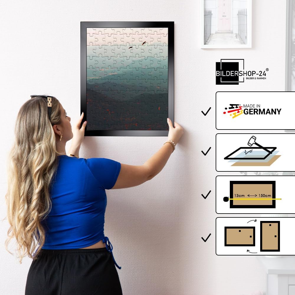 Cornice in stile moderno larga 30 mm con profilo dritto, realizzata in MDF resistente e ricoperta da una pellicola decorativa di alta qualità per una finitura cromatica perfettamente liscia e da un vetro acrilico Incluso pannello posteriore in MDF con perni di piegatura e ganci in formato verticale e orizzontale e lastra di vetro acrilico spessa 1 millimetro per un supporto a lungo termine con stabilità ai raggi UV. Telaio in MDF, prodotto in legno, rivestito con pellicola decorativa di alta qualità, a seconda della selezione, opaco e in parte con superficie strutturata Le dimensioni interne della cornice sono le stesse delle dimensioni dell'immagine, in 97 dimensioni e anche come prodotto su misura per poster, immagini, puzzle, tessuti e altri oggetti con uno spessore di 5 millimetri Cornice intercambiabile versatile adatta per puzzle, poster, locandine di film, certificati, stampe fotografiche e molto altro, perfettamente conservata dal vetro acrilico, ideale come idea regalo, adatta a qualsiasi stile ed estetica degli interni, può essere utilizzata orizzontalmente e verticalmente, NESSUN PASSEPARTOUT O FOGLIO INSERTO!
