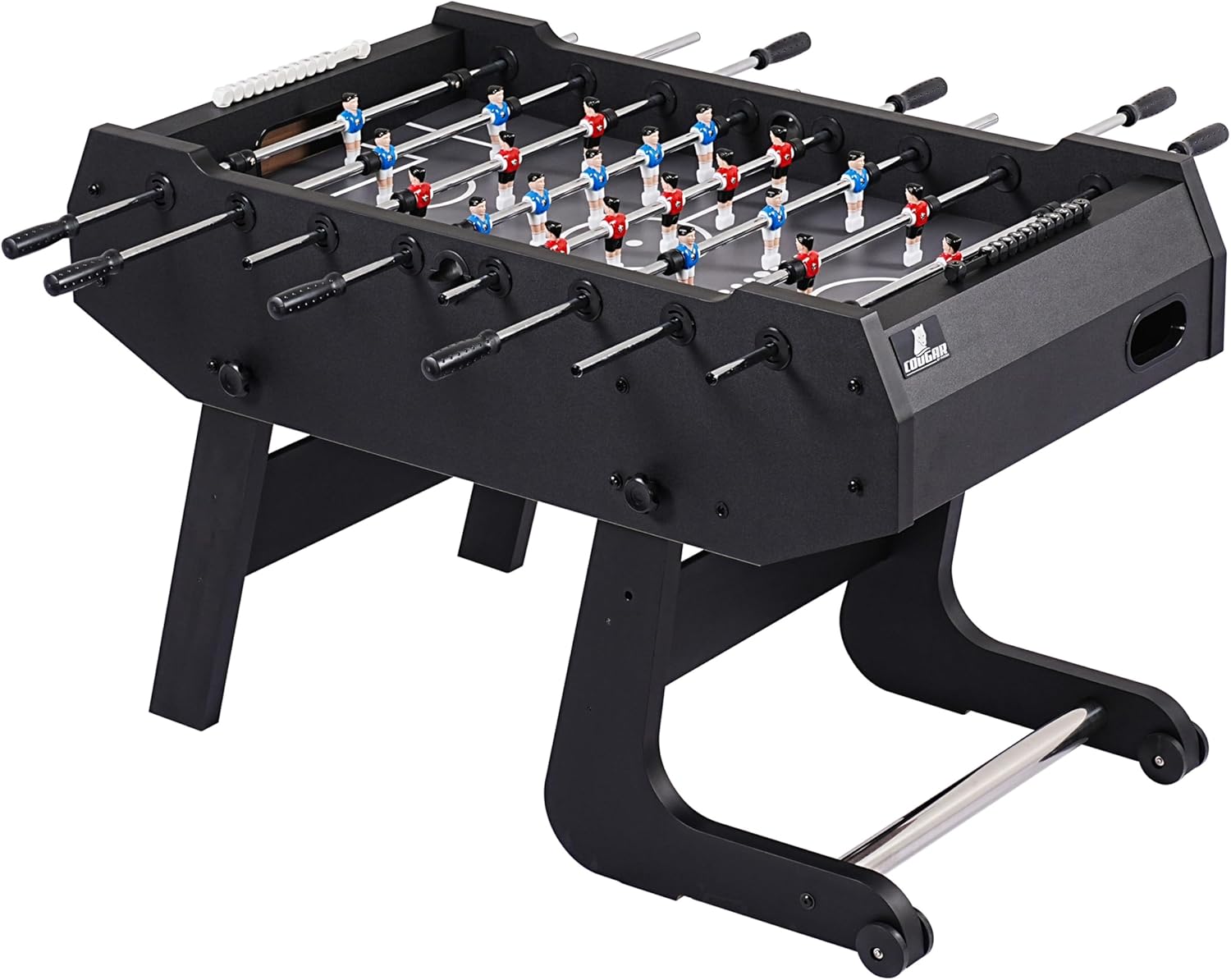 CALCIOBILLINO COMPATTO E STABILE IDEALE PER FAMIGLIE E AMICI: Il calcio balilla Powerkick Pro porta una vera sensazione da stadio nel soggiorno. Che sia per bambini o adulti, è perfetto per 2-4 giocatori e la sua struttura robusta garantisce giochi emozionanti. La resistente superficie di gioco con rivestimento in melammina antigraffio e il supporto stabile garantiscono un divertimento duraturo. DESIGN INTELLIGENTE PIEGHEVOLE E SALVASPAZIO: nonostante la sua struttura stabile, il Powerkick Pro colpisce per l'innovativo sistema di piegatura. Dopo aver giocato, il tavolo può essere facilmente ripiegato e riposto per risparmiare spazio. Questo lo rende perfetto per le famiglie che hanno poco spazio ma non vogliono rinunciare al divertimento del calcio balilla. PALI ROBUSTI ED ELEVATO COMFORT DI GIOCO: Con un campo di gioco di 116,6 x 68 cm e angoli rialzati, la palla rimane sempre in gioco. Le barre in acciaio cromato con uno spessore di 2,2 cm sono notevolmente più robuste delle barre standard e garantiscono una lunga durata. Grazie alle morbide impugnature in TPR puoi godere della massima aderenza e comfort, mentre gli ammortizzatori mantengono la distanza dai bordi del campo. Include 4 palline per un divertimento immediato. DIMENSIONI E PESO: Con dimensioni di 139 x 74 x 88 cm, Powerkick Pro offre spazio sufficiente per giochi emozionanti. Il campo di gioco misura 116 x 68 cm ed è spesso 9 mm, ideale per un gioco preciso e veloce. Una volta piegato, il tavolo occupa solo 74 x 58 x 154 cm di spazio, perfetto per riporlo. Con un peso di 55 kg è stabile e sicuro senza scivolare. Robusto, poco ingombrante e pronto per un divertimento intenso! COUGAR: porta l'emozione di una partita di calcio balilla, air hockey o biliardo nelle tue quattro mura con Cougar! Con i tavoli da gioco di Cougar ore di divertimento sono garantite per grandi e piccini. I nostri prodotti sono realizzati con materiali di alta qualità e sono adatti a bambini (e adulti) dai 5 anni in su.