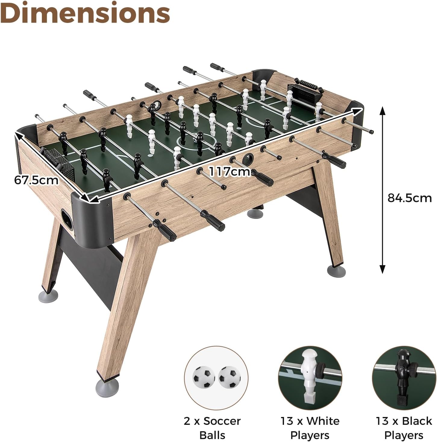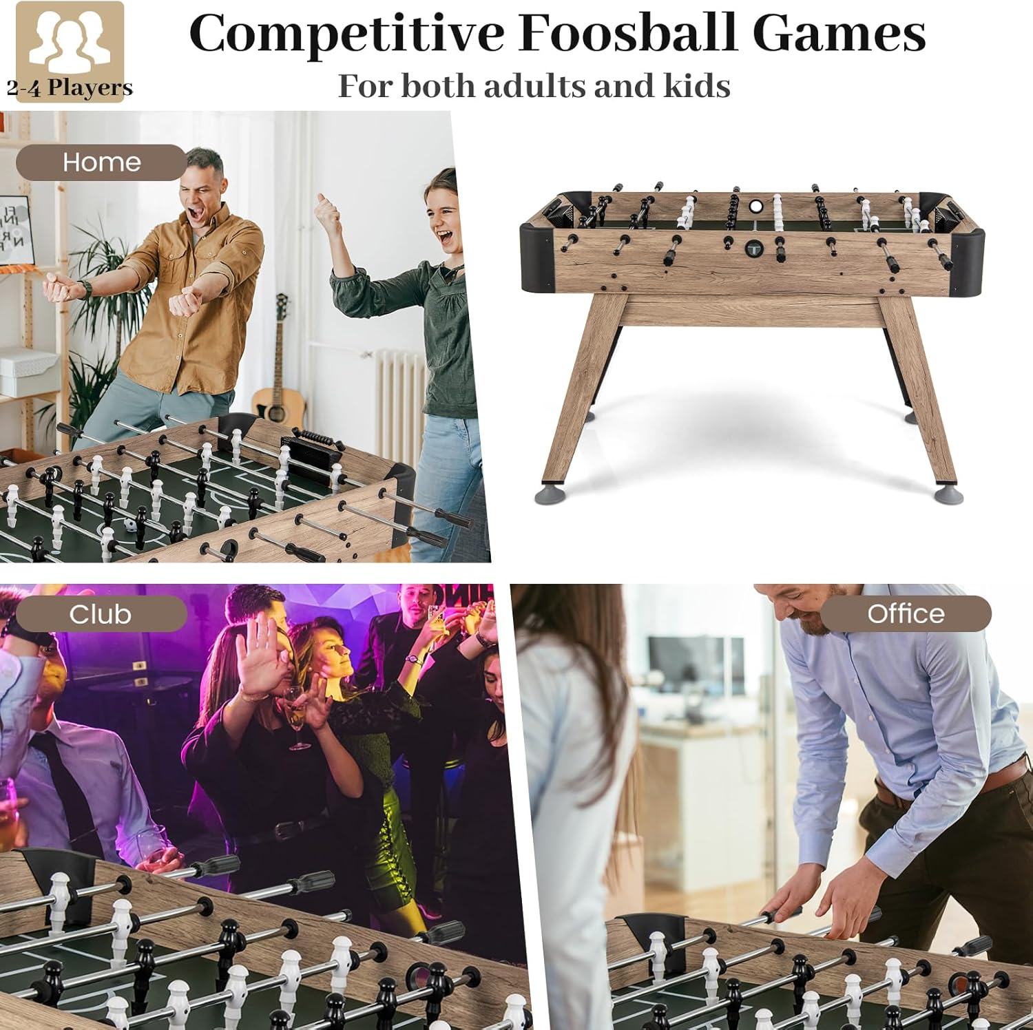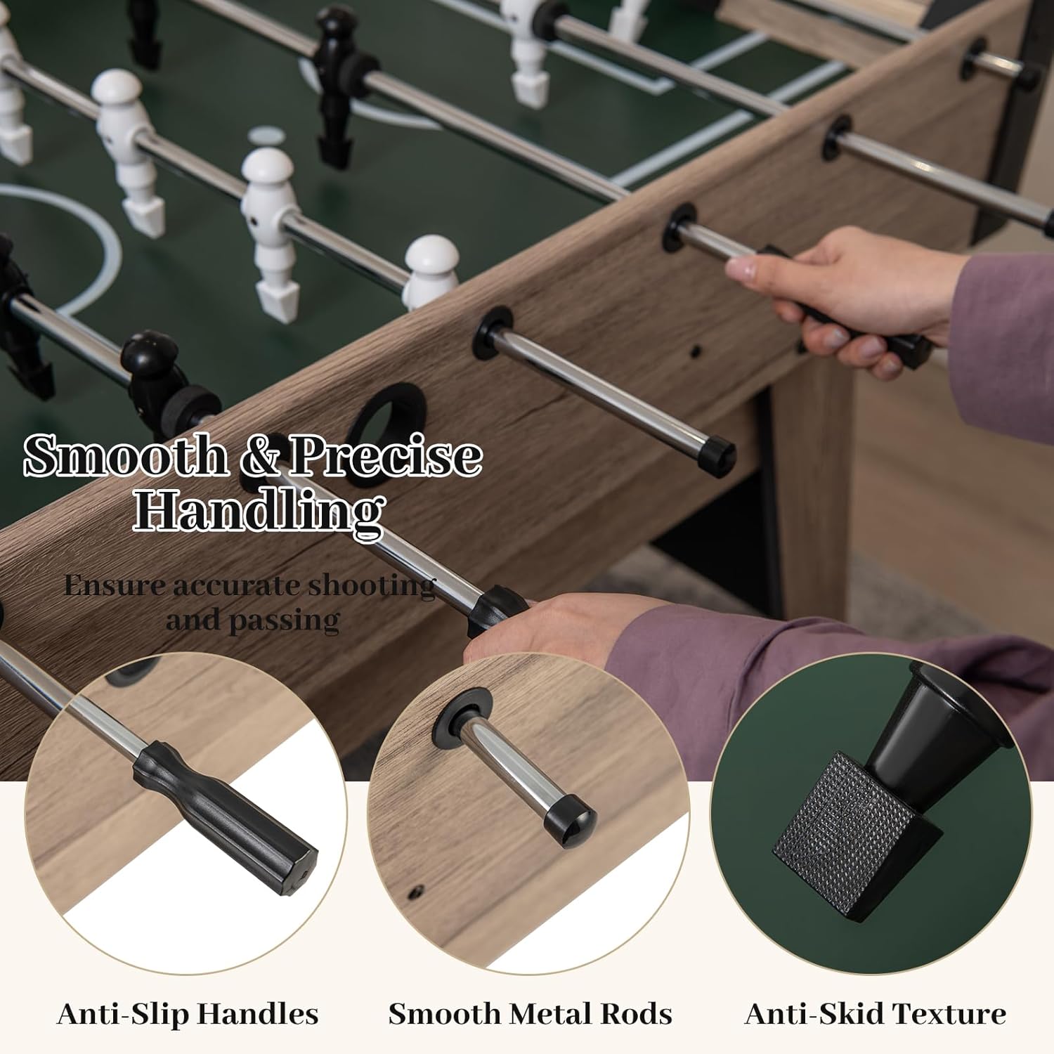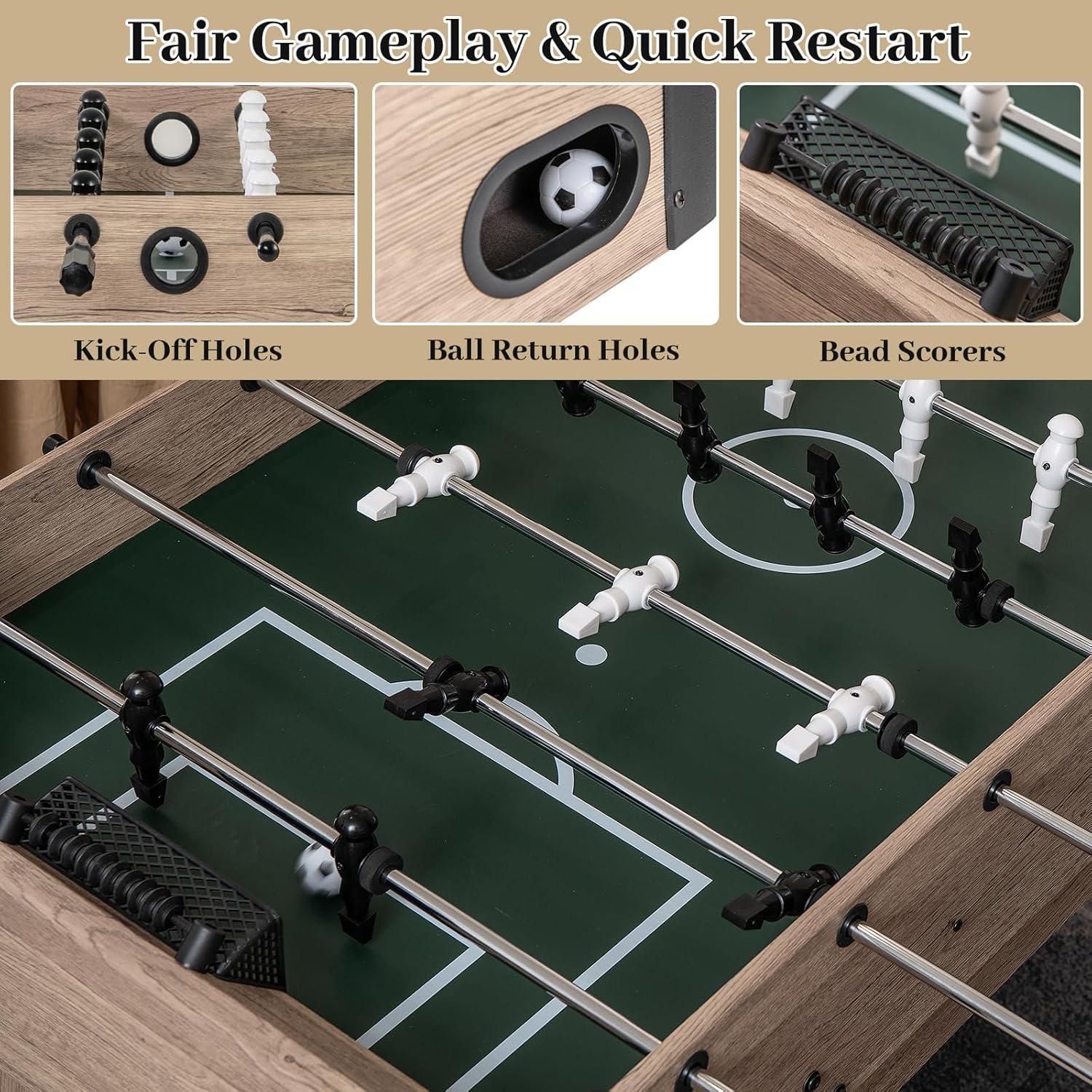 ECCELLENTE ESPERIENZA DI CALCIO: calcio balilla ben progettato con giocatori, porte e lanciatori di biglie per una scena di calcio realistica. Adatto da 2 a 4 giocatori per godersi l'emozione del gioco, con un tabellone spazioso per passare e tirare COMFORT E SICUREZZA NELLA MANIPOLAZIONE: maniglie progettate con cura e barre di metallo lisce garantiscono comfort e sicurezza durante la gestione del biliardino. Il design strutturato della base del giocatore aumenta il controllo della palla e migliora il gioco. COSTRUZIONE STABILE E DUREVOLE: il biliardino è realizzato in materiale MDF per un'eccellente stabilità e durata. La traversa rinforzata migliora la stabilità generale e gli angoli arrotondati prevengono urti e graffi. I livellatori per gambe da tavolo si adattano a tutti i tipi di pavimenti INTERAZIONE DIVERTENTE PER TUTTA LA FAMIGLIA: questo calcio balilla è adatto a bambini e adulti per godersi ore di intrattenimento divertente, sviluppare la coordinazione occhio-mano, la concentrazione e la cooperazione familiare. Adatto a grandi e piccini, offre un'esperienza di gioco varia. APPLICAZIONE IN MOLTI SCENARI: Casa, club, ufficio e altri luoghi sono adatti per assemblare il biliardino, avvio rapido del gioco. Ideale per riunioni di famiglia, feste di amici o intrattenimento in ufficio per aggiungere divertimento a tutti i tipi di eventi
