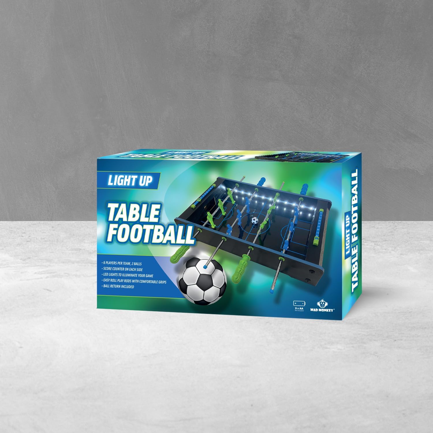 Gioco di biliardino per bambini e adulti: questo biliardino con illuminazione a LED porta il calcio direttamente a casa tua! Si adatta a qualsiasi tavolo, cassettiera o altro tavolo da biliardino realizzato in materiale di alta qualità: il biliardino con illuminazione a LED è realizzato in legno di alta qualità e dispone di aste robuste, maniglie facili da impugnare e figure robuste. È facile da montare e utilizzare e offre spazio per un massimo di quattro giocatori. Che tu stia praticando da solo, gareggiando contro la tua famiglia o organizzando una festa con i tuoi amici, questo biliardino è sempre pronto per un giro di divertimento. Facile da configurare: la cosa migliore del biliardino? Puoi configurarlo a casa in pochi minuti e iniziare subito il tuo primo duello! Basta spingere i pali attraverso i dispositivi e mettere in posizione i giocatori di entrambe le squadre: e il gioco è fatto! Sensazione da stadio a casa: due strisce luminose a LED sono integrate sul bordo del campo per creare una fantastica atmosfera. In questo modo puoi portare a casa la sensazione dello stadio! Regalo perfetto: questo mini biliardino è il regalo perfetto per ogni appassionato di calcio, grande o piccolo che sia. Promuove le capacità motorie, la concentrazione e la capacità di lavorare in gruppo. Questo lo rende un ottimo giocattolo per i bambini dai 3 anni in su, ma anche per tutti gli adulti che hanno anche la passione per il calcio.