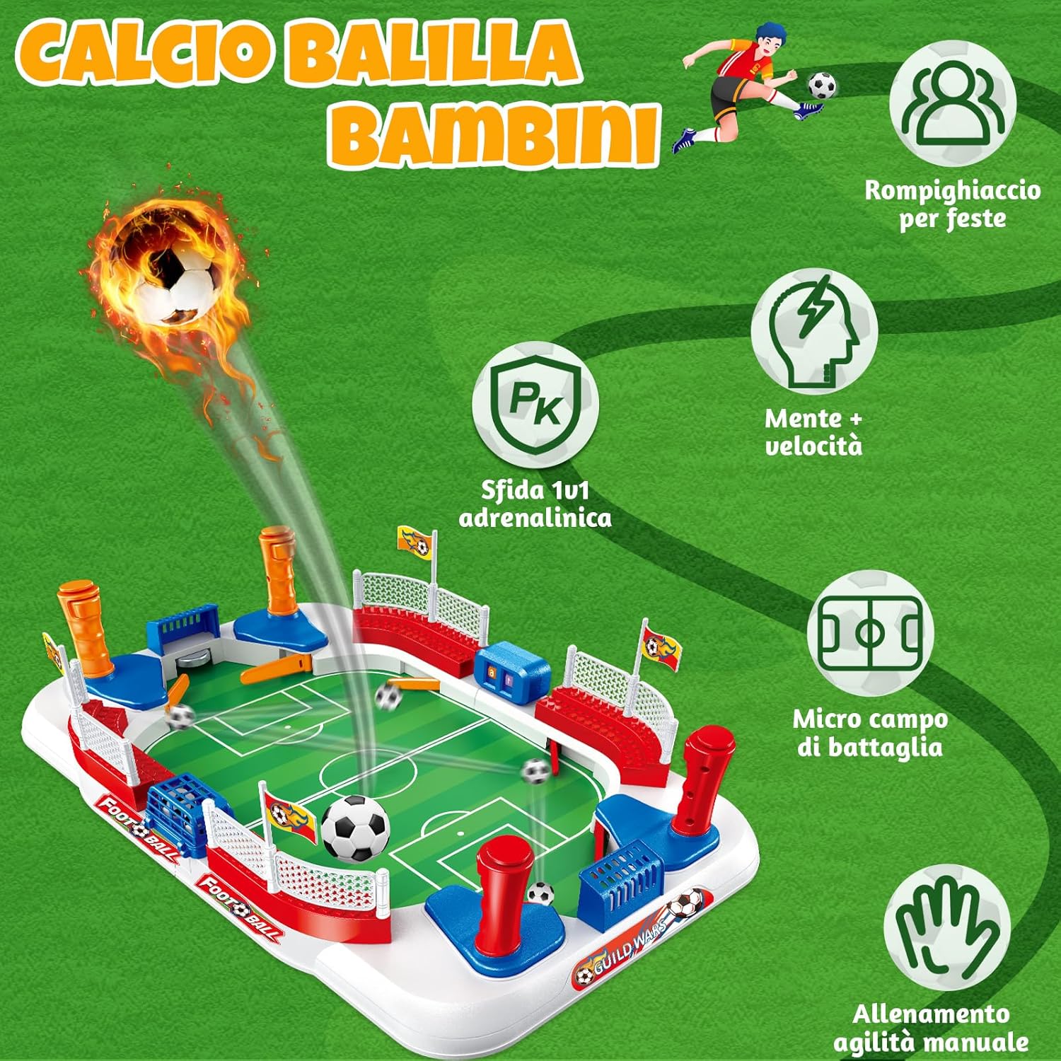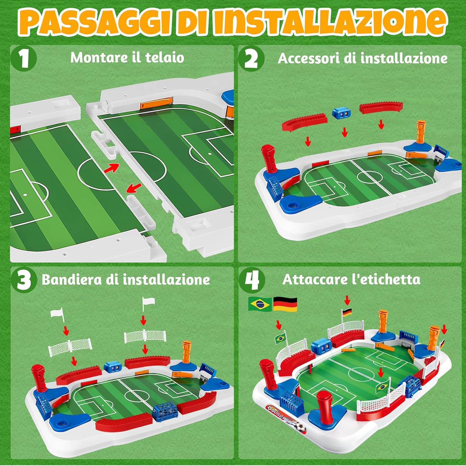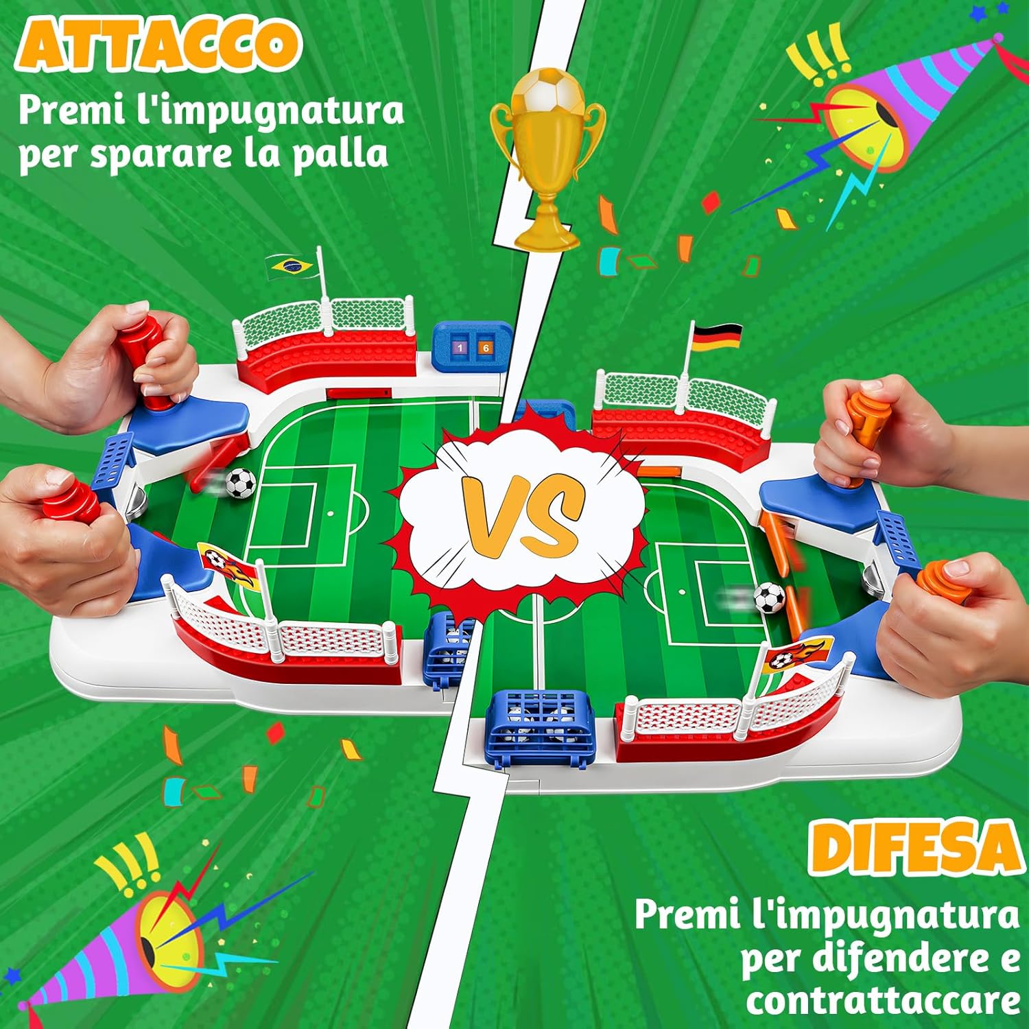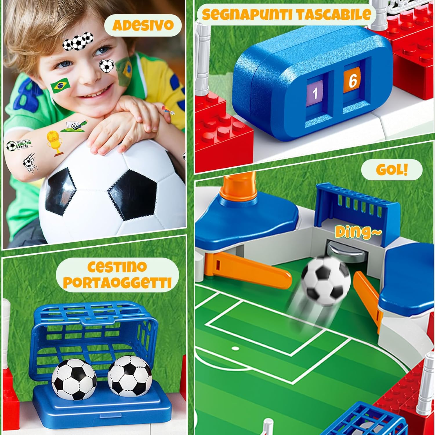 Set Accessori Completo: Il set di Biliardino per Bambini include 6 palloni da calcio, 1 adesivo con bandiere, 1 adesivo casuale da calcio, 1 adesivo con trofei, 1 cesto per palloni, 1 tabellone manuale, 2 porte, 4 bandiere, 4 maniglie e 1 campo da calcio. Tutti gli accessori sono pronti all'uso e non devono essere acquistati separatamente. Basta aprire la confezione e, dopo un semplice montaggio, potete godervi un'esperienza calcistica completa. Materiali di Alta Qualità: Questo Biliardino per Bambini è realizzato con materiale robusto. La sua superficie liscia lo rende molto più facile da pulire rispetto alle versioni in legno. L'inclinazione studiata di 5° fa rotolare la palla come su un vero prato, facendola rimbalzare agilmente e cambiare direzione. Così i bambini si sentono al centro dello stadio e sono completamente coinvolti in questo minigioco di calcio! Facile da Trasportare: Questo Mini Calcio Balilla Bambini misura 55 × 31 × 12 cm e è molto pratico e facile da trasportare. Si adatta su un tavolo normale, permettendo di godersi partite competitive senza occupare troppo spazio. Grazie alla sua struttura a incastro, si assembla rapidamente e facilmente, ideale per campeggi, picnic, feste di famiglia e party. Adulti e bambini possono sfidarsi in qualsiasi momento. Divertimento e Avventura: sotto la porta sono fissati dei campanellini che suonano non appena il pallone entra in porta. Questo dà ai bambini un senso di soddisfazione! I pulsanti sul manico sono facili da usare e consentono di controllare con precisione il ritmo durante i tiri e le difese. Vieni a giocare con i tuoi amici e goditi il divertimento infinito offerto dal mini Biliardino per Bambini. Il Regalo Perfetto: Se volete potenziare la coordinazione occhio-mano e la concentrazione del bambino, questo calcio balilla bambini interattivo è la scelta ideale. Controllando la palla e tirando in porta, i bambini migliorano i tempi di reazione. Regole semplici da imparare, perfette per allenarsi insieme ai genitori! Inoltre, è confezionato in una vivace scatola regalo. Adatto per Natale, compleanni, la festa dei bambini e altre occasioni.