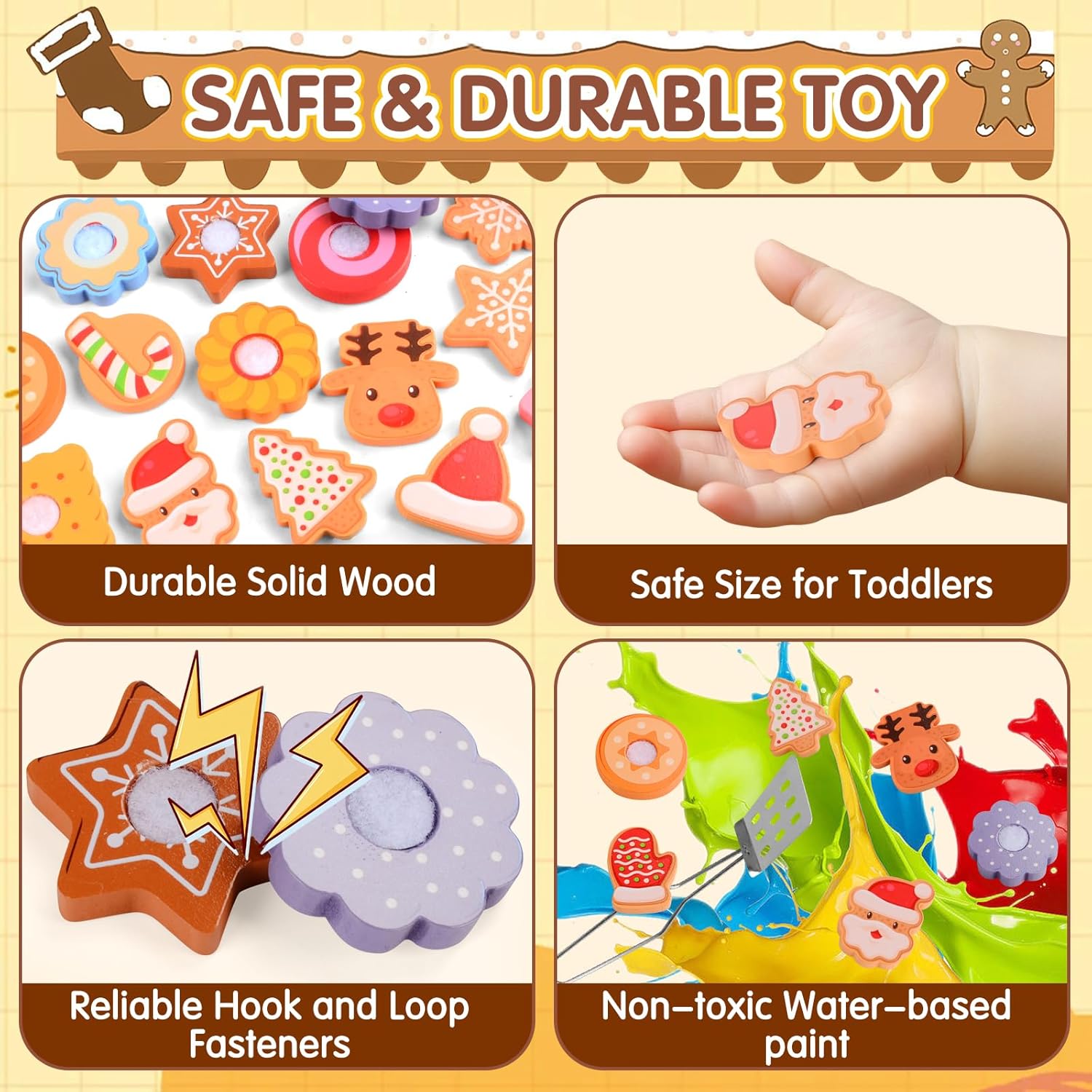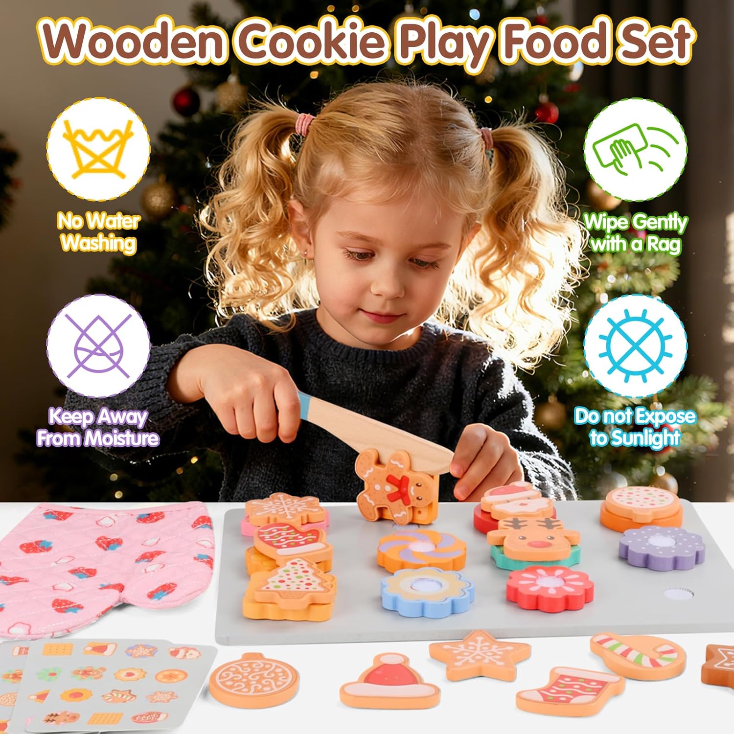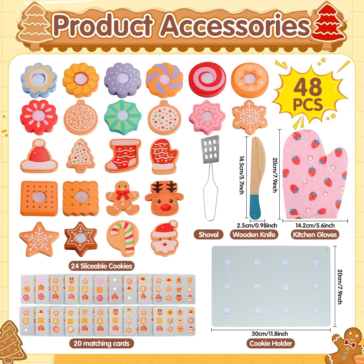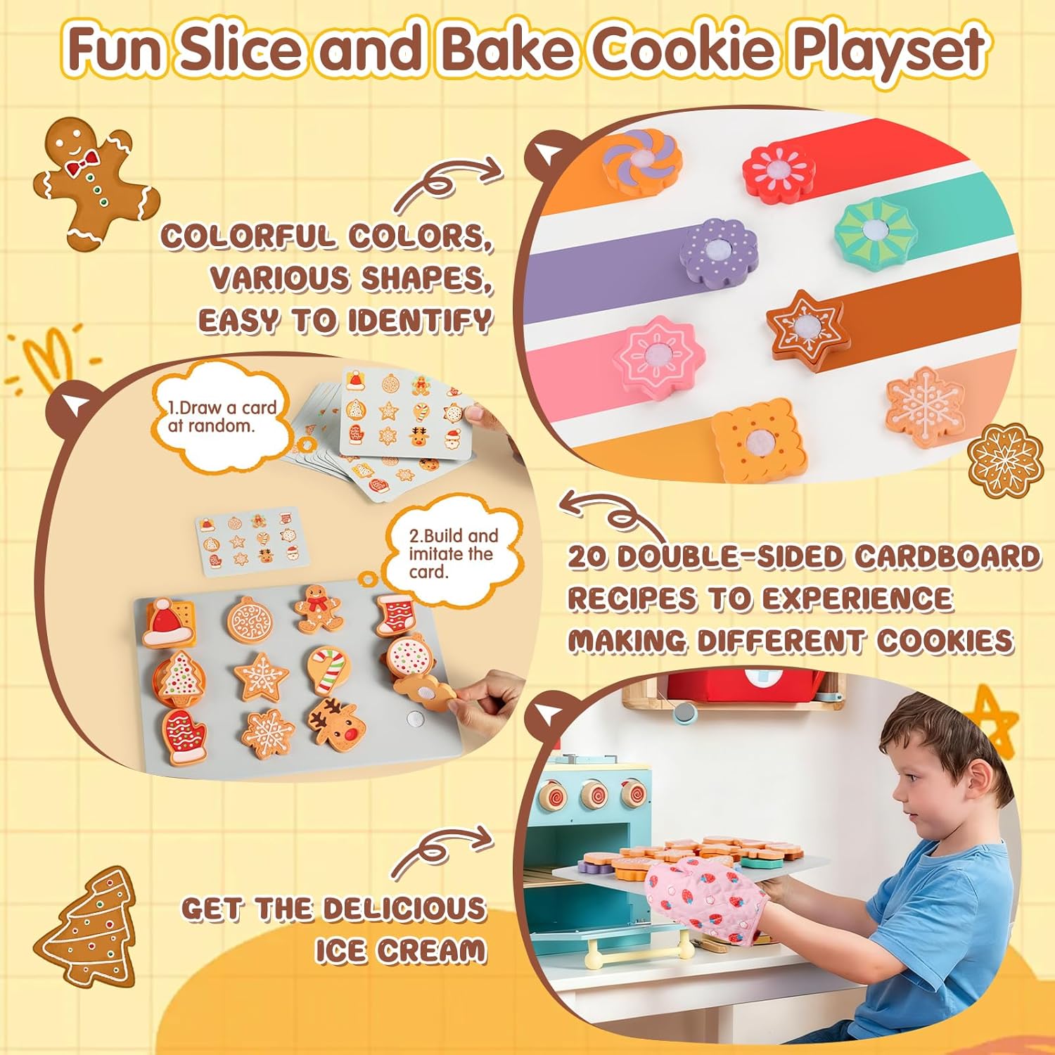 Accessori Cucina Bambini Giocattolo in Legno: il nostro colorato set da gioco in legno per tagliare e cuocere i biscotti include 12 biscotti tagliabili, 12 guarnizioni, un coltello per affettare, una spatola, una teglia, un guanto da cucina e 20 carte abbinabili fronte-retro. Questo set educativo permette ai bambini di fingere di cuocere e decorare i biscotti e persino di abbinare le carte. Giochi di Ruolo Biscotti in Legno per Tagliare e Cuocere: il set di biscotti in legno offre ai bambini un'esperienza visiva e uditiva realistica. I bambini possono tagliare i propri biscotti croccanti e il suono "croccante" dell'affettatura aggiunge un'esperienza di gioco immersiva! I guanti da cucina inclusi simulano la cottura, promuovendo la consapevolezza e le competenze pratiche sulla sicurezza in cucina e sviluppando la loro immaginazione. Divertimento Giocattolo Educativo Montessori: questo meraviglioso set da gioco per finta cucina è progettato per migliorare lo sviluppo cognitivo, la creatività e le capacità motorie fini dei bambini. Le 20 carte abbinabili fronte-retro incoraggiano i bambini ad abbinare le carte, migliorando la coordinazione occhio-mano e la destrezza manuale. È un giocattolo divertente ed educativo per bambini e bambine dai 3 anni in su. Sicurezza e Qualità: il giocattolo in legno per la cottura dei biscotti è realizzato in legno robusto e resistente con bordi lisci e arrotondati, che lo rendono della dimensione perfetta per le manine dei più piccoli. È colorato con coloranti a base d'acqua ecologici, atossici, inodori e resistenti. I blocchi di legno per alimenti sono saldamente fissati con chiusure in nylon e sono riutilizzabili. Regalo Natale per Ragazzi e Ragazze: questo set di accessori per la cottura dei biscotti da cucina per giochi di ruolo è il regalo perfetto per ogni bambino. Perfetto per feste, compleanni, Natale, feste e altro ancora, questo set da cucina in legno dal design accattivante è un regalo perfetto per bambini e bambine dai 3 anni in su, stimolando il loro amore e il loro divertimento per i giocattoli da cucina per giochi di ruolo.