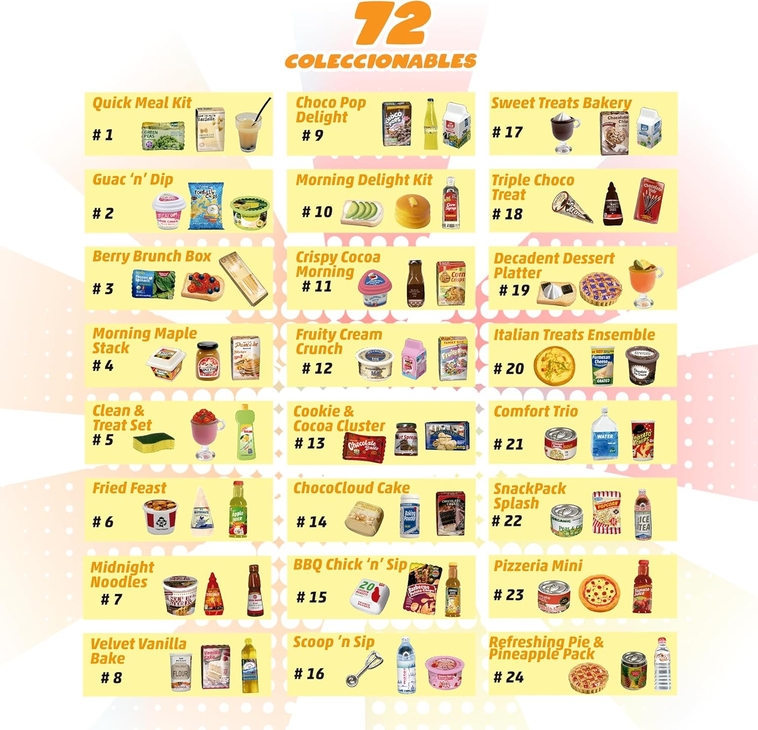 72 mini oggetti da collezione unici: include cibo, conserve e utensili. Capsule a sorpresa emozionanti: Ogni apertura è una nuova avventura. Include taccuino da collezione e adesivi: organizza e decora la tua collezione. Collezionali tutte per decorare il playset della cucina: Dai vita ad ogni angolo. Progettato per ragazzi e ragazze +6 anni