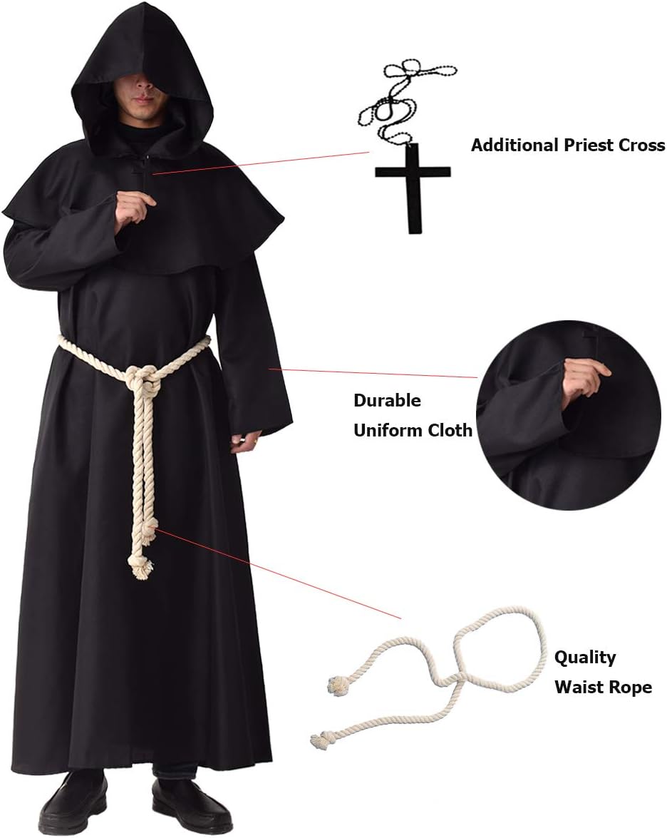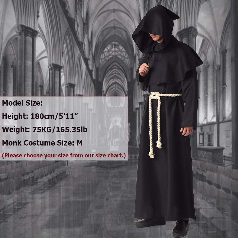 ▶ Il costume da monaco include 1 veste da prete + 1 collana con croce + 1 cappuccio da monaco + 1 cintura di corda. ▶ Il nostro costume da prete è realizzato in poliestere di alta qualità. Traspirante e morbido. 7 colori disponibili. ▶ Perfetto per teatro, feste a tema, Halloween, costumi da uomo Pister, carnevale e carnevale. ▶ Design oversize, nascondi il tuo viso per farti sembrare più misterioso! La corda in vita aiuta con diverse dimensioni della vita. ▶ Selezionare la dimensione corretta in base alla tabella delle dimensioni delle immagini.