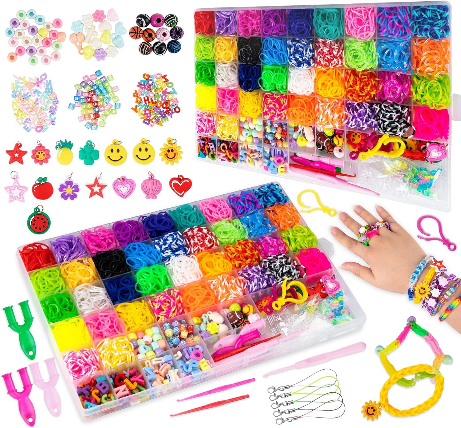 Kit per la creazione di braccialetti ad anello: oltre 3000 anelli tra cui 38 fasce colorate, 15 ciondoli, perline a sfera sportiva (stile casuale), 150 perline con lettere, 25 perline rotonde, 25 fiori, frutti e perline a forma di cuore in totale, 5 clip a moschettone, 3 uncinetti, 3 telai a Y, 2 ganci, 100 clip a S (trasparenti e colorate). Creatività e immaginazione: questo bracciale in gomma può aiutare il bambino a migliorare la coordinazione occhio-mano. Le operazioni ottimizzate e i colori ricchi aiutano a esercitare creatività, immaginazione e abilità di abbinamento dei colori. Materiale di alta qualità: realizzato in gomma altamente elastica, sicuro e durevole. Poiché è realizzato in gomma fresca, potrebbe esserci un leggero odore quando viene aperto per la prima volta. Lasciare all'aria per un po 'per disperdere l'odore. Molto adatto per tessere molti oggetti fatti a mano, come braccialetti fai da te, collane, anelli, braccialetti per orologi. Kit per la creazione di gioielli: ci sono 3 uncinetti per aiutare genitori, bambini e buoni amici a fare e utilizzare insieme. Crea il tuo braccialetto dell'amicizia con lettere e altri accessori. Trascorri del tempo insieme durante il processo, impegnati nella comunicazione emotiva e migliora i sentimenti. Regalo perfetto: il braccialetto di gomma colorato è perfetto come sorpresa. Come regalo di compleanno, Natale, Pasqua, festa dei bambini, feste, Capodanno e altre occasioni importanti.