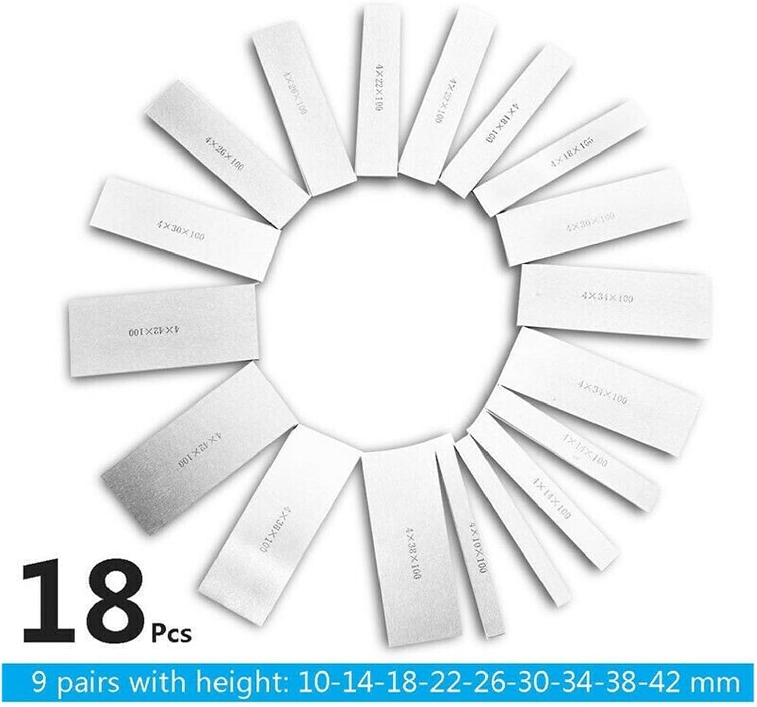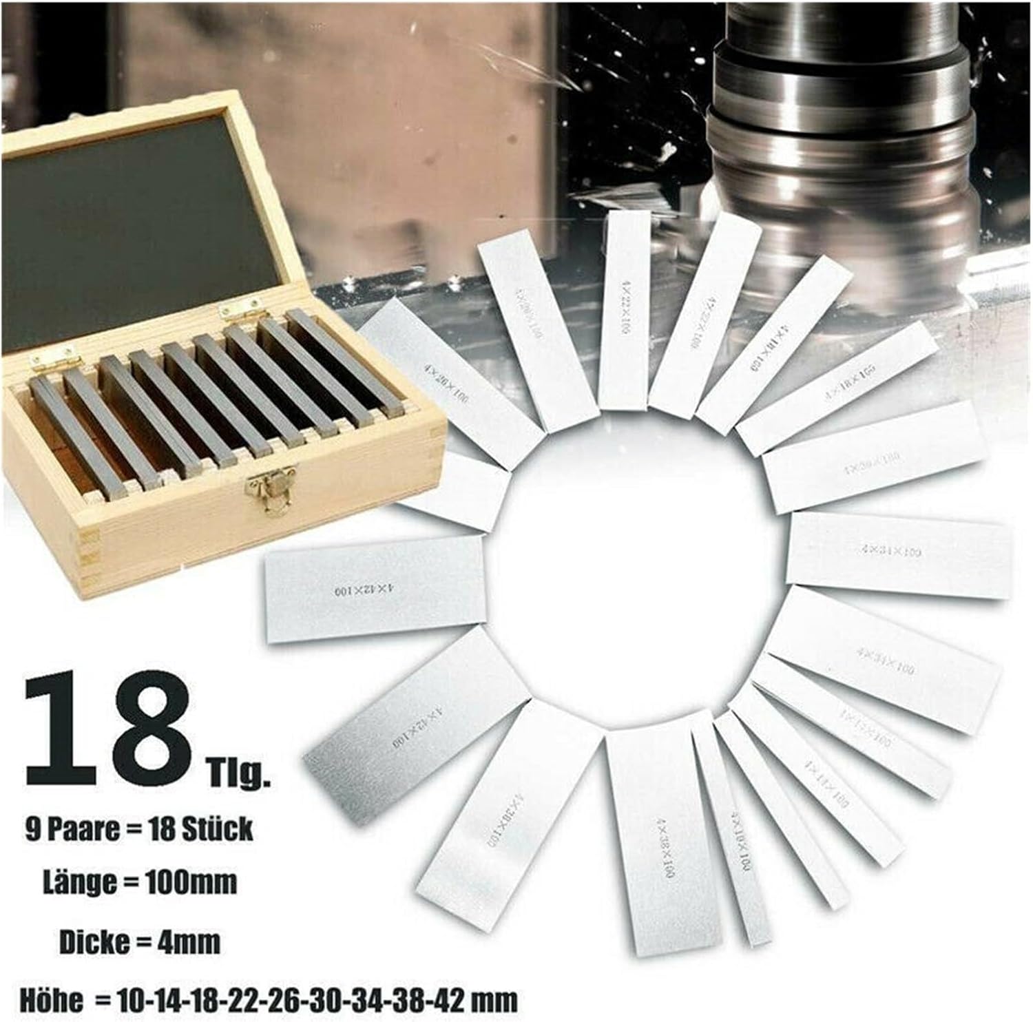 Lunghezza: 100 mm. Spessore: 4mm Materiale: acciaio legato Ideale per diversi utilizzi con morsa, fresatrice e tornio Pattini paralleli fabbricati ad alta precisione. Con una pratica custodia per un facile trasporto.