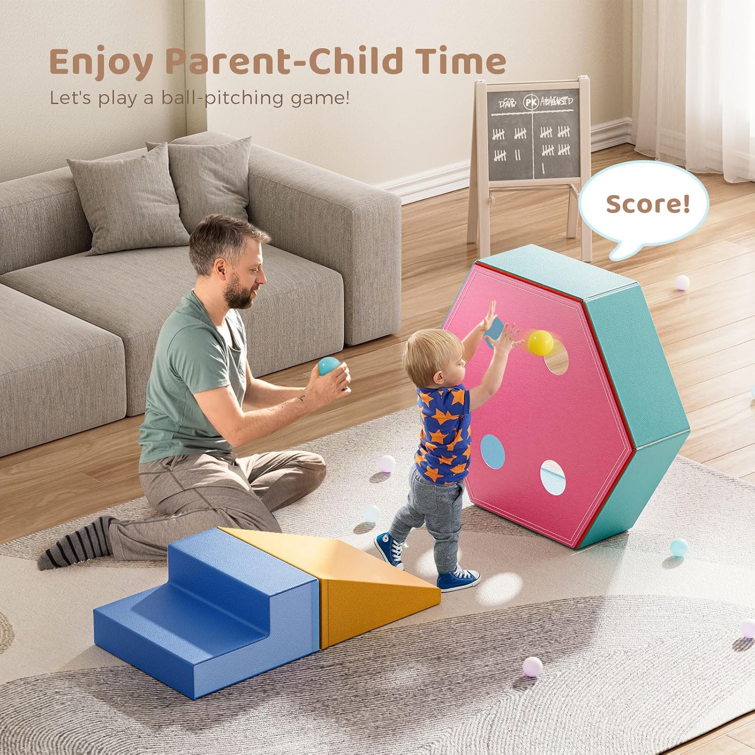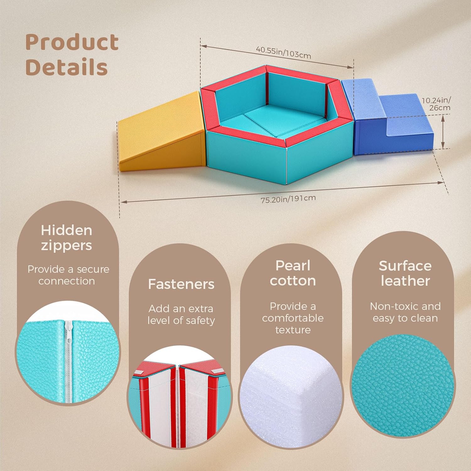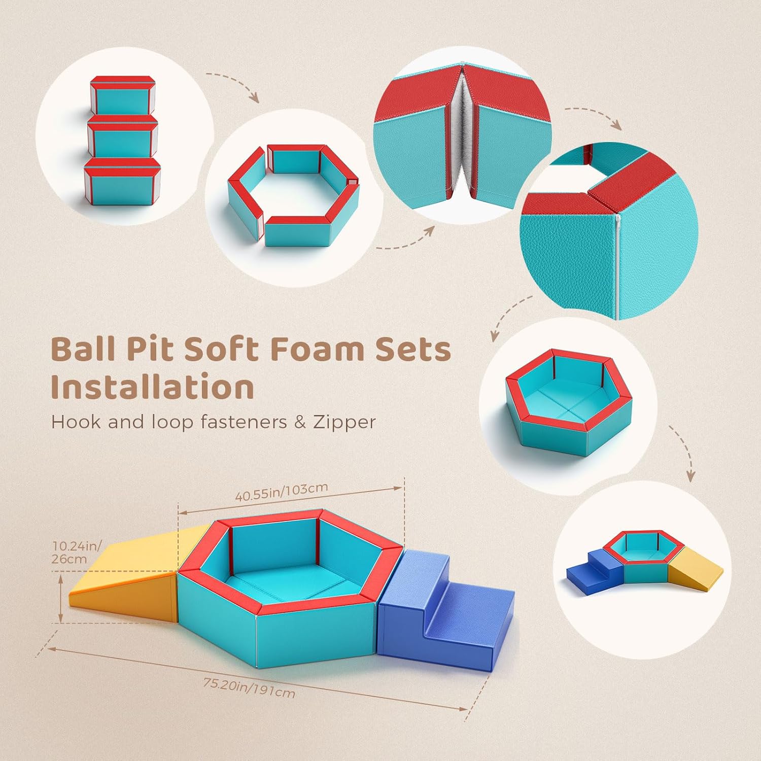 1. Sicuro e divertente per i bambini:Così puoi giocare in tutta tranquillità mentre il tuo bambino si diverte. La piscina di palline esagonale può contenere oltre 250 palline (palline non incluse) e garantisce un'esperienza di gioco colorata ed emozionante. 2. Materiali morbidi e resistenti: il gioco da arrampicata indoor per bambini è realizzato con materiali atossici e inodori. Il rivestimento in pelle è delicato sulla pelle, impermeabile e facile da pulire. La schiuma di cotone perlato, dimensionalmente stabile, offre una superficie di gioco morbida e confortevole. 3. Vantaggi educativi e per lo sviluppo: le nostre attrezzature da gioco morbide offrono molto più del semplice intrattenimento. I bambini possono anche costruire i set in diverse forme, come un ponte monoblocco o un cancelletto, per migliorare la coordinazione occhio-mano, le capacità motorie, la creatività e la consapevolezza spaziale. Gioca con uno scopo! 4. Collegamenti robusti e design antiscivolo: i blocchi da arrampicata si collegano saldamente con cerniere sottili e chiusure a strappo allargate ed estese. Due chiusure aggiuntive garantiscono ulteriore stabilità. Il fondo antiscivolo del set garantisce un gioco sicuro per il tuo bambino. 5. Divertimento sempre e ovunque: la morbida struttura da arrampicata per bambini piccoli misura 190 cm (L x P x A) e offre opzioni di gioco versatili. Posizionala in soggiorno o nella sala giochi e guarda l'immaginazione del tuo bambino prendere vita.