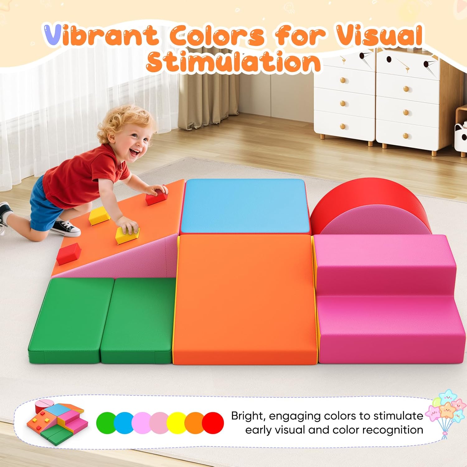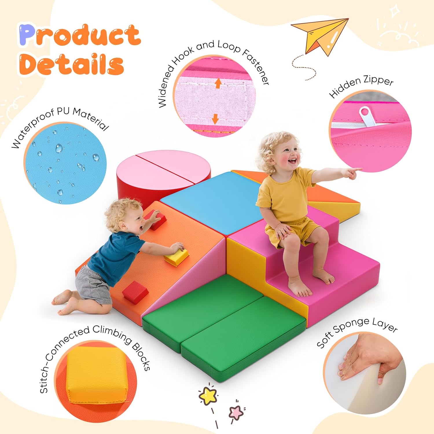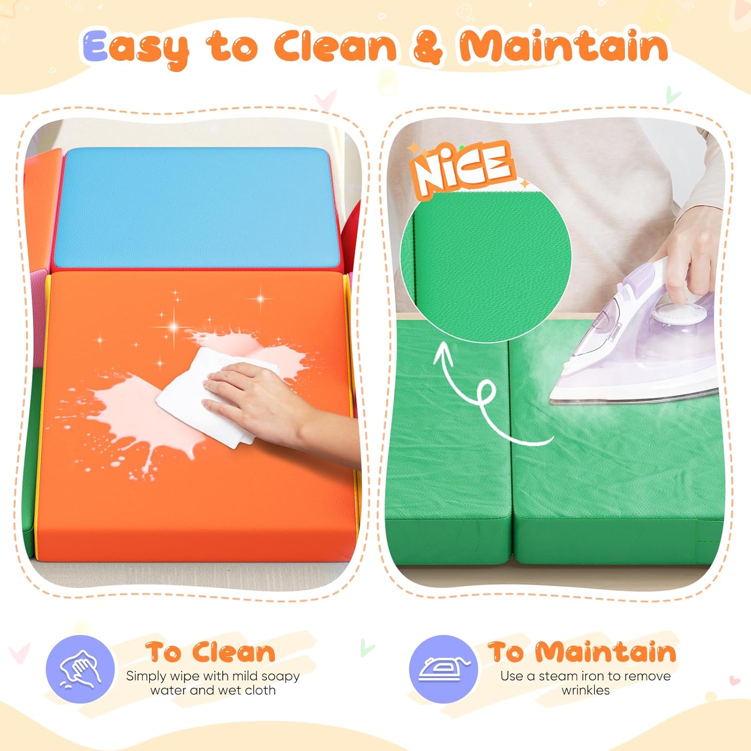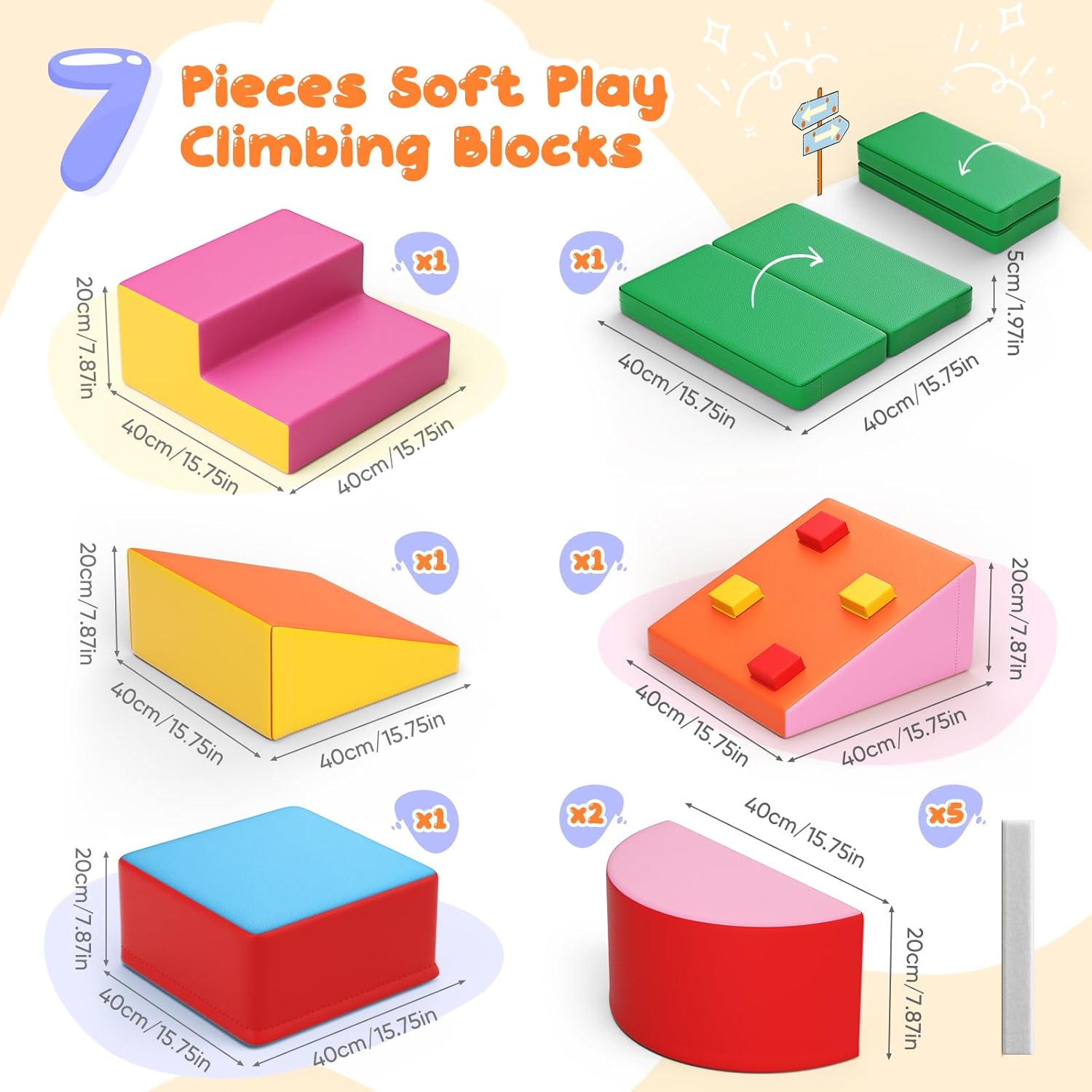 Vantaggi: il set di giocattoli in schiuma Nmoiww aiuta a migliorare l'equilibrio e arricchire la comprensione dello spazio, consentendo ai più piccoli di arrampicarsi, gattonare e rotolare sui mattoncini, promuovere la creatività e le capacità di risoluzione dei problemi dei bambini e offrire un'esperienza interessante e stimolante. Esperienze di gioco per migliorare le abilità sportive e avventure. Buona qualità: i nostri prodotti sono conformi agli standard di qualità europei. Il set di mattoncini è realizzato in cotone perlato ad alta densità per garantire la sua durata e non deformazione. La custodia in pelle PU ispessita è impermeabile e resistente agli strappi, atossica e inodore, delicata sulla pelle e antiscivolo, donando al bambino uno strato protettivo e confortevole. Facile da pulire: se il bambino cade accidentalmente uno spuntino o una bevanda, lo sporco può essere pulito immediatamente. Facile da pulire con un panno, per risparmiare tempo. I blocchi sono inoltre facili da pulire con acqua e sapone delicato. Campo di applicazione: il nostro set di mattoncini in schiuma è leggero, impilabile e non occupa molto spazio. È molto adatto per asili, famiglie, centri commerciali, supermercati, ristoranti, ecc., Per costruire parchi giochi al coperto per attirare l'attenzione dei bambini. 【Garanzia】I nostri prodotti sono coperti da una garanzia di 2 anni. Potete essere certi che i nostri grandi giocattoli da costruzione accompagneranno la crescita del tuo bambino.