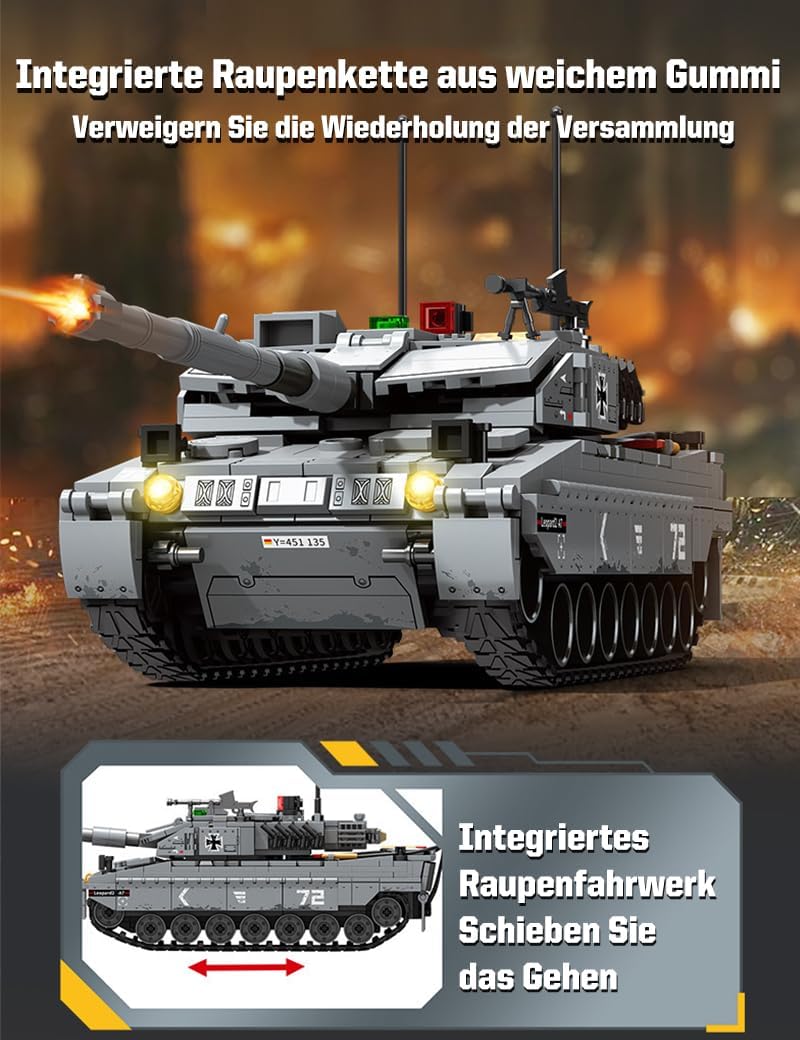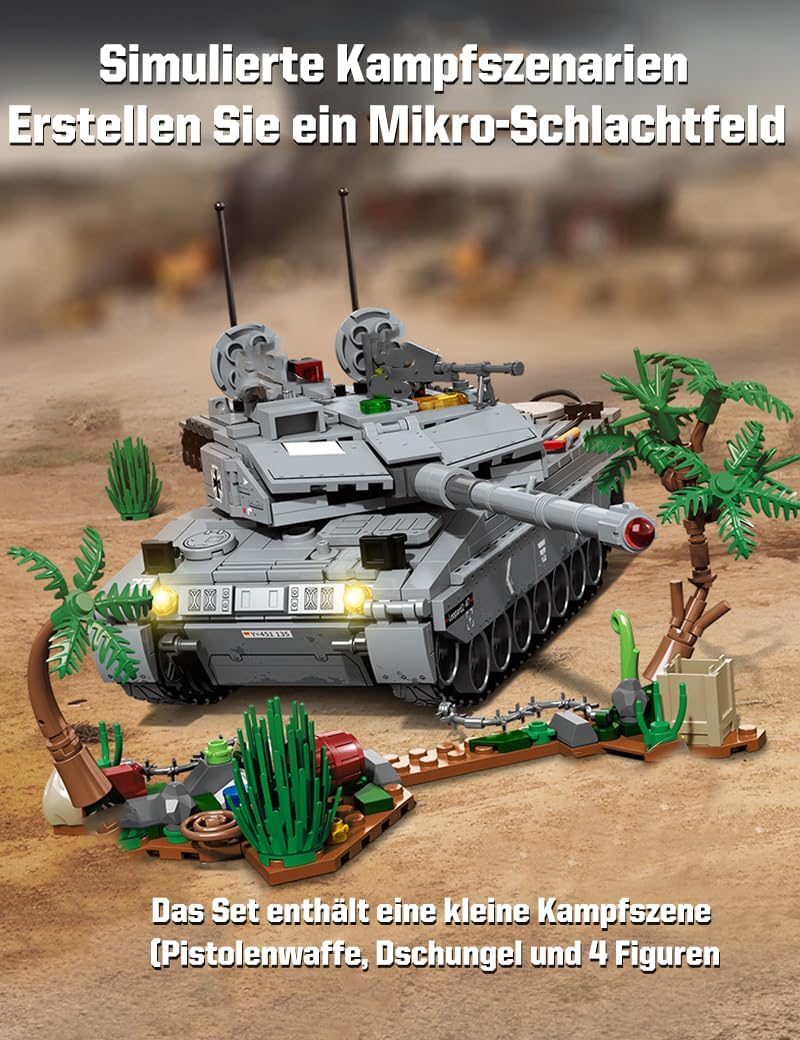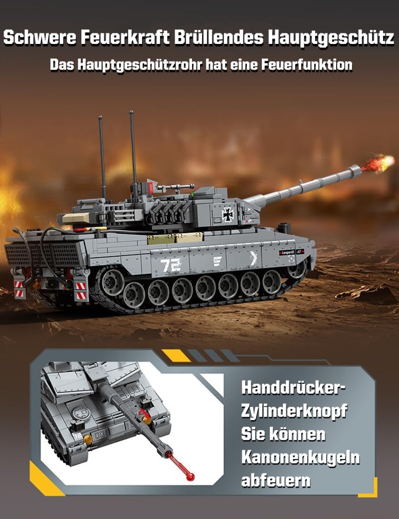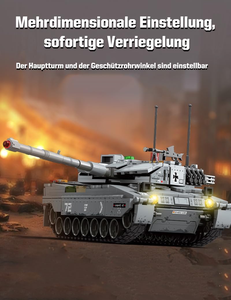 【Imballaggio pratico】Consegnato in una robusta confezione di cartone e carta kraft (non confezione regalo). Qualità e contenuti identici! 【Il carro armato da battaglia più moderno come kit dettagliato】Prova l'emozione della costruzione di modelli con questo sofisticato modello di carro armato! Ricostruisci il Leopard 2A7 altamente dettagliato da 804 parti. La torretta rotante e il cannone mobile rendono questo veicolo militare pronto per l'uso immediato. Un kit perfetto per adulti che farà battere forte il cuore di ogni carro armato. 【Design autentico per un vero feeling militare】 Questo carro armato colpisce per il suo design militare realistico. Minigonne laterali rimovibili, cingoli completi e autentica mimetica conferiscono al modello di carro armato un aspetto distintivo. Ideale per collezionisti e appassionati di veicoli militari storici e moderni. 【Vai accessori d'azione inclusi】Più di un semplice carro armato: il set contiene 4 personaggi militari con pistole, alberi e cespugli per la progettazione del terreno. Ciò ti consente di ricreare scenari realistici e di integrare il giocattolo del carro armato in un campo di gioco completo. 【Funzionale e dinamico come i modelli tecnologici reali】 Questo serbatoio con morsettiera è pieno di funzioni! Un meccanismo di tiro integrato e un'armatura pieghevole garantiscono il massimo divertimento. La tecnologia dei blocchi di bloccaggio rende il modello robusto e mobile, tipico dei set militari di blocchi di bloccaggio di alta qualità. 【Blocchi di bloccaggio premium per adulti】 I blocchi di bloccaggio di alta qualità garantiscono una costruzione estremamente stabile e durevole. Questo set di mattoncini con morsetti per adulti garantisce ore di divertimento e un'esperienza di costruzione di modelli impegnativa. Un must per ogni fan dei sofisticati modelli di morsettiere.
