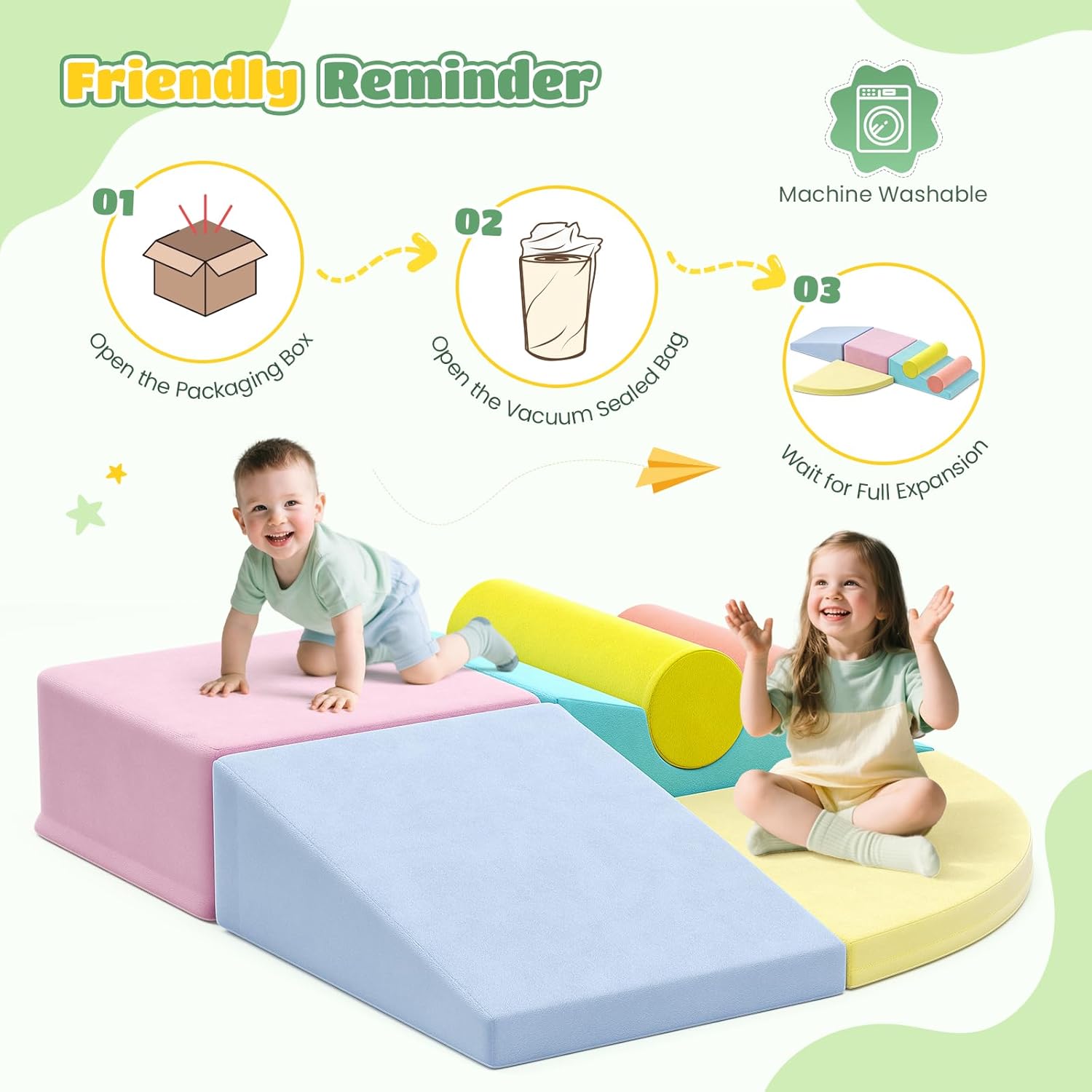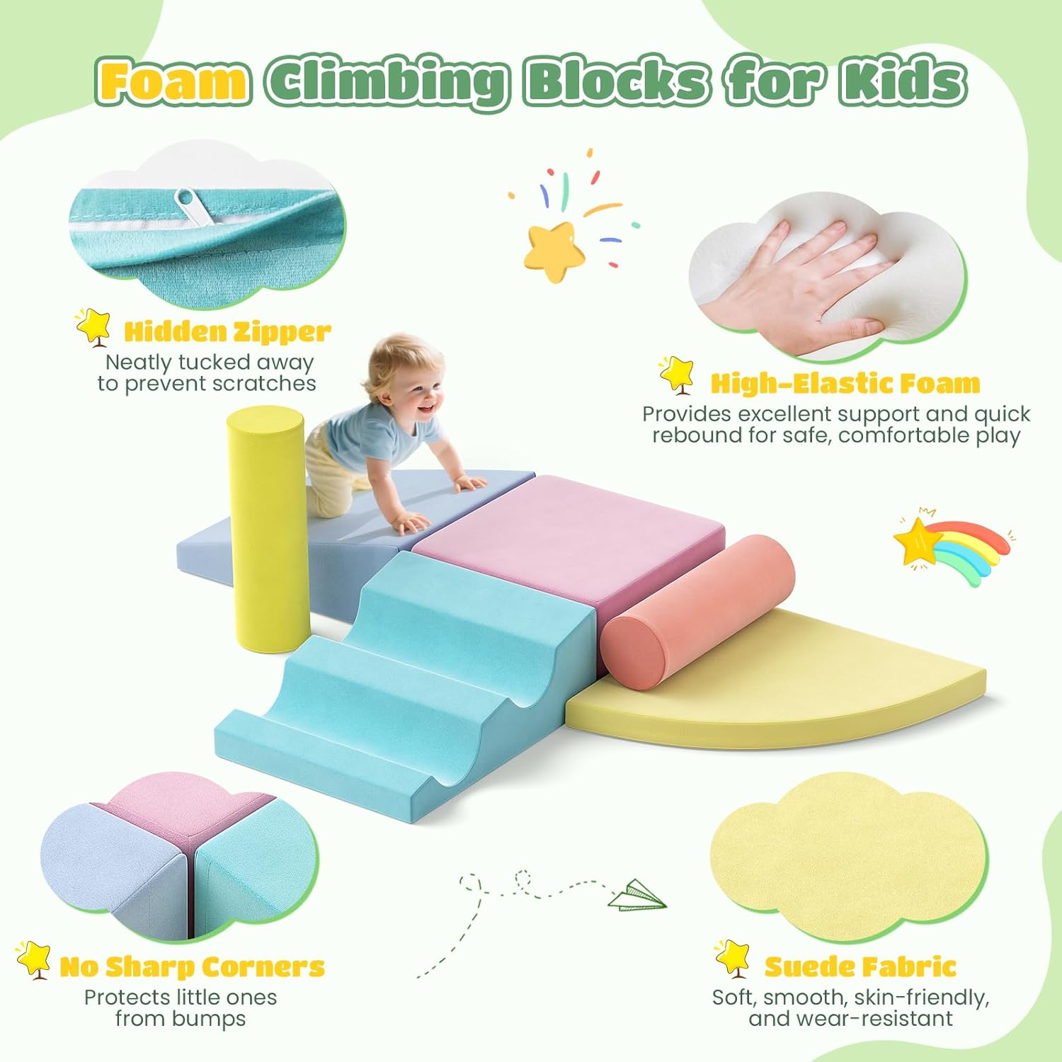 1. Giocattolo da arrampicata sicuro e morbido per bambini piccoli: il nostro giocattolo da arrampicata in schiuma è realizzato in filato perlato, morbido, resistente e non facile da deformare. E il nucleo dei blocchi da arrampicata in schiuma è rivestito in pelle vegana e ha un fondo antiscivolo per mantenere la struttura in posizione durante l'uso per bambini e bambini. Materiali certificati e durevoli: il rivestimento in pelle PU ispessita di questo set da gioco da arrampicata in morbida schiuma è atossico, impermeabile, resistente agli strappi ed è realizzato in materiali a basse emissioni e adatti ai bambini secondo gli standard di sicurezza federali. È possibile montare facilmente il giocattolo da arrampicata con gli elementi di fissaggio in dotazione per godersi l'arrampicata e il gattonamento con i bambini. 3. Ideale per interni ed esterni: questo giocattolo da arrampicata per bambini è un giocattolo da arrampicata versatile di alta qualità. Grazie al suo materiale impermeabile e facile da pulire, può essere utilizzato anche all'aperto ed è perfetto per asili, case e scuole. I nostri dispositivi Softplay sono di medie dimensioni e abbastanza leggeri da consentire ai bambini di indossarli e giocare all'interno e all'esterno. L'aspetto accattivante attira l'attenzione dei bambini e li fa immergersi nel mondo dei mattoncini. 4. 【Combinazione di divertimento e sviluppo di abilità】 Questo giocattolo da arrampicata per bambini è un dispositivo di gioco dal look unico che risveglia l'interesse dei bambini. Sia che tu stia cercando un divertente giocattolo all'aperto per bambini o un modo per mantenere i bambini attivi e sani, questi blocchi di arrampicata in schiuma per bambini sono la scelta ideale! 5. Facile da pulire e mantenere: il rivestimento in PU antimacchia e impermeabile rende la pulizia un gioco da ragazzi. Basta pulire i blocchi con un panno umido. Inoltre è possibile rimuovere facilmente la fodera grazie al design con cerniera. I giocattoli da arrampicata per bambini possono essere fissati in modo sicuro con chiusura in velcro e così facili da smontare e riassemblare e riporre. Incoraggiano i bambini a giocare e giocare in modo creativo. Nota: pulire con acqua e sapone delicato.
