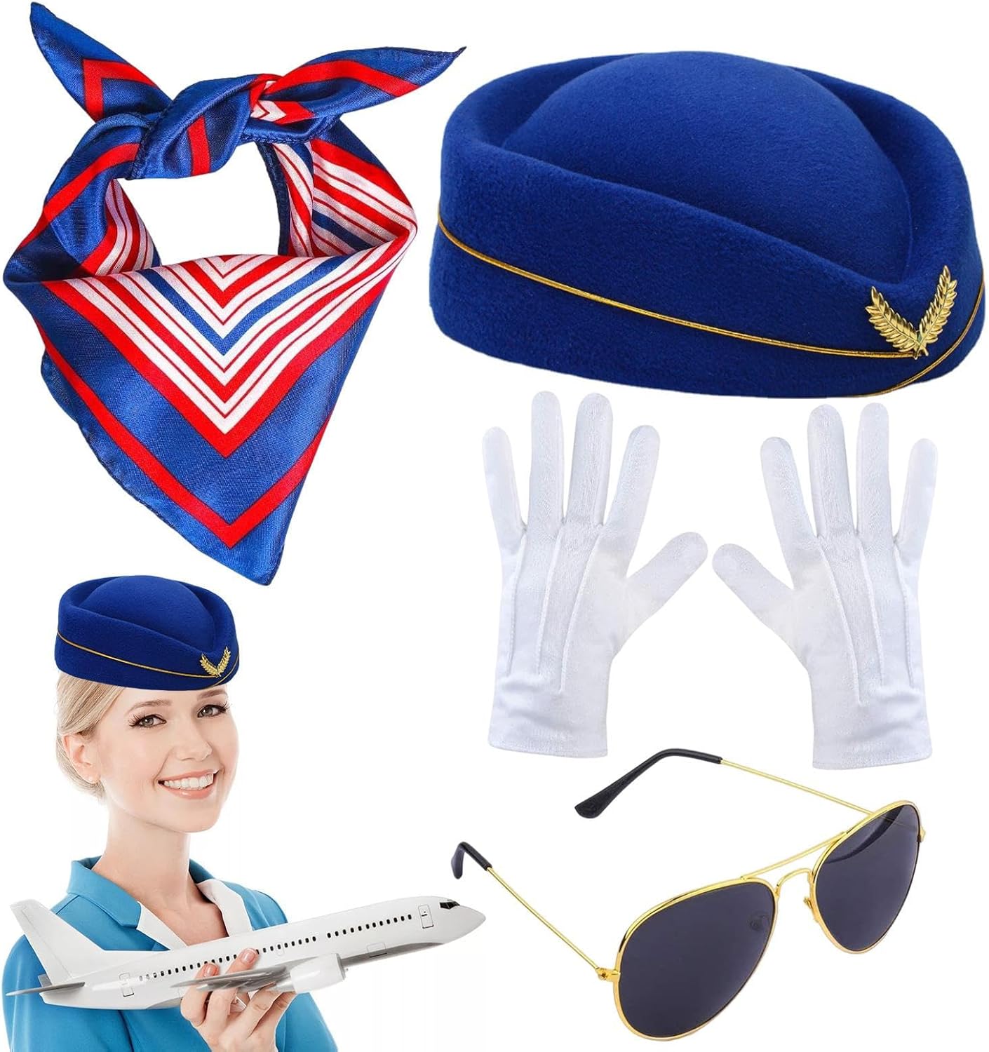 Blue Airline - Set di accessori per costume da hostess da donna, accessorio per travestimento da assistente di volo, per adulti, cosplay, feste Questo set di accessori è il complemento perfetto per il tuo costume da hostess. Include un cappello, una sciarpa, un paio di occhiali da sole e un paio di guanti. Questo set è adatto per cosplay di hostess, spettacoli teatrali e feste in maschera. Puoi divertirti con i tuoi amici creando look diversi con questi accessori. Il cappello si adatta comodamente alla testa e la sciarpa è comoda sul collo. I guanti sono morbidi e delicati sulle mani. Questo set è comodo da indossare e da togliere ed è disponibile in una varietà di colori per abbinare la tua personalità. Che tu voglia essere una hostess impertinente o elegante, questo set ti aiuterà a ottenere il look desiderato. Specifiche tecniche: Materiale: tessuto. Dimensioni: Cappello: circa 56-58 cm. Sciarpa: circa 50 x 50 cm. Peso: circa 200 g. Contenuto della confezione: 1 cappello hostess. 1 sciarpa di seta. 1 paio di occhiali da sole. 1 paio di guanti