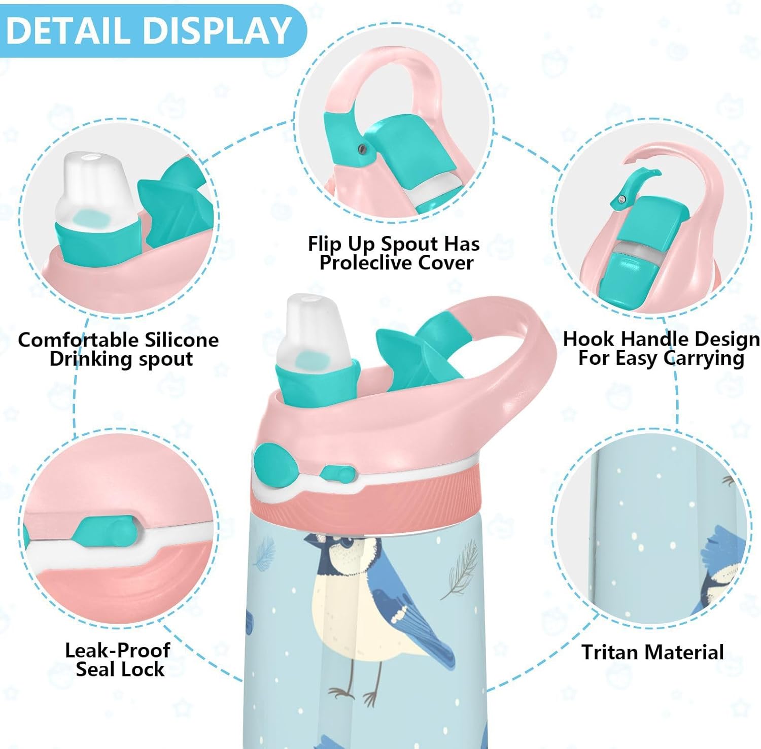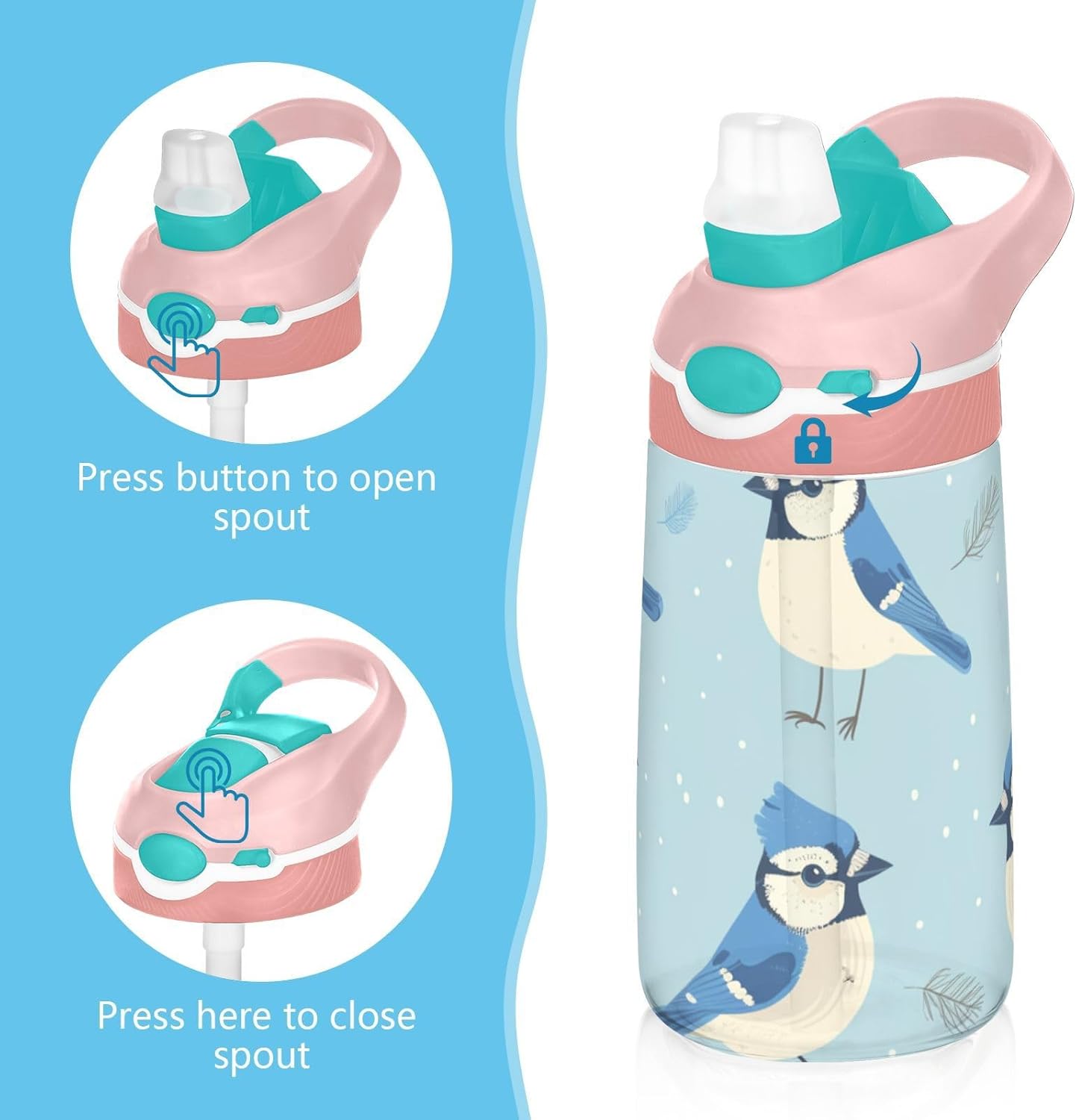 Materiali: questa borraccia per bambini da 480 ml (16 cm di lunghezza, 7,5 cm di larghezza) combina tritan e silicone alimentare. per la pratica sportiva o i giorni scolastici, è sicuro per i bambini da usare tutti i giorni. Non adatto a bambini di età inferiore ai 3 anni! Design portatile: l'ampio manico e il gancio del coperchio rendono la bottiglia d'acqua facile da trasportare. I bambini possono appenderlo alle loro borse, evitando il fastidio di farla cadere durante la ricreazione o i viaggi in autobus. Funzionamento amichevole: il becco d'anatra si adatta bene, con una copertura antipolvere. L'interruttore a pulsante della borraccia consente l'uso con una sola mano, in modo che i bambini possano idratarsi senza mettere giù i loro giocattoli o attrezzi sportivi. Previene le perdite: il blocco a pulsante blocca l'apertura accidentale del becco d'anatra. Mantiene le bevande all'interno, proteggendo zaini e vestiti durante i pendolari o il gioco. Facile da pulire: tutte le parti della borraccia per bambini possono essere smontate per evitare l'accumulo di sporco. Pulire con detergente neutro e acqua calda.