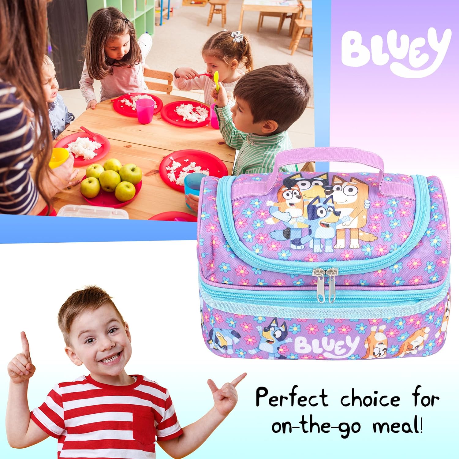Prodotto ufficiale Bluey - Design versatile adatto per la scuola o il doposcuola, offre un'opzione elegante e funzionale per tutti i giovani fan di Bluey Consulta la nostra pagina del negozio per tutti i prodotti ufficiali Minecraft Design isolato e durevole: mantiene i pasti freschi e sicuri per tutto il giorno con la sua struttura isolante e resistente. Questa borsa per il pranzo è costruita per resistere all'uso quotidiano, garantendo prestazioni di lunga durata. Adatto per ragazzi e ragazze: design versatile adatto sia per ragazzi che per ragazze, offre un'opzione elegante e funzionale per tutti i fan di Bluey Consulta la nostra pagina del negozio per tutti i prodotti ufficiali. Borsa per il pranzo con personaggio: borsa per il pranzo classica e colorata viola per ragazze termica e completamente isolata con il personaggio Bluey preferito. Set completo: eleva l'attrezzatura del tuo bambino con il set completo, tra cui una bottiglia d'acqua abbinata e una borsa con coulisse vendute separatamente nel nostro negozio. Insieme, creano un look coordinato per avventure in movimento, assicurando che il bambino sia dotato di tutto ciò di cui ha bisogno
