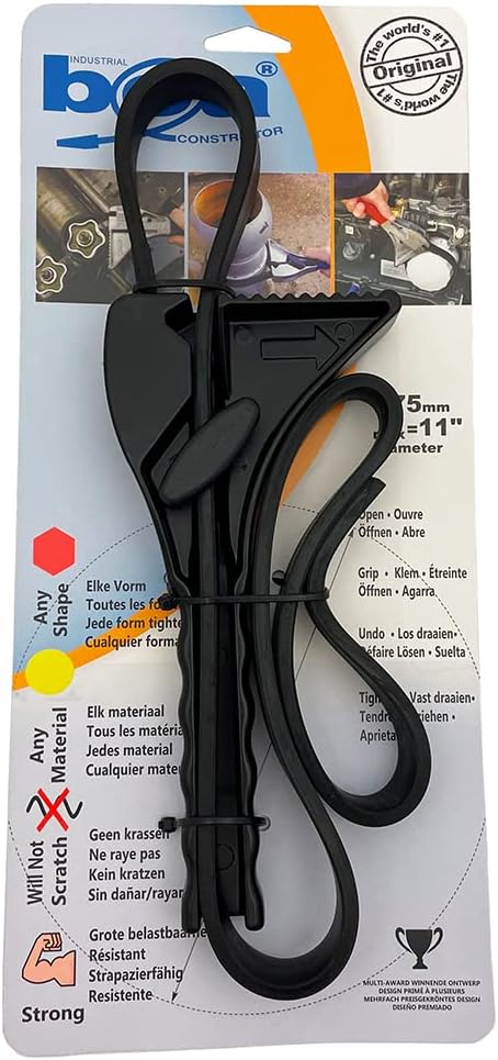 Fascia elastica: afferra, apre, stringe e rilascia quasi tutte le forme Versatile: può essere utilizzata su vetro, plastica, legno, cromo e tutte le altre superfici delicate senza danneggiare la superficie Resistenza industriale: la fascia elastica ha una resistenza alla rottura di oltre 2000 libbre di pressione e può stringere quasi qualsiasi forma Alloggiamento in alluminio: il telaio in lega resistente da 12" fornisce una presa stabile per la cinghia extra lunga che può afferrare forme fino a 12" Nuovo colore di finitura: ora disponibile con verniciatura a polvere nera