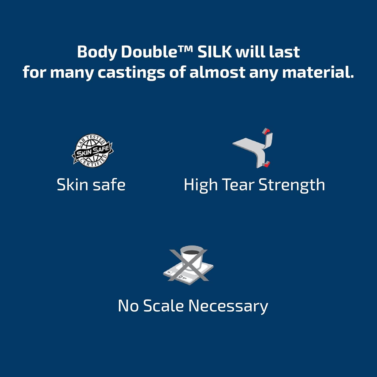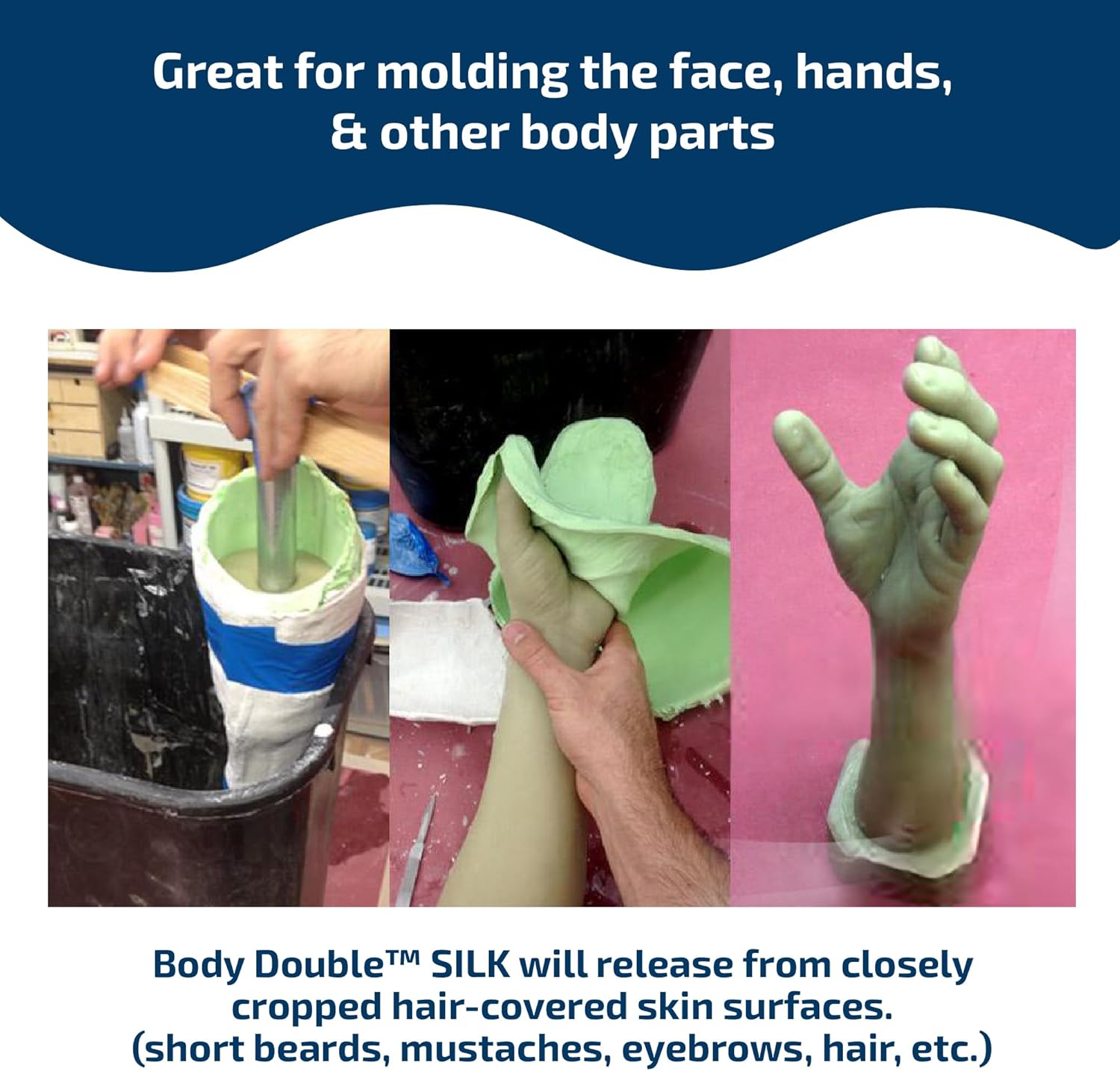 Product Description:This a better releasing version of Body Double. Body Double SILK is a self-releasing platinum-cure silicone rubber that can be applied directly to the skin to make moulds of the face, hands and other body parts. The rubber cures quickly and will reproduce excellent detail from any original model. Body Double SILK will release from hair-covered skin surfaces (closely cropped beards, moustaches, eye-brows, pubic hair, etc.). Release cream or Hyperfolic are not needed when using Body Double SILK. Body Double SILK will last for many castings of almost any material including plaster, Matrix Neo, wax, resins (Smooth-Cast urethanes, polyester, etc.)