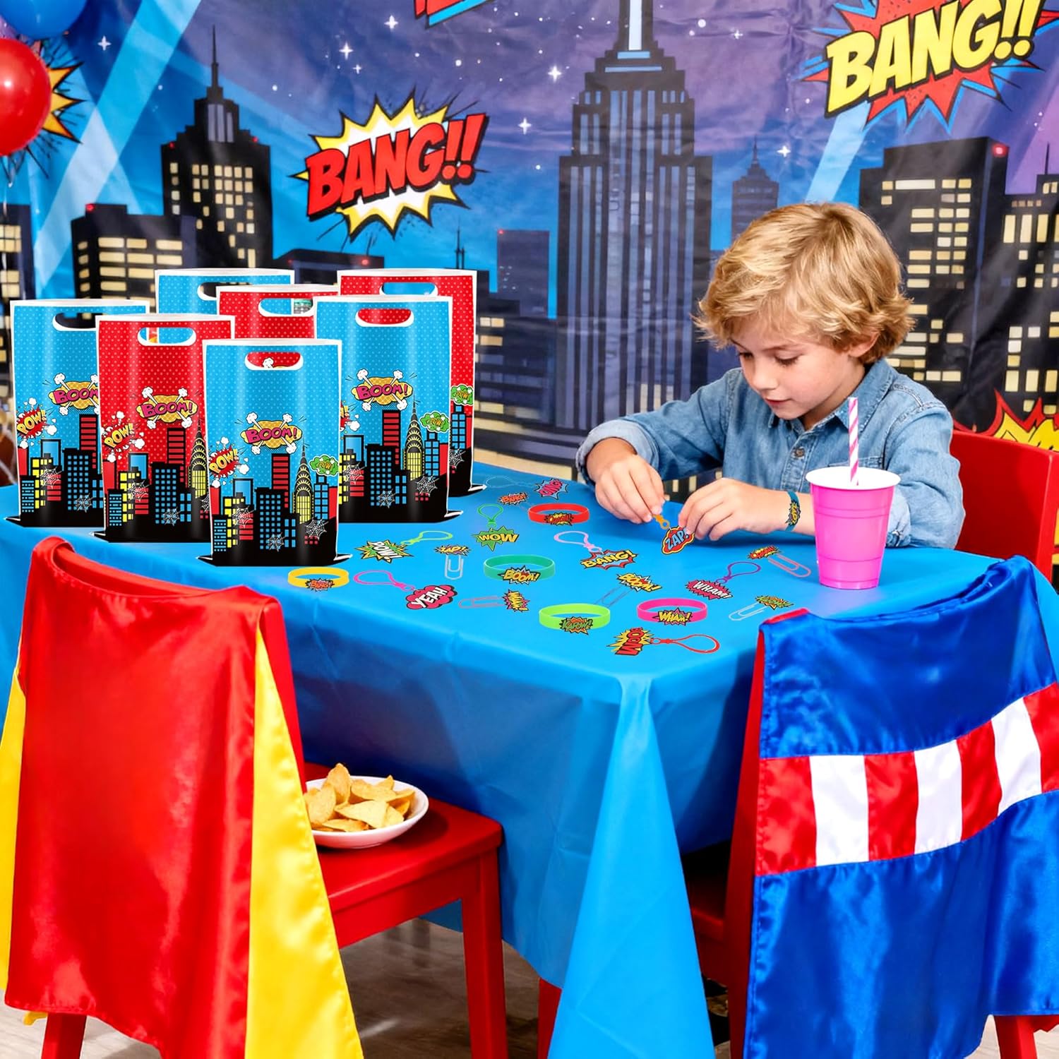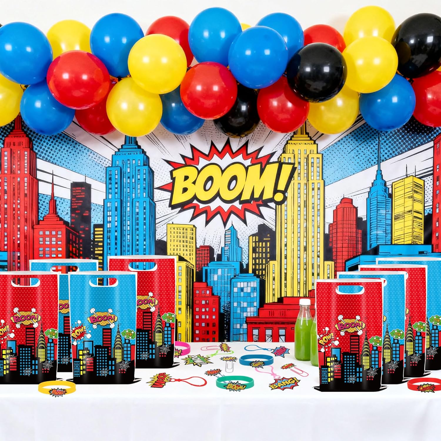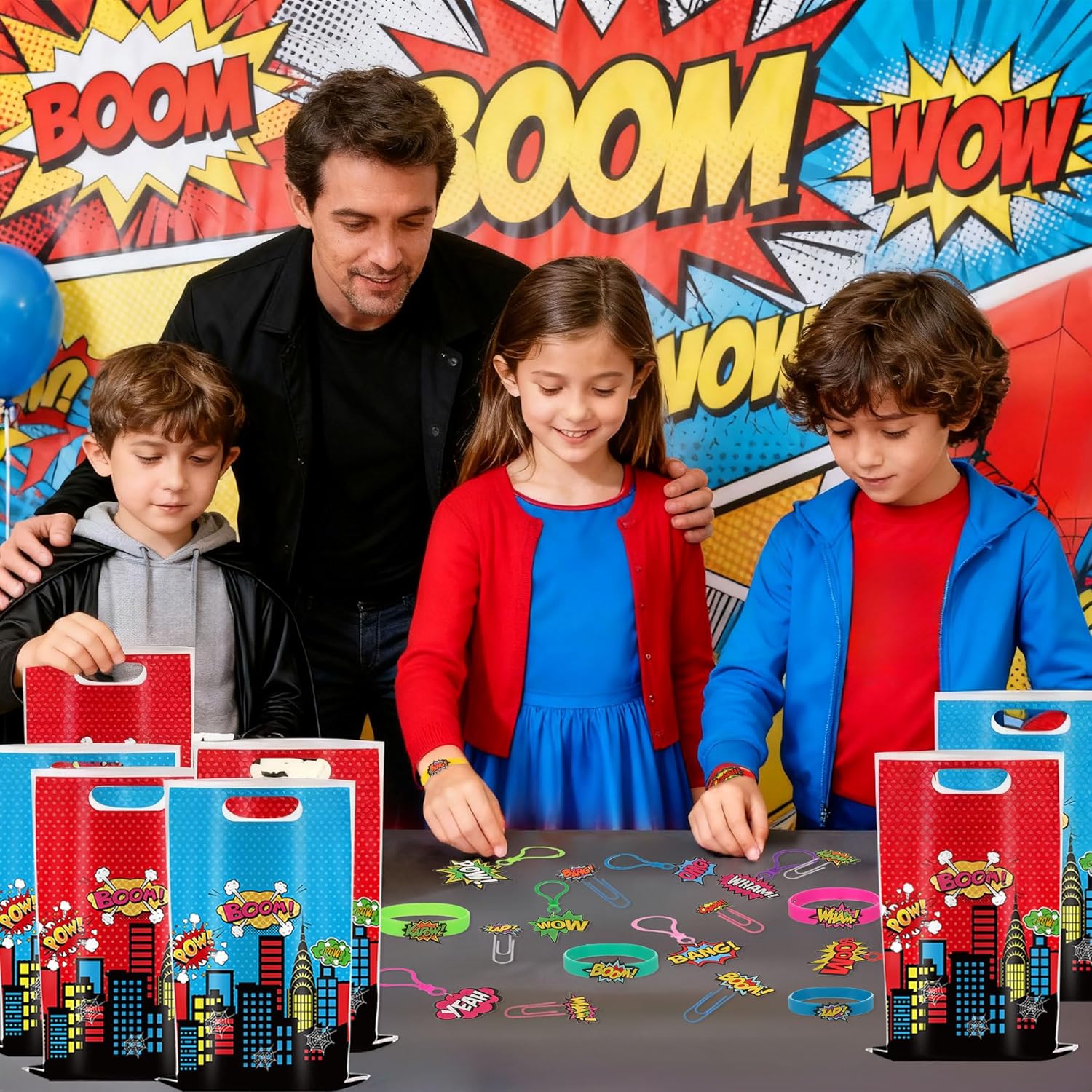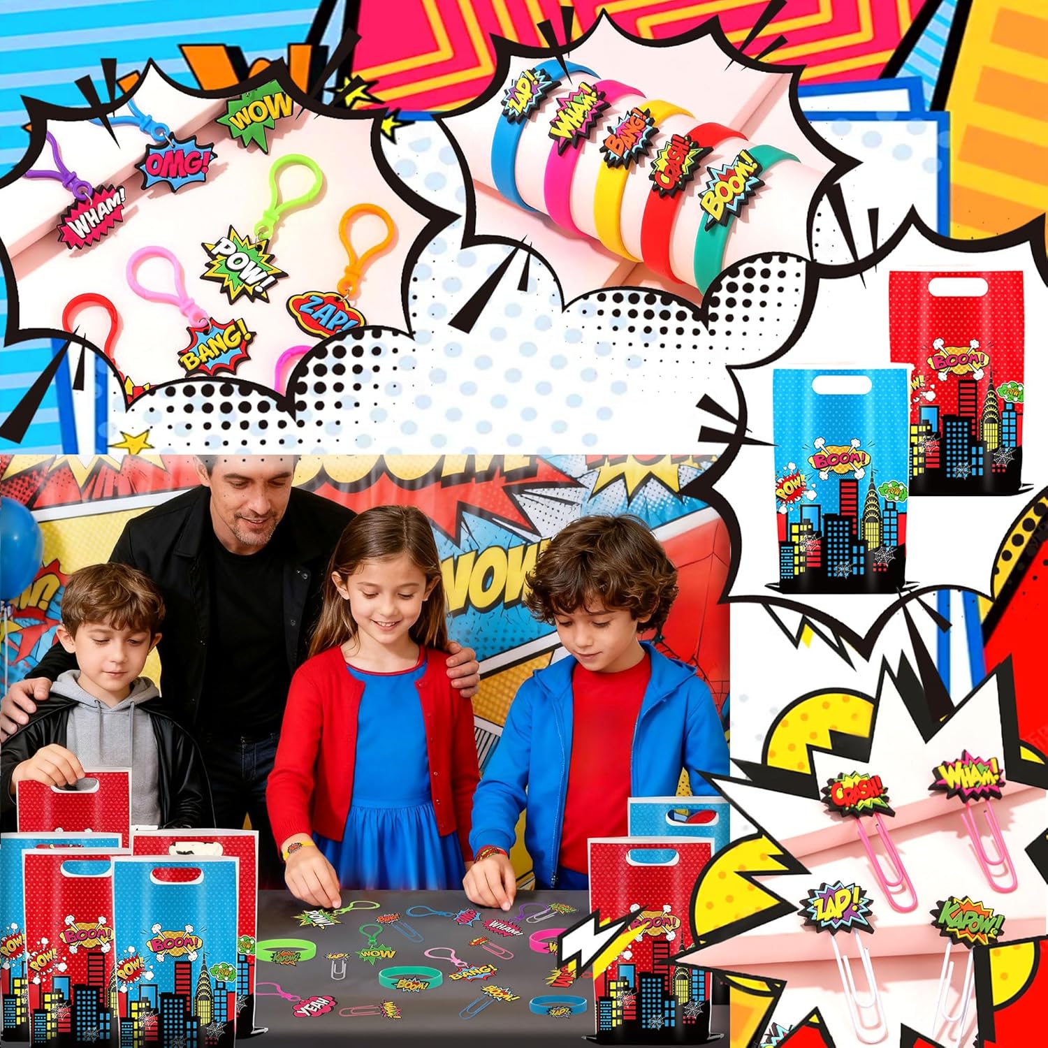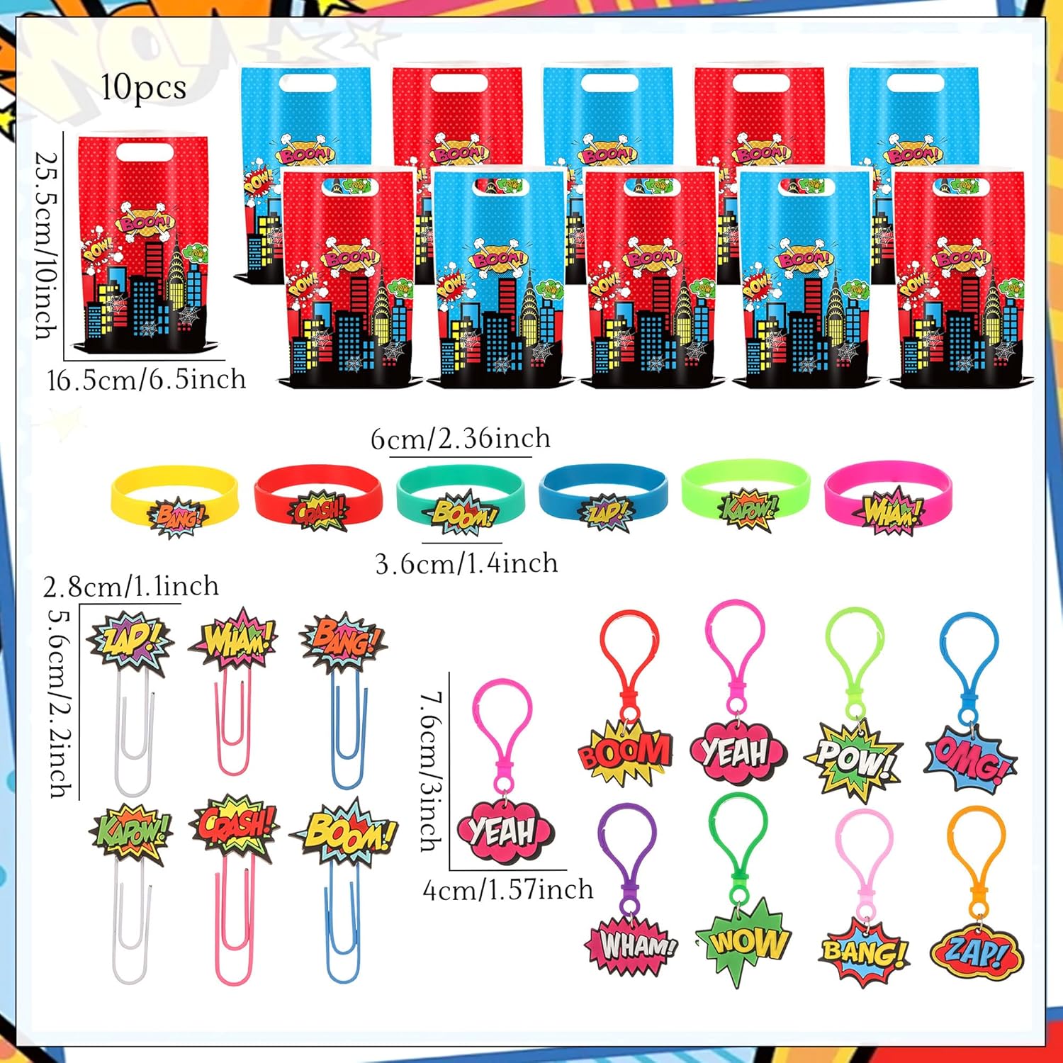 Riceverai: 6 braccialetti a tema eroe, 10 sacchetti per bomboniere eroe, 8 portachiavi, 6 segnalibri Completa la festa di compleanno del tuo piccolo eroe con stile con questo supereroe bomboniere! Trasforma i normali sacchetti in tesori di gioia. Testimoni dell'indimenticabile scintilla di meraviglia negli occhi dei bambini quando scoprono segnalibri colorati come premi in classe o premi di carnevale Trasforma i normali sacchetti regalo in sacchetti da supereroe con questa combinazione ricca di valore! Perfetto per feste di compleanno per bambini, feste a tema o eventi scolastici, i piccoli guerrieri possono scambiare premi liberamente alle fiere Crea un coinvolgente quartier generale di supereroi dove ogni articolo presenta colori vivaci e motivi garantiti per entusiasmare i giovani ospiti Questo kit per feste da supereroi è per riunioni di compleanno per bambini, feste a tema supereroi o come regalo per piccoli supereroi