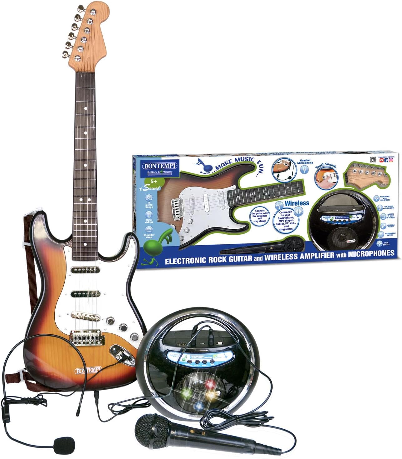 Chitarra rock: 6 corde in metallo offrono autentici suoni rock per un'esperienza musicale coinvolgente. Repertorio pronto: 8 brani preregistrati per mettere in scena performance rock senza sforzo. Stile e comfort: tracolla inclusa per poter giocare con stile e comfort ovunque tu vada. Potenza amplificata: collega all'amplificatore per un suono potente (cavo incluso). Wireless e versatile: amplificatore con microfono a condensatore e connessioni multiple per un'esperienza musicale illimitata.