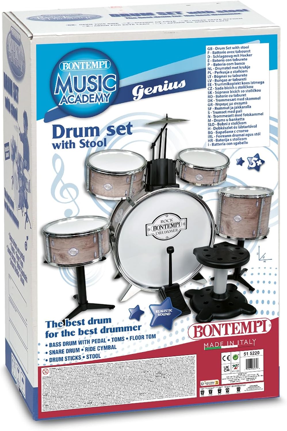 Batteria metallica: grancassa Ø 430 mm con pedale 2 tom Ø 240 mm 1 tom Ø 240 mm su supporto “Rullante” Ø 240 mm su supporto Piatti Ø 210 mm 2 bacchette Suoni reali Consegnato con sgabello regolabile in altezza Dim: 700x400x800 mm