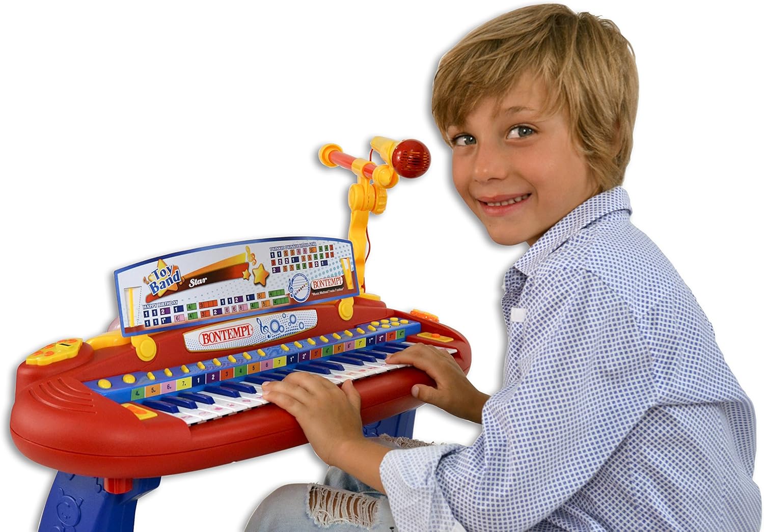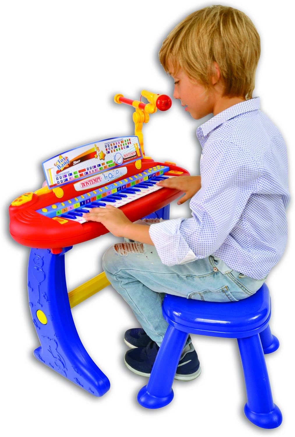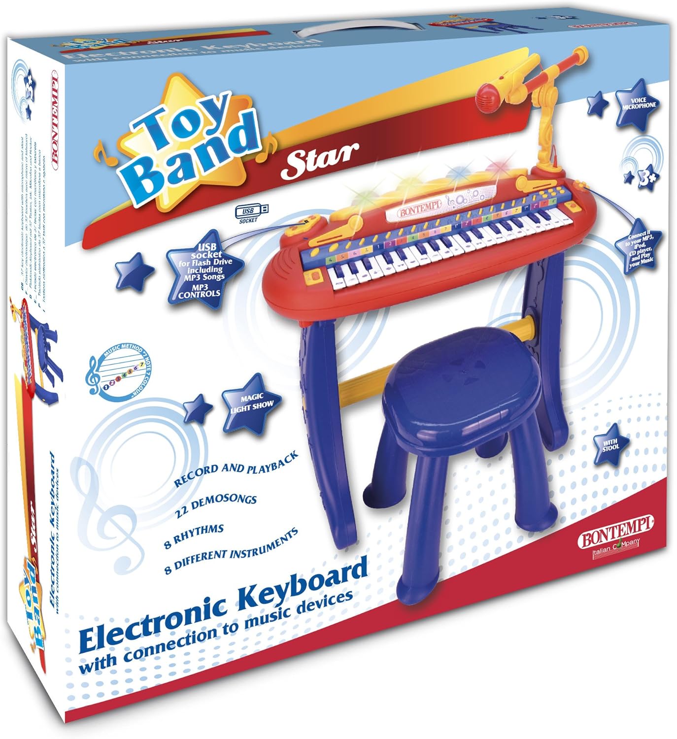 Tastiera con gambe a 37 tasti provvista di sgabello e microfono Effetti sonori e luminosi sulla plancia Funzione Record & Play per registrare e riascoltare le melodie suonate Presa USB per lettura brani MP3 Presa per sorgente musicale esterna (CD player, MP3 ecc) provvista di cavetto