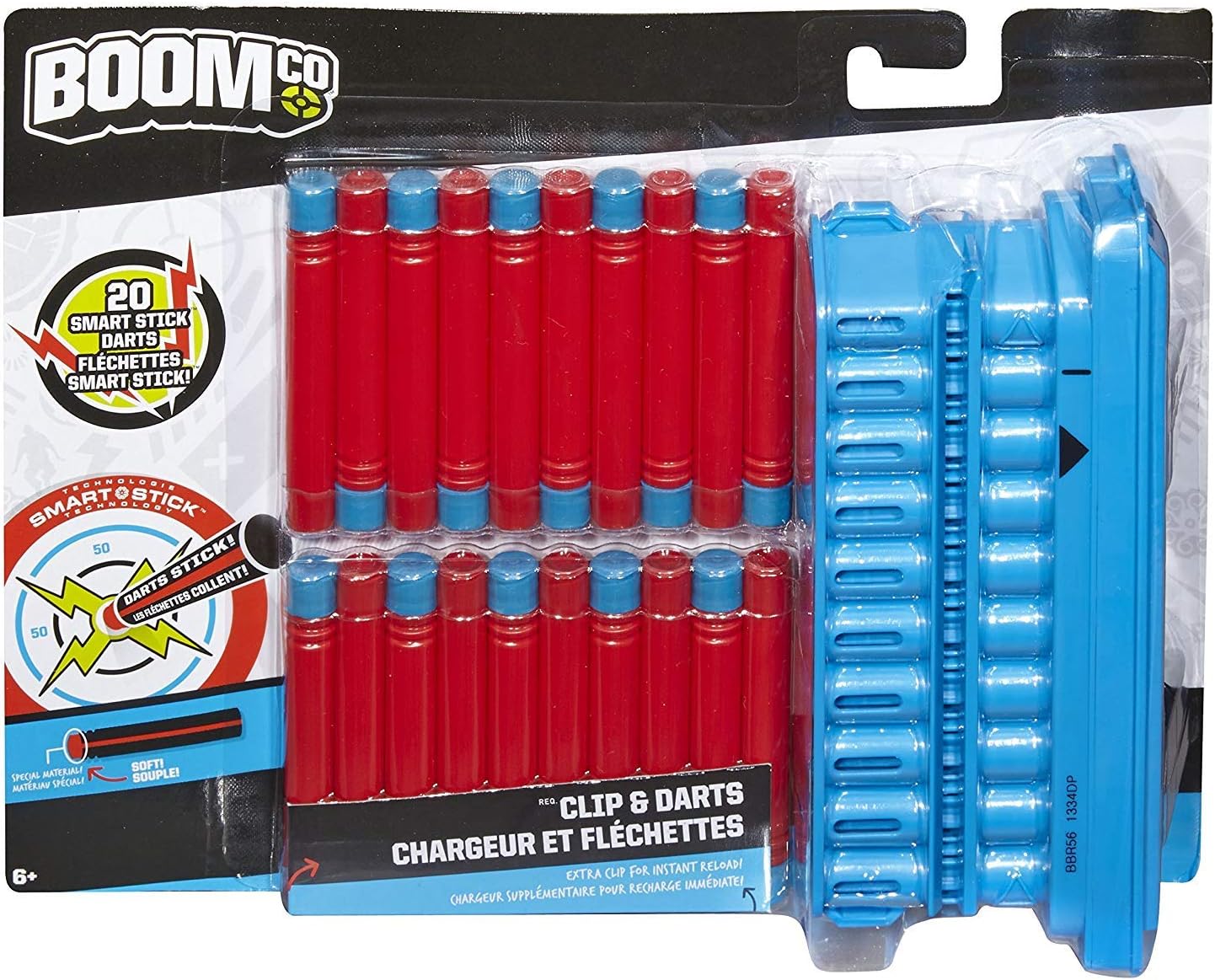 BoomCo; clip e confezione da 20 freccette Include 1 clip e 20 freccette Un grande regalo che ogni ragazzo è sicuro di amare Le freccette si attaccano solo ai bersagli Smart Stick