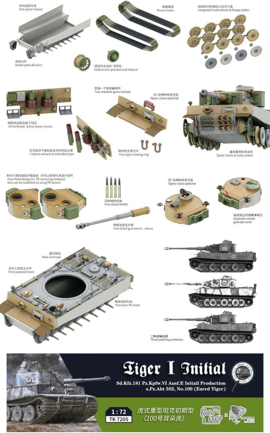 Kit carro armato pesante Sd.Kfz. 181 Pz.Kpfw. VI Ausf E Tiger I produzione iniziale s.Pz.Abt. 502 in scala 1/35 - Modello Border Model.Lo Sd.Kfz. 181 Panzerkampfwagen VI Ausf. E, comunemente conosciuto come Tiger I, era un carro armato pesante utilizzato dalla Germania nazista durante la seconda guerra mondiale. La produzione iniziale del Tiger I stata caratterizzata da alcune specifiche che sono cambiate nel corso del tempo. Ecco una panoramica delle caratteristiche della produzione iniziale del Tiger I:Armamento: Il Tiger I era equipaggiato con un cannone KwK 36 L/56 da 88 mm, noto per la sua potenza e precisione. Questo cannone era in grado di penetrare la corazza dei carri armati nemici a lunga distanza, rendendo il Tiger I una minaccia formidabile sul campo di battaglia.Corazza: La corazza frontale del Tiger I era spessa e ben inclinata per aumentare la protezione. La corazza era inizialmente composta da lastre di acciaio saldate insieme, offrendo una buona protezione contro i proiettili nemici.Motore: La produzione iniziale del Tiger I era equipaggiata con un motore Maybach HL 210 da 650 cavalli, che forniva al carro armato una buona velocit e una buona manovrabilit considerando le sue dimensioni e il suo peso.Produzione: Il Tiger I entrato in produzione nel 1942 e ha visto diverse modifiche e miglioramenti nel corso della sua produzione. La produzione iniziale stata caratterizzata da alcune differenze rispetto ai modelli successivi, come ad esempio piccole variazioni nella corazza e nelle componenti del motore.Utilizzo: Il Tiger I stato utilizzato principalmente sul fronte orientale contro l'Armata Rossa sovietica e sul fronte occidentale contro le forze alleate. Nonostante la sua efficacia nel combattimento, la produzione del Tiger I stata limitata a causa della complessit del suo design e dei costi di produzione elevati.In sintesi, lo Sd.Kfz. 181 Pz.Kpfw. VI Ausf E Tiger I, nella sua produzione iniziale, era un potente carro armato pesante utilizzato