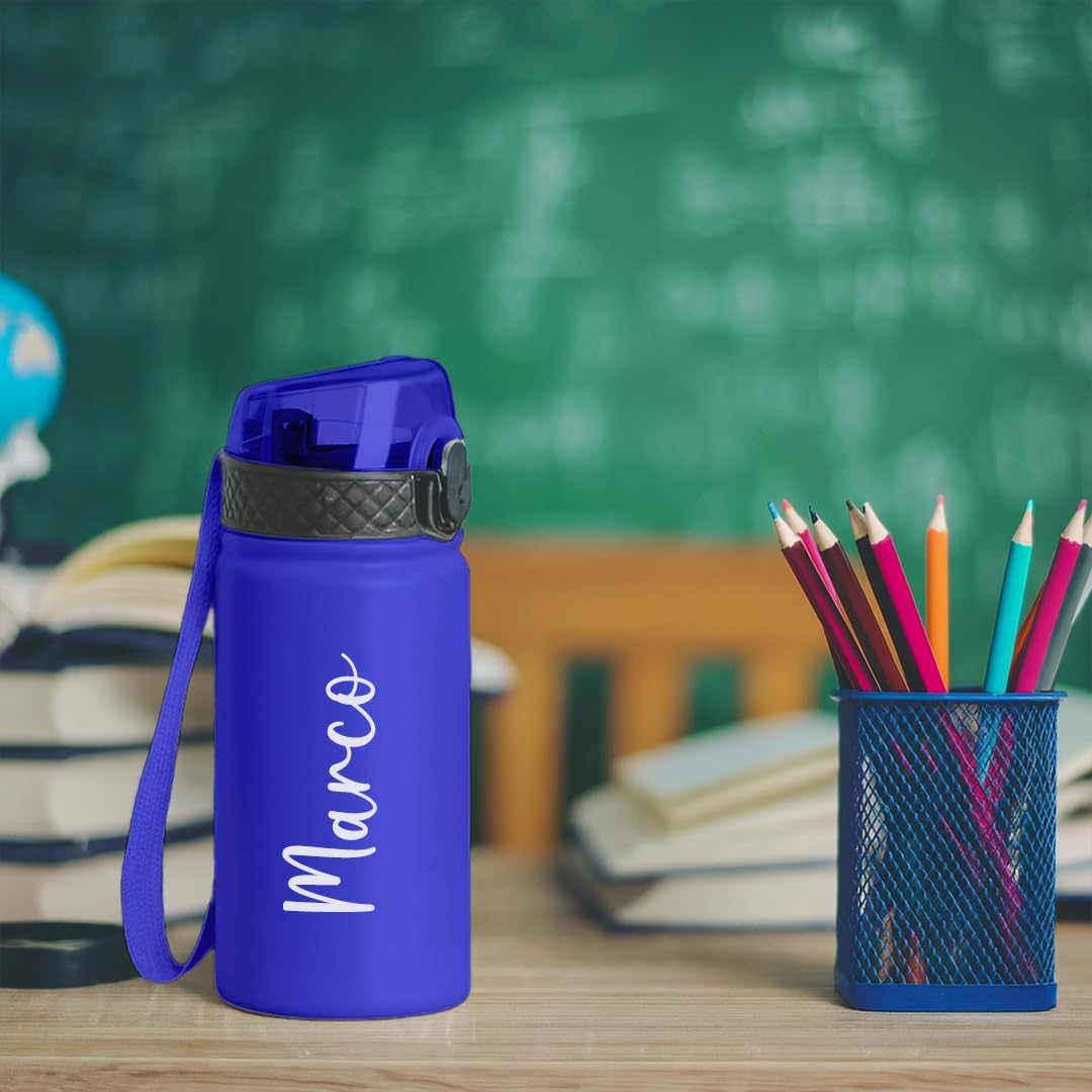 PERSONALIZZAZIONE: Bottiglia d'acqua personalizzabile con simpatico disegno e nome, perfetta per bambini che vogliono una borraccia unica CAPACITÀ: Contenitore termico da 550ml in acciaio inox, dimensione ideale per l'idratazione quotidiana dei bambini a scuola o durante le attività DESIGN PRATICO: Dotata di beccuccio con cannuccia integrata e cinturino per il trasporto, facile da utilizzare per i più piccoli MATERIALE: Realizzata in acciaio inox di alta qualità, mantiene le bevande alla temperatura desiderata più a lungo SICUREZZA: Tappo con chiusura sicura e design anti-goccia, ideale per evitare fuoriuscite nello zaino o durante l'uso