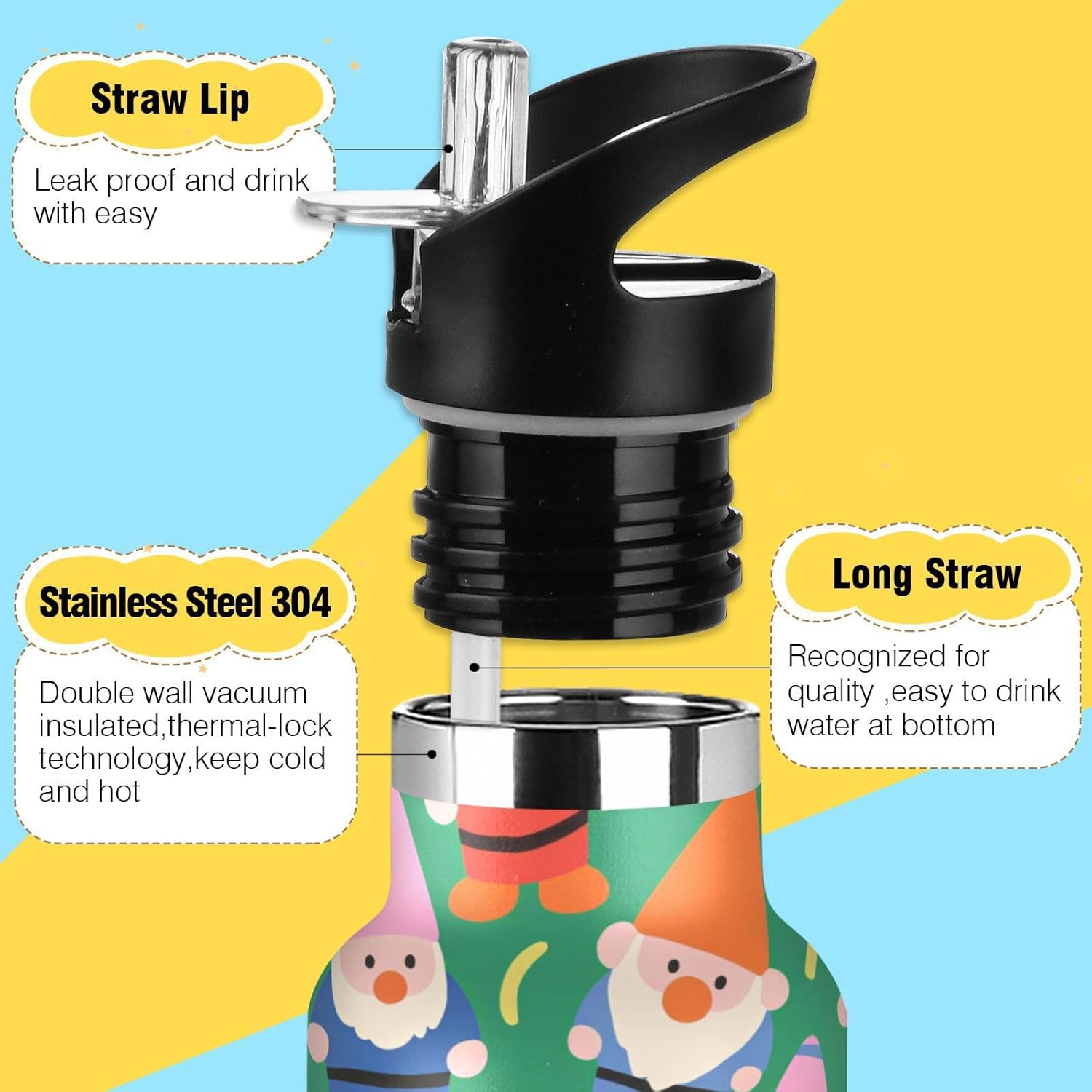 Controllo della temperatura per tutto il giorno: l'isolamento a doppio strato con rivestimento termoriflettente mantiene la temperatura delle bevande durante le pratiche di calcio o gli spostamenti invernali. Non scendere mai a compromessi sulla freschezz Coperchio 2 in 1: i due coperchi possono essere cambiati in qualsiasi momento: la cannuccia per sorseggiare facilmente o un coperchio girevole per una rapida idratazione. Design del coperchio: l'esclusiva valvola di rilascio dell'aria consente un flusso regolare durante le corse intense, senza scomode inclinazioni o rischi di soffocamento. Ideale per le pause di idratazione durante le lezioni Caratteristiche portatile: il manico allargato consente di raccogliere questa borraccia per bambini con solo due dita. È un gioco da ragazzi da portare durante le corse mattutine o le gite in bicicletta, in modo da poter rimanere idratati in movimento. Dimensioni perfette per viaggiare: questa borraccia riutilizzabile si adatta alla maggior parte dei portabicchieri e alla tasca laterale di uno zaino. Comodo da portare in giro con un manico ergonomico a bordo largo. È ideale da portare a scuola, palestra, campeggio o viaggi su strada.