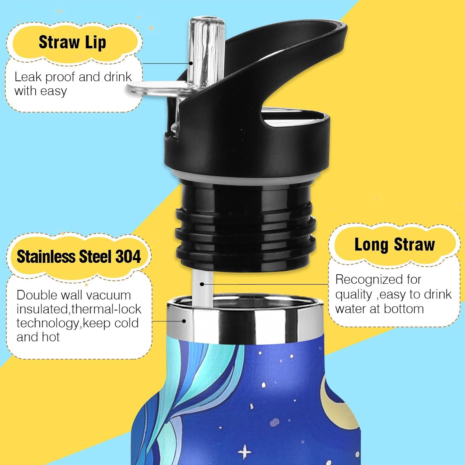Resistenza isolata sottovuoto: realizzata con acciaio inossidabile a doppio strato e tecnologia sigillata sottovuoto, questa borraccia riutilizzabile mantiene le bevande ghiacciate per 24 ore o calde a vapore per 12 ore, perfette per maratone, escursioni o giornate impegnative in ufficio. Dite addio all'acqua tiepida durante gli allenamenti! Coperchio 2 in 1: con una cannuccia pieghevole, questa borraccia da palestra garantisce un facile sorseggio. È perfetto per gli allenamenti in palestra, dove puoi bere rapidamente. Design del coperchio: l'esclusiva valvola di rilascio dell'aria consente un flusso regolare durante le corse intense, senza scomode inclinazioni o rischi di soffocamento. Ideale per le pause di idratazione durante le lezioni Funzione portatile: il manico allargato consente di raccogliere questa bottiglia d'acqua in metallo per bambini con solo due dita. È un gioco da ragazzi da portare durante le corse mattutine o le gite in bicicletta, in modo da poter rimanere idratati in movimento. Dimensioni perfette per viaggiare: questa borraccia da palestra si adatta alla maggior parte dei portabicchieri e alla tasca laterale di uno zaino. Comodo da portare in giro con un manico ergonomico a bordo largo. È ideale da portare a scuola, palestra, campeggio o viaggi su strada.
