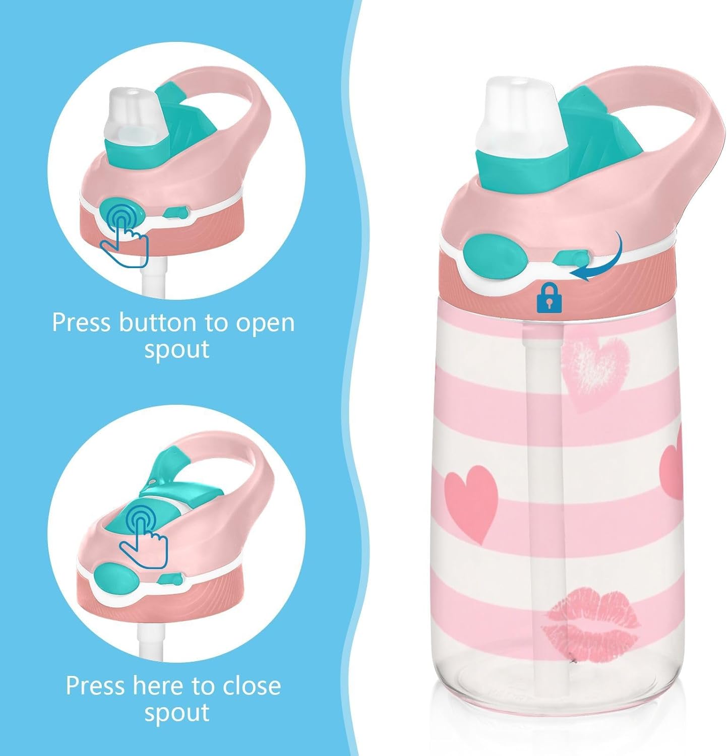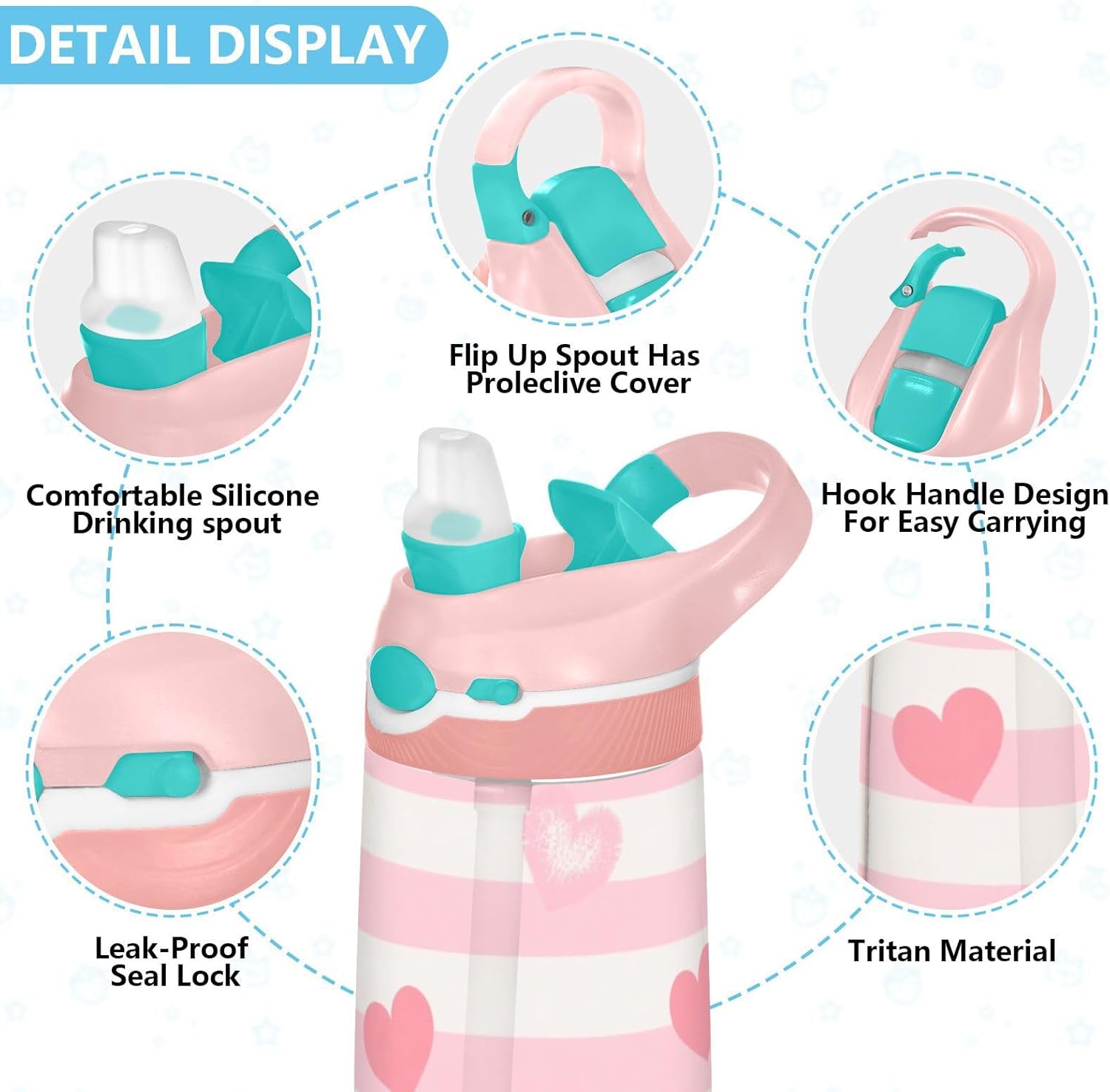 Materiali: questa borraccia sportiva da 480 ml (16 cm di lunghezza, 7,5 cm di larghezza) combina tritan e silicone alimentare. per la pratica sportiva o i giorni scolastici, è sicuro per i bambini da usare tutti i giorni. Non adatto a bambini di età inferiore ai 3 anni! Comoda da trasportare: con un ampio manico per mani piccole e un gancio sul coperchio, la borraccia per bambini può essere appesa agli zaini. I bambini non faranno fatica a trasportarla durante le gite sul campo o le attività post-scuola. Funzionamento amichevole: il becco d'anatra si adatta bene, con una copertura antipolvere. L'interruttore a pulsante delle bottiglie d'acqua sportive consente l'uso con una sola mano, in modo che i bambini possano idratarsi senza mettere giù i loro giocattoli o attrezzi sportivi. Previene le perdite: il blocco a pulsante blocca l'apertura accidentale del becco d'anatra. Mantiene le bevande all'interno, proteggendo zaini e vestiti durante i pendolari o il gioco. Pulizia semplice: le parti completamente rimovibili evitano l'accumulo di sporco. Pulire con detergente neutro e acqua calda: facile per i genitori mantenere pulita la borraccia sportiva per l'uso quotidiano.
