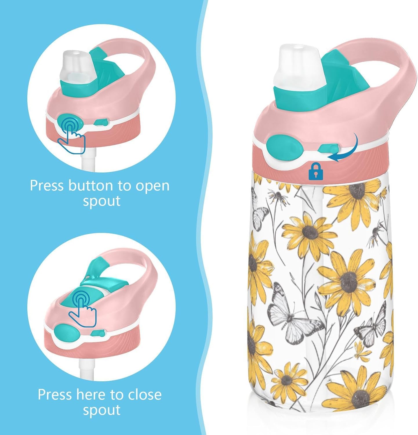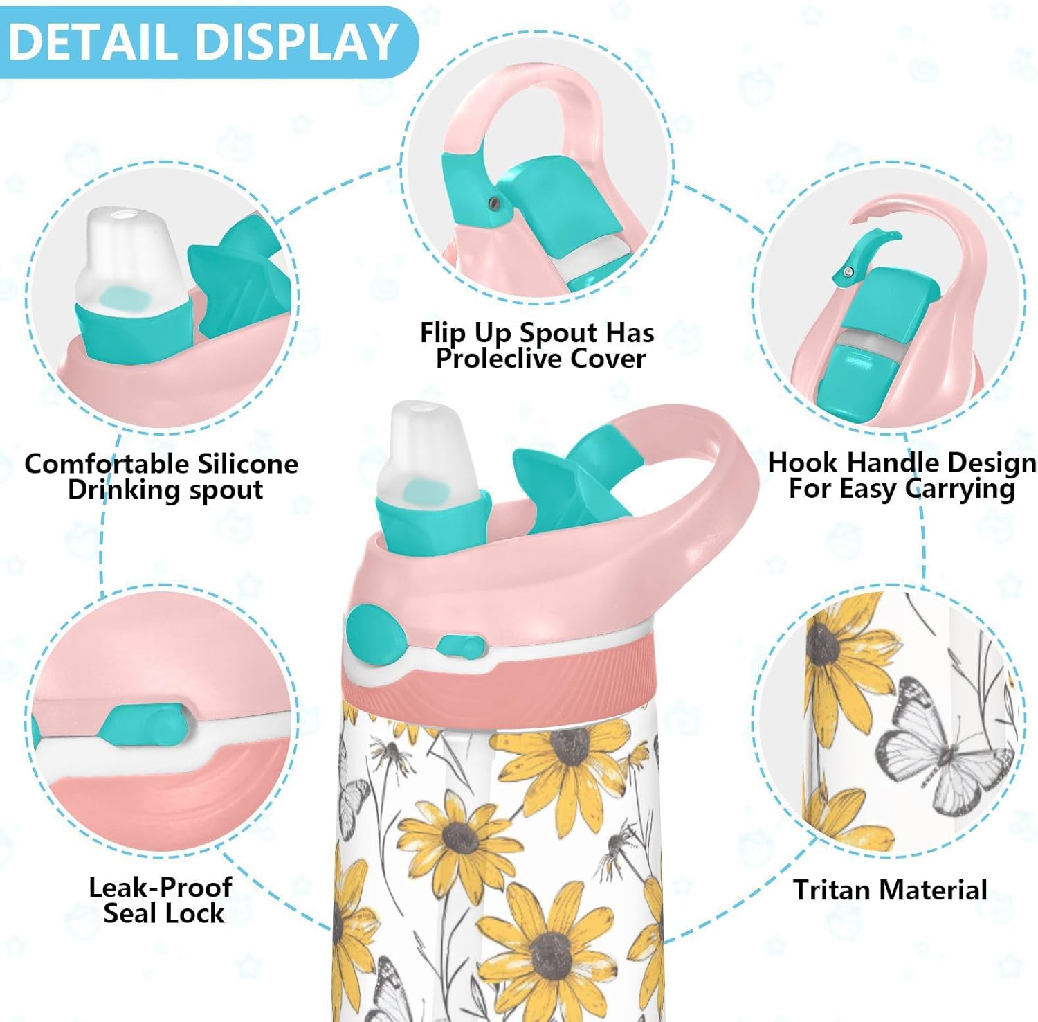 Materiale di sicurezza: il corpo in Tritan e il beccuccio in silicone alimentare garantiscono durata e sicurezza. Contiene 480 ml di acqua, perfetto per l'idratazione quotidiana. Non adatto a bambini di età inferiore ai 3 anni Design portatile: l'ampio manico e il gancio per coperchio rendono le bottiglie d'acqua sportive facili da trasportare. I bambini possono appenderlo alle loro borse, evitando il fastidio di cadere durante la ricreazione o i viaggi in autobus. Uso senza problemi con una sola mano: il design a becco d'anatra si adatta alle bocche dei bambini, con una copertura antipolvere. L'interruttore a pulsante della borraccia per bambini è facile da usare con 1 mano, anche quando giocano o corrono. Blocco per evitare fuoriuscite: il pulsante di blocco della borraccia sportiva impedisce al becco d'anatra di fuoriuscire per errore. Niente più fuoriuscite negli zaini, mantenendo il pranzo e i libri asciutti. Pulizia semplice: le parti completamente rimovibili evitano l'accumulo di sporco. Pulire con detergente neutro e acqua calda: facile per i genitori mantenere le bottiglie d'acqua sportive pulite per l'uso quotidiano.