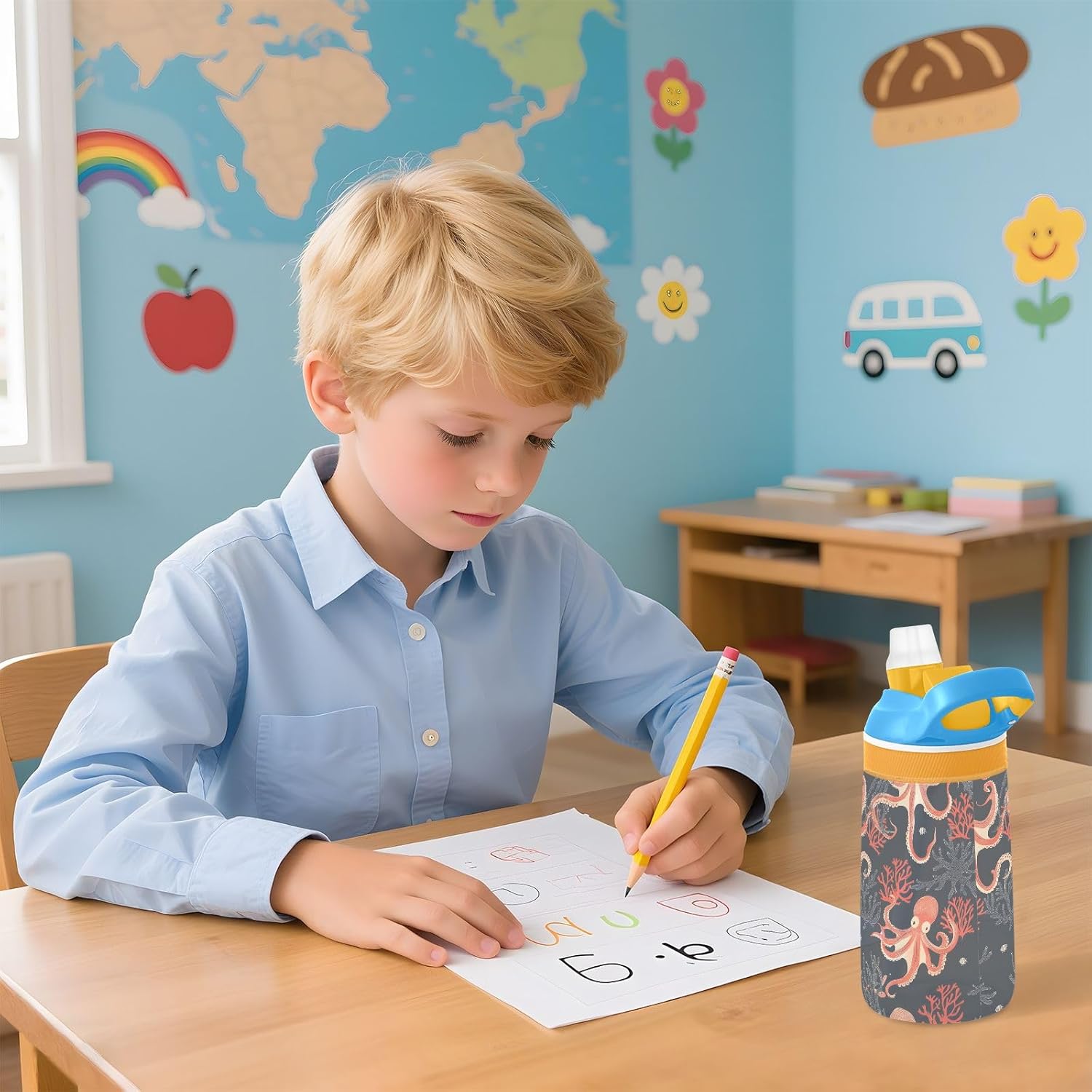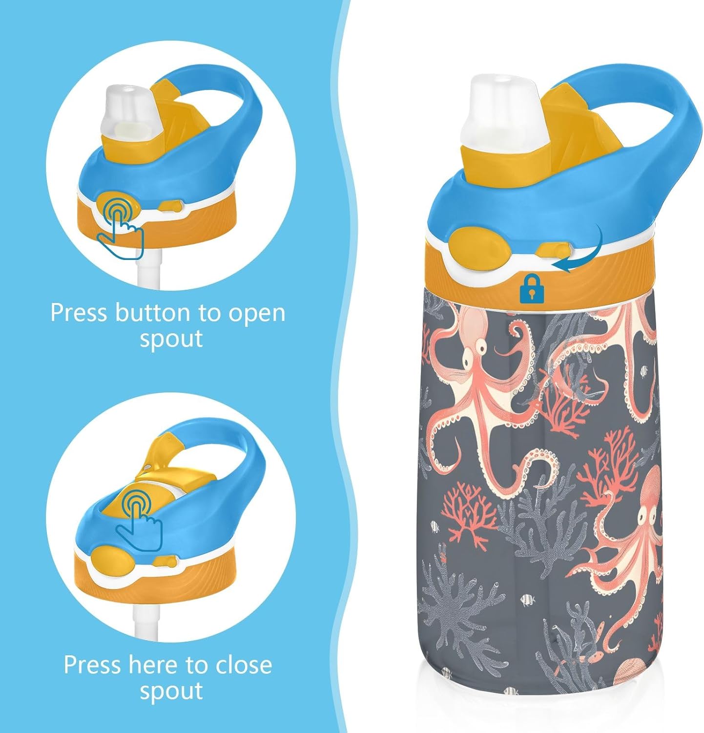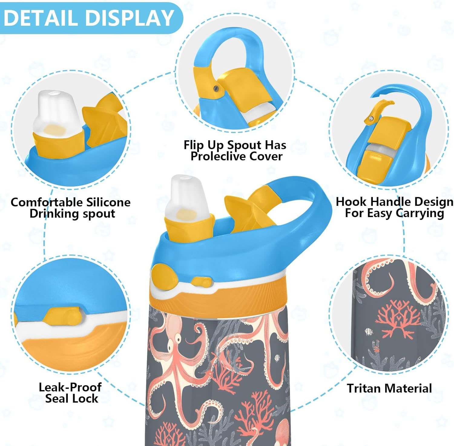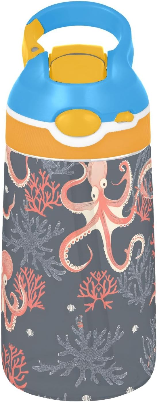 Borraccia per bambini con polpo e corallo, con cannuccia, in Tritan, per scuola, viaggi all'aperto