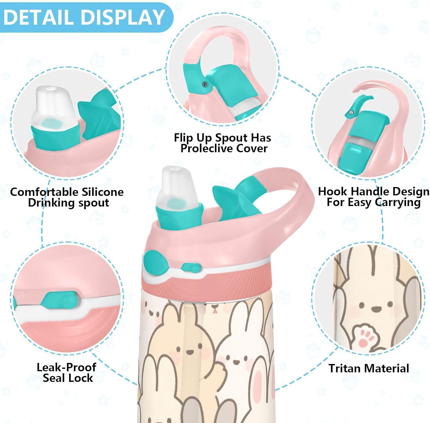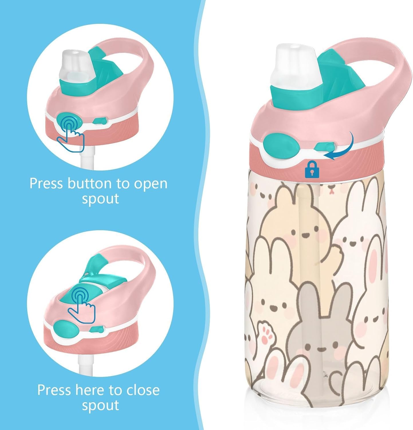 Materiali: questa borraccia da 480 ml (16 cm di lunghezza, 7,5 cm di larghezza) combina tritan e silicone alimentare. per la pratica sportiva o i giorni scolastici, è sicuro per i bambini da usare tutti i giorni. Non adatto a bambini di età inferiore ai 3 anni! Design portatile: l'ampio manico e il gancio per coperchio rendono le bottiglie d'acqua sportive facili da trasportare. I bambini possono appenderlo alle loro borse, evitando il fastidio di cadere durante la ricreazione o i viaggi in autobus. Funzionamento con una sola mano: il becco d'anatra si adatta alla bocca dei bambini, con una copertura antipolvere. L'interruttore a pulsante di Water Bottle Kids è semplice da usare con una sola mano, in modo che i bambini possano bere mentre tengono una palla o un notebook. Blocco di sicurezza: il blocco del pulsante impedisce lo scoppio accidentale del becco d'anatra. Previene le perdite quando viene gettato nello zaino, mantenendo asciutti snack e compiti. Pulizia semplice: le parti completamente rimovibili evitano l'accumulo di sporco. Pulire con detergente neutro e acqua calda: facile per i genitori mantenere pulita la borraccia sportiva per l'uso quotidiano.