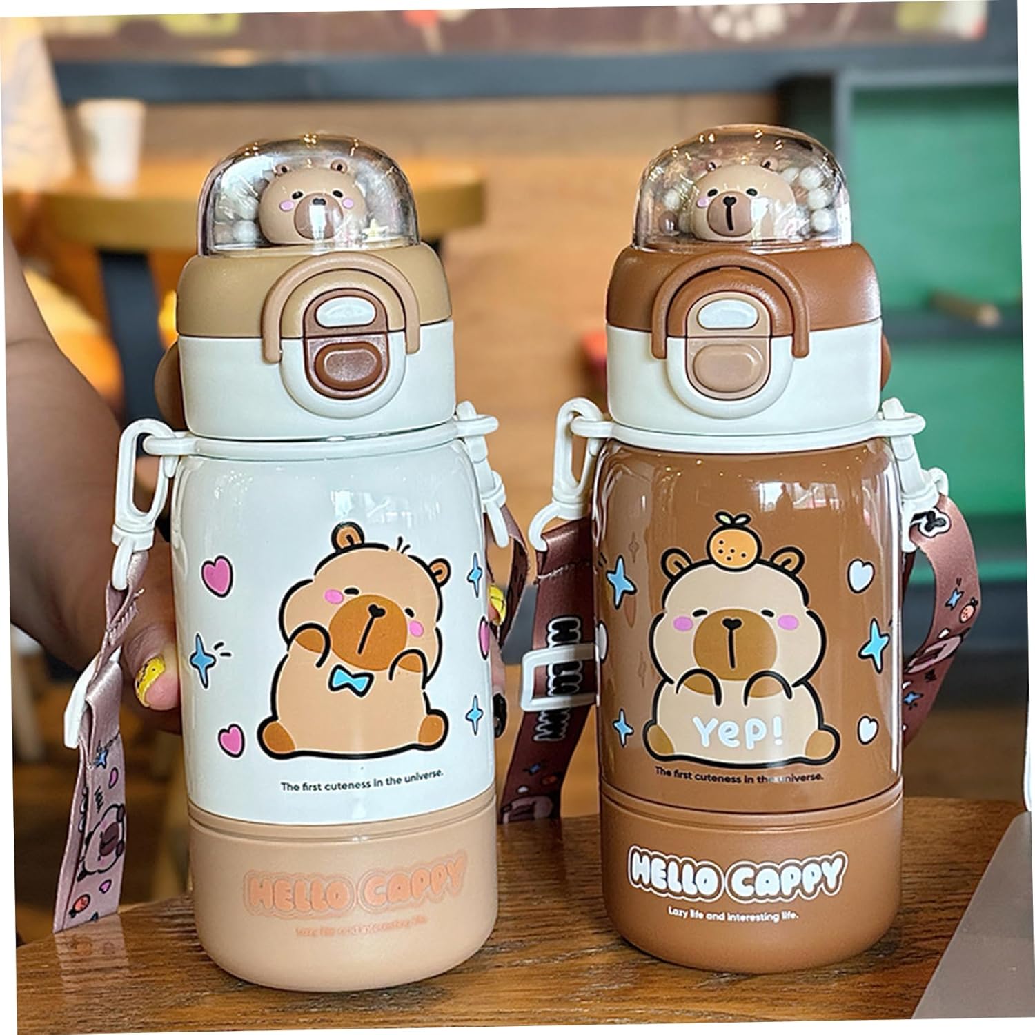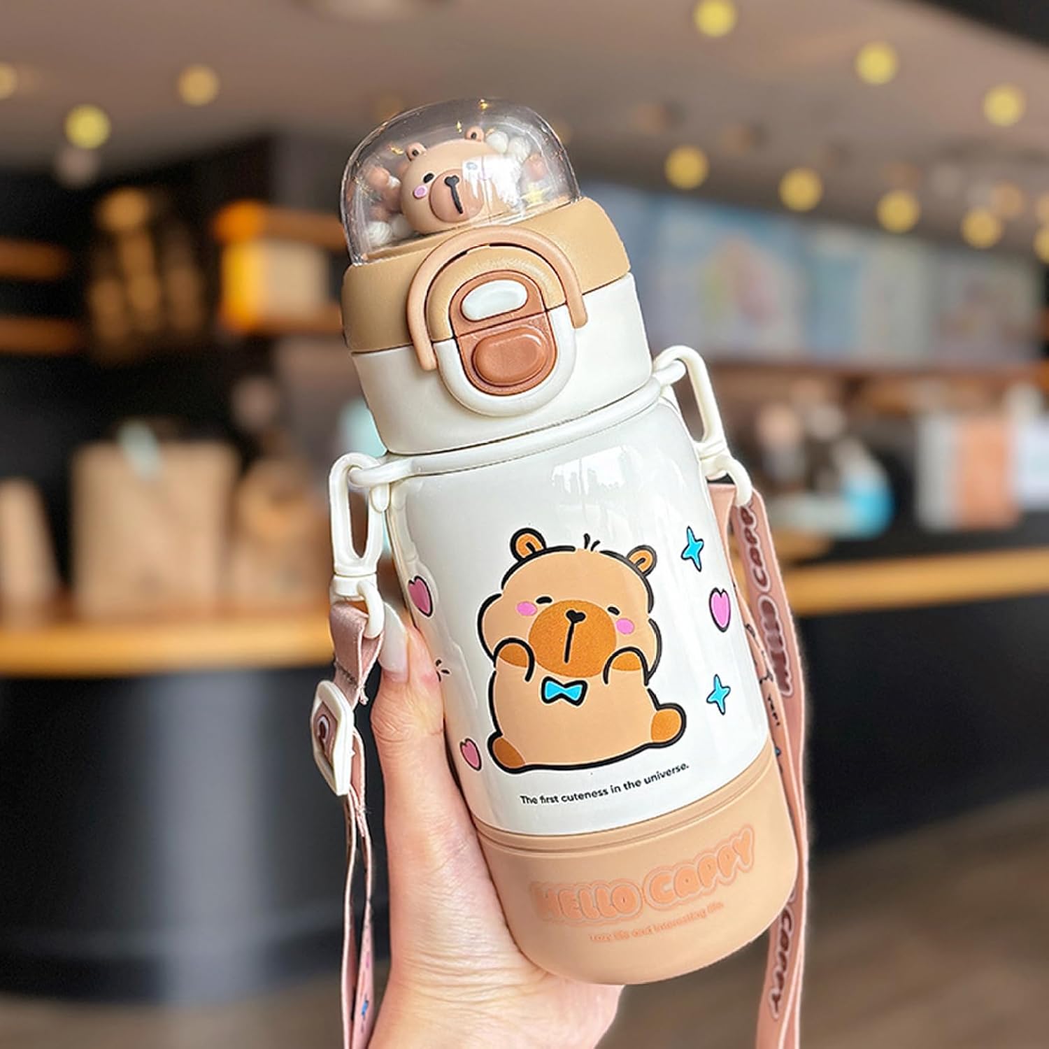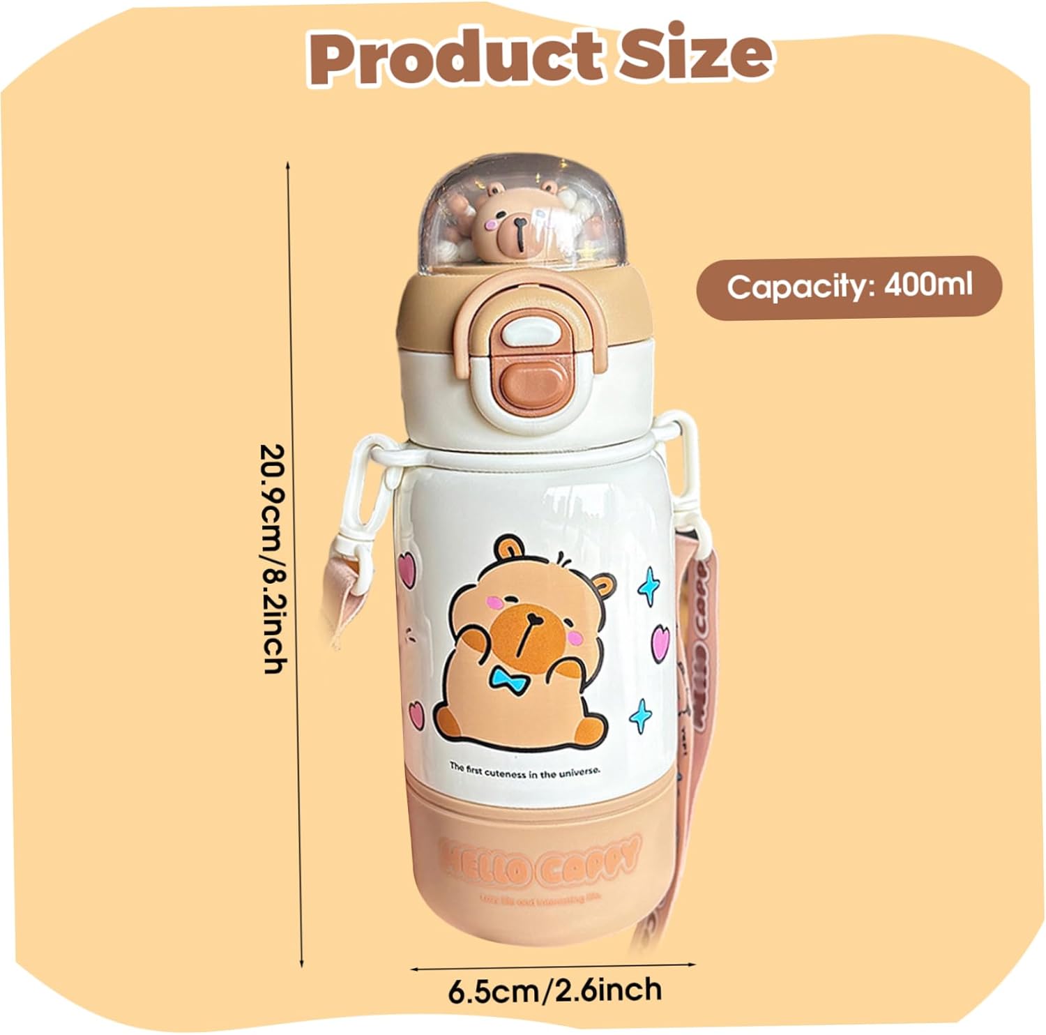 Comodità portatile: dotata di una pratica cannuccia, una cinghia di sicurezza e un bicchiere staccabile, questa bottiglia da 400 ml/14 once è facile da trasportare e perfetta per la scuola, le attività all'aperto e i viaggi. Simpatico design a forma di animale: caratterizzata da un adorabile motivo capibara, questa bottiglia d'acqua piace ai bambini e alle ragazze che amano gli accessori kawaii e affascinanti, rendendo l'idratazione divertente e coinvolgente. Adatta ai bambini e sicura: la bottiglia d'acqua è sicura e utilizza materiali di qualità alimentare per garantire un'esperienza di consumo sicura per i bambini, promuovendo sane abitudini di idratazione. Acciaio inossidabile stabile: realizzata in acciaio inossidabile per uso alimentare, questa bottiglia d'acqua garantisce un uso duraturo ed è resistente al calore, mantenendo la temperatura e la sicurezza della bevanda. Isolamento versatile: progettato per mantenere le bevande a una temperatura ottimale, preserva efficacemente i liquidi freddi o caldi, offrendo comfort in ogni stagione per bambini e ragazze attivi.