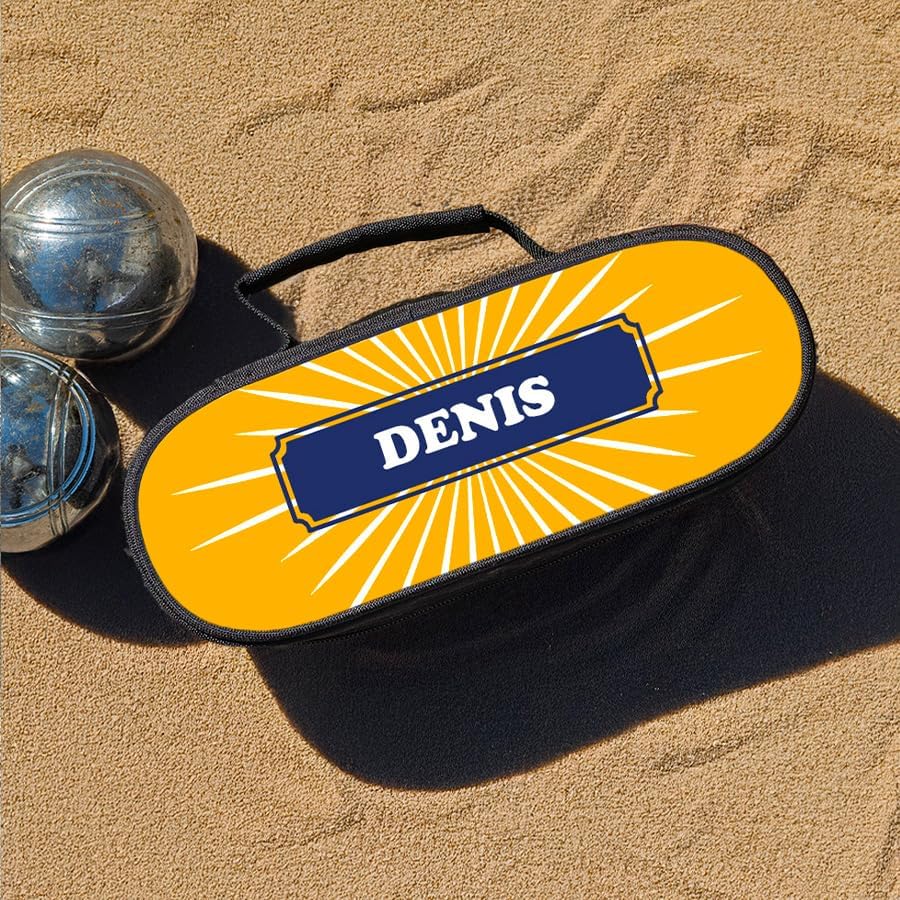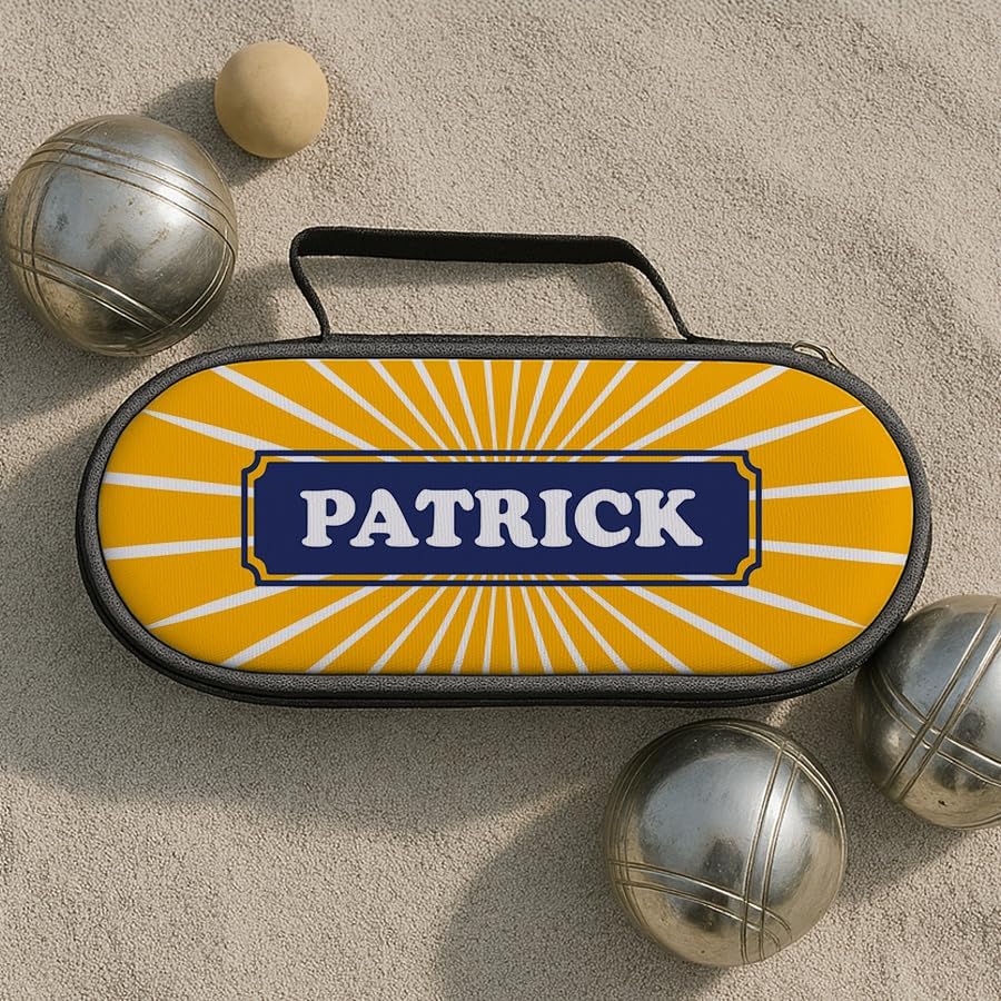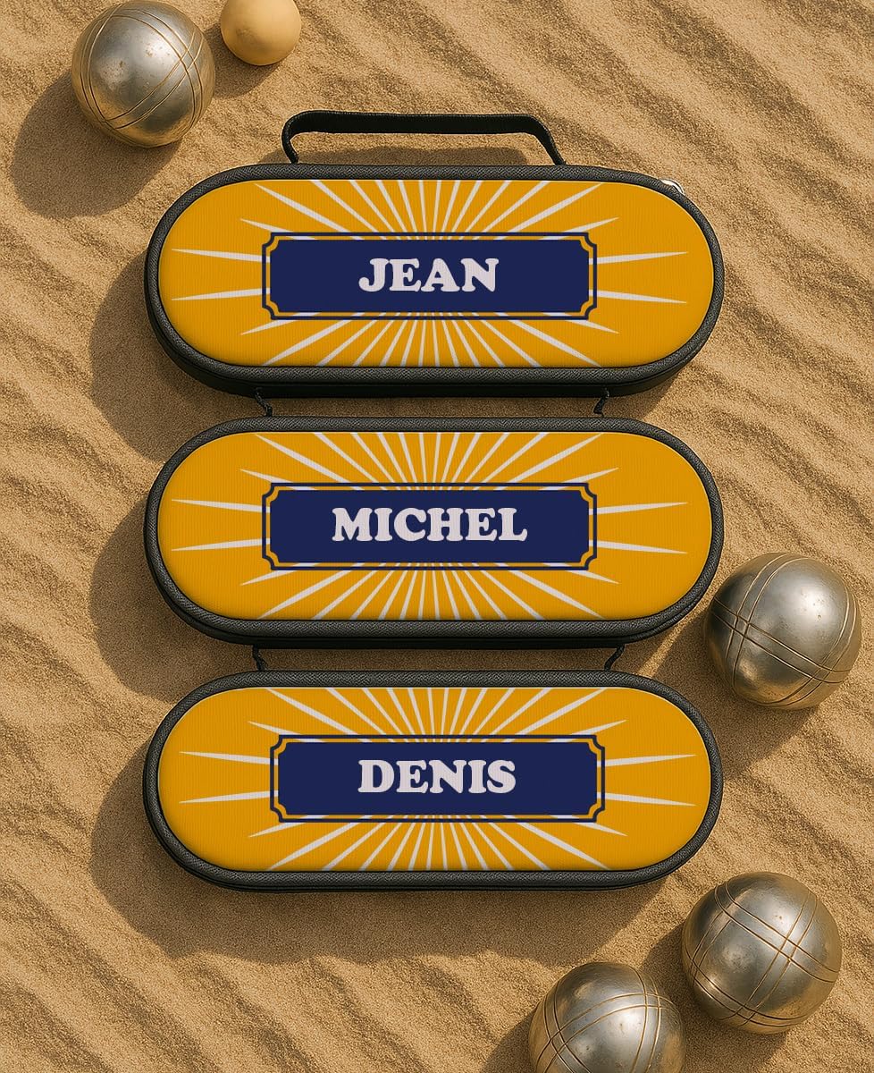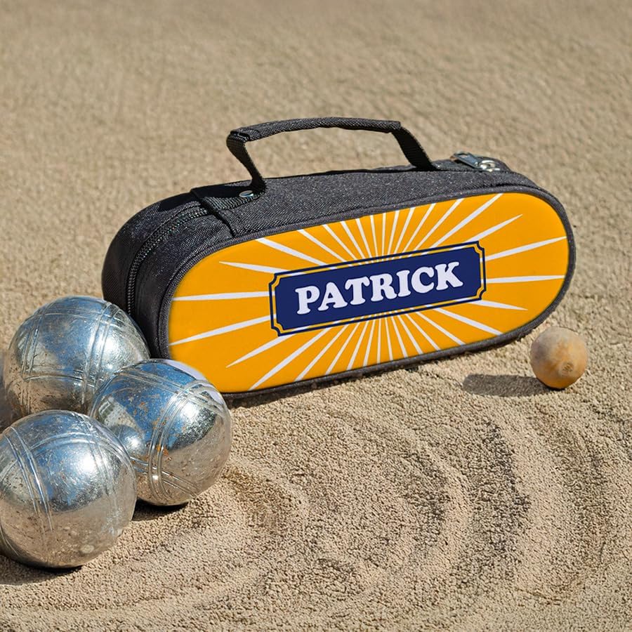 DIMENSIONI: Borsa da bocce compatta misura 23 x 9 x 6 cm, perfetta per un trasporto facile e conveniente CAPACITÀ: Progettato appositamente per ospitare fino a 3 palline di bocce, con una cerniera sicura PERSONALIZZAZIONE: Design unico con motivo Sole Anice e possibilità di personalizzare con il tuo nome per uno stile distintivo TRASFORMAZIONE FRANCESE: prodotto lavorato con cura nel nostro laboratorio a Bordeaux, garantendo una qualità artigianale BONUS: Un maiale offerto con ogni borsa, l'accessorio indispensabile per completare la tua attrezzatura da bocce