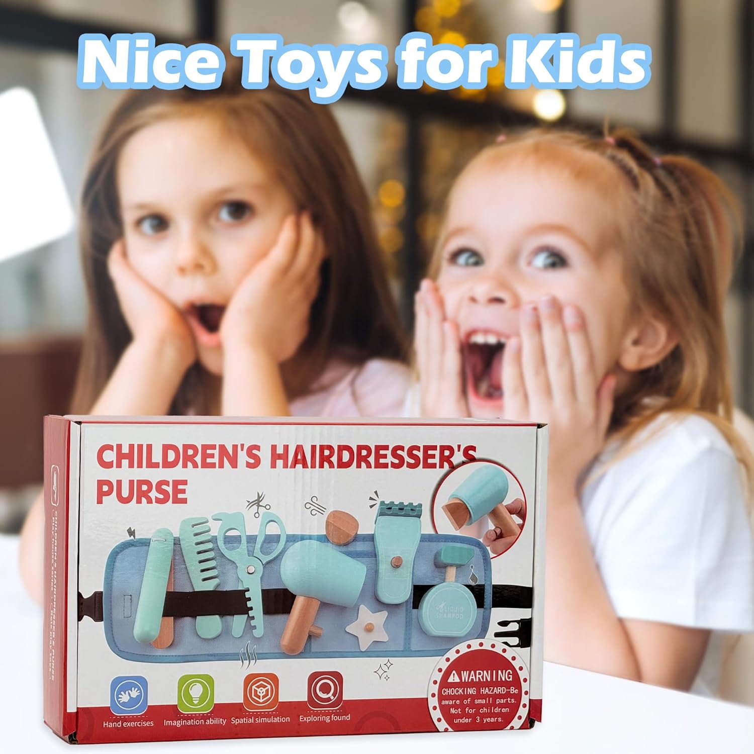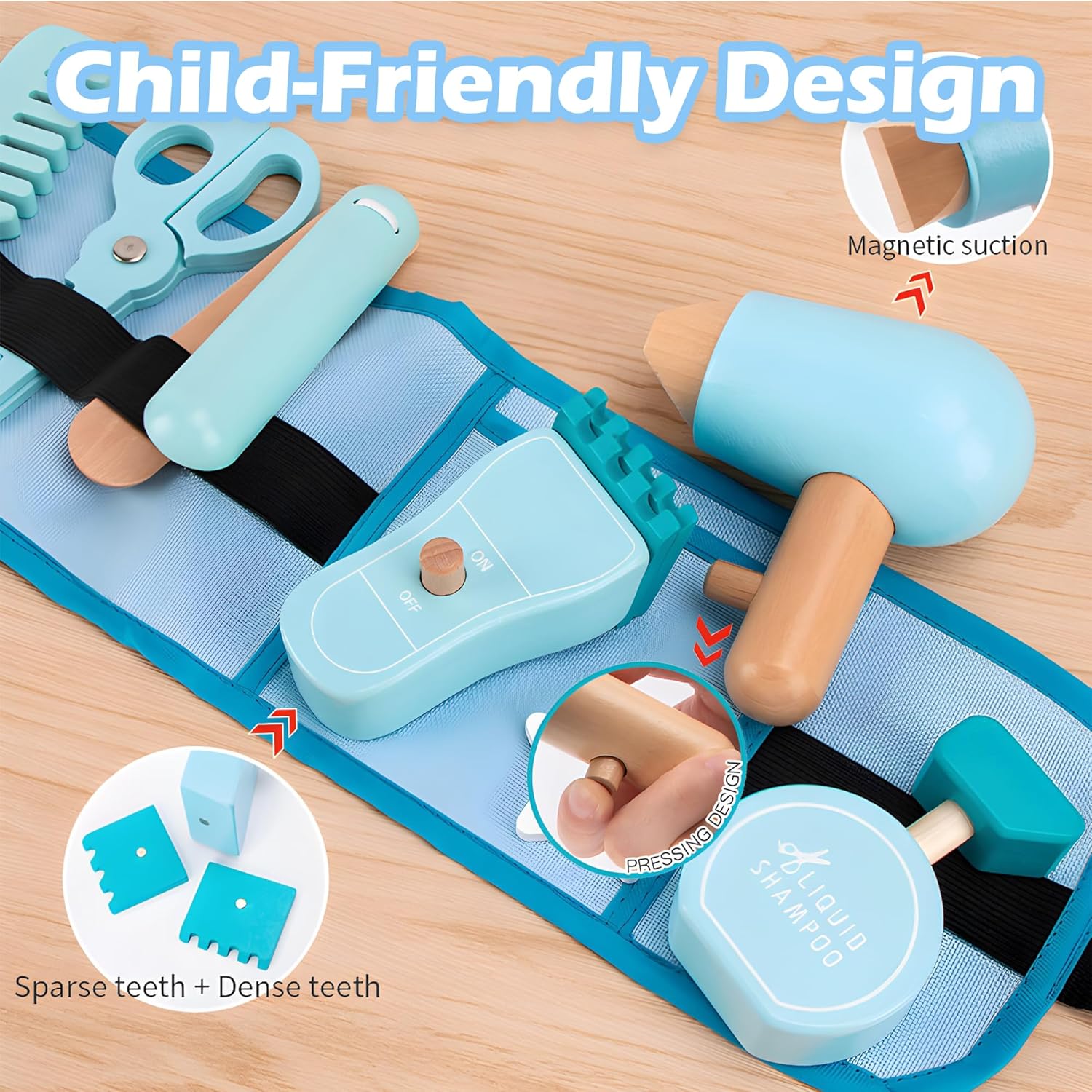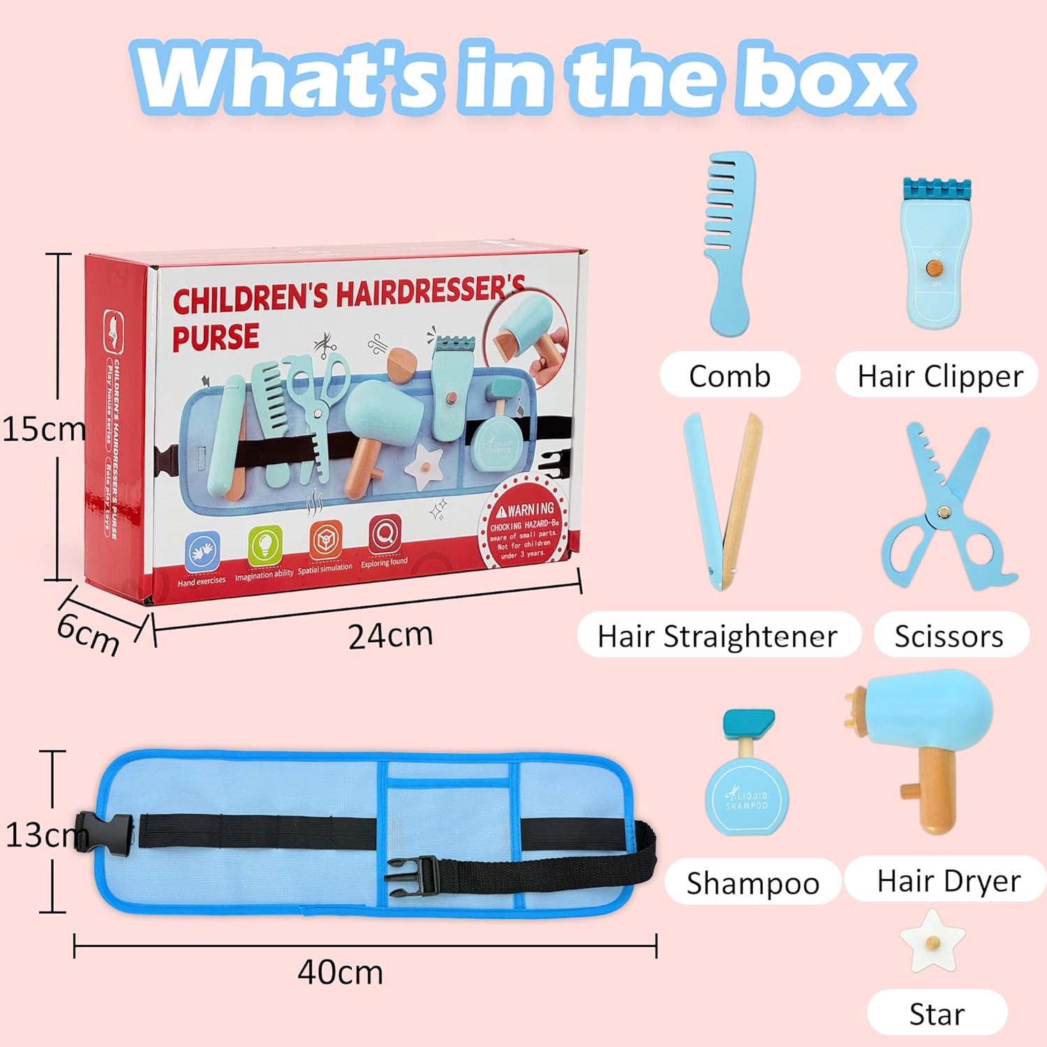 Set di giocattoli in legno di alta qualità: Il set per simulare il taglio dei capelli è realizzato in legno liscio e sicuro, senza sbavature, senza odori, senza componenti elettronici, piccolo e leggero per le manine dei vostri bambini. Set da parrucchiere per bambini: Questo set soddisfa le esigenze di un piccolo parrucchiere. Contiene un asciugacapelli, un pettine, uno shampoo, mollette liscianti, forbici e stelle. Tutti gli accessori sono in legno e adatti ai bambini. Set da parrucchiere beltpack: Cintura regolabile lunga 69,5 cm, adatta a bambini dai 3 anni in su. Lo zaino con cintura in tela è leggero e resistente, facile da trasportare e sviluppa l'abitudine all'organizzazione e alla conservazione negli oggetti nel vostro bambino. Gioco di ruolo coinvolgente: Con il set da parrucchiere, i bambini possono fingere di essere dei veri parrucchieri e dare libero sfogo alla loro fantasia. Inoltre, grazie al set da parrucchiere, i bambini interagiscono con la loro famiglia e i loro amici, il che favorisce il legame. Ottima idea regalo: Un set da parrucchiere in legno è un giocattolo attraente ed educativo che non solo stimola le capacità motorie fini, ma anche la fantasia e la collaborazione.