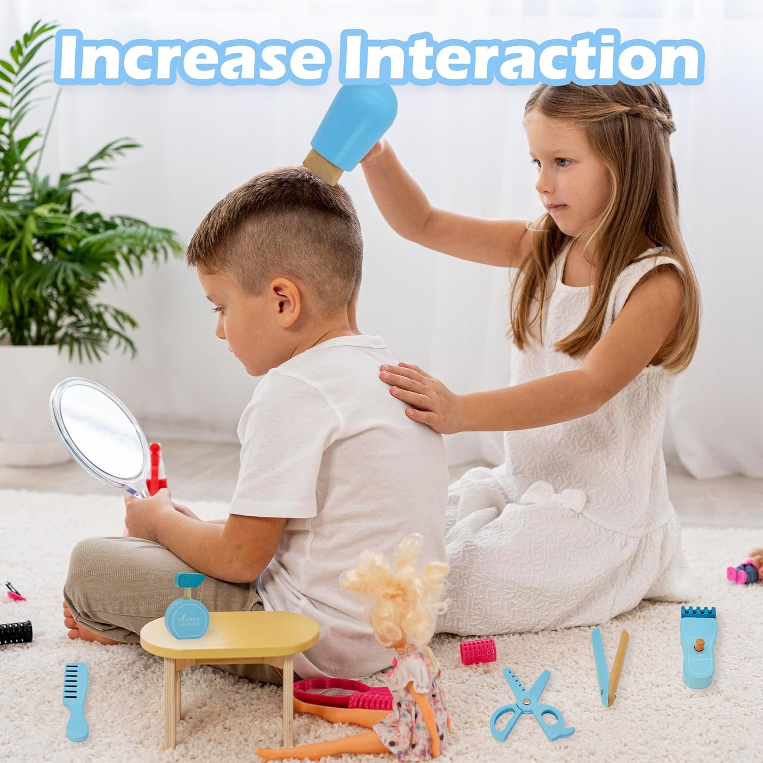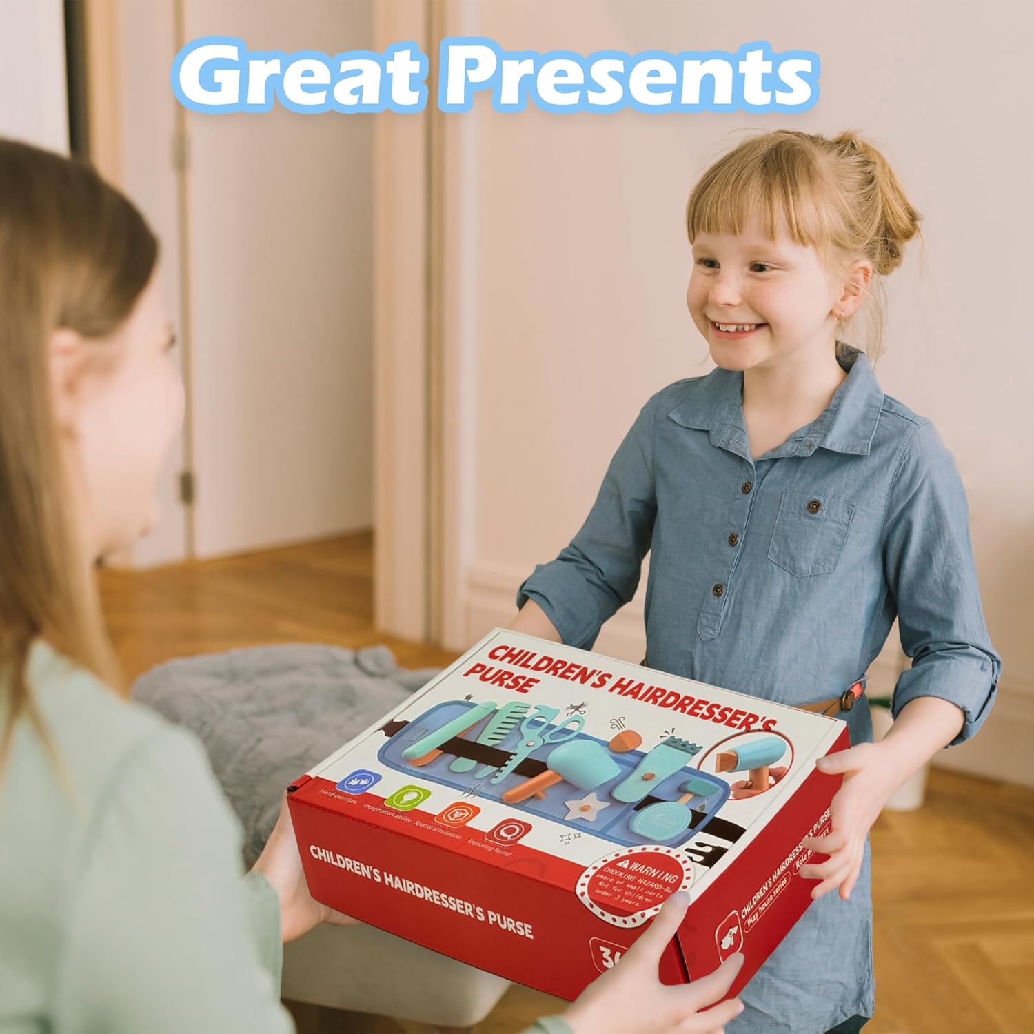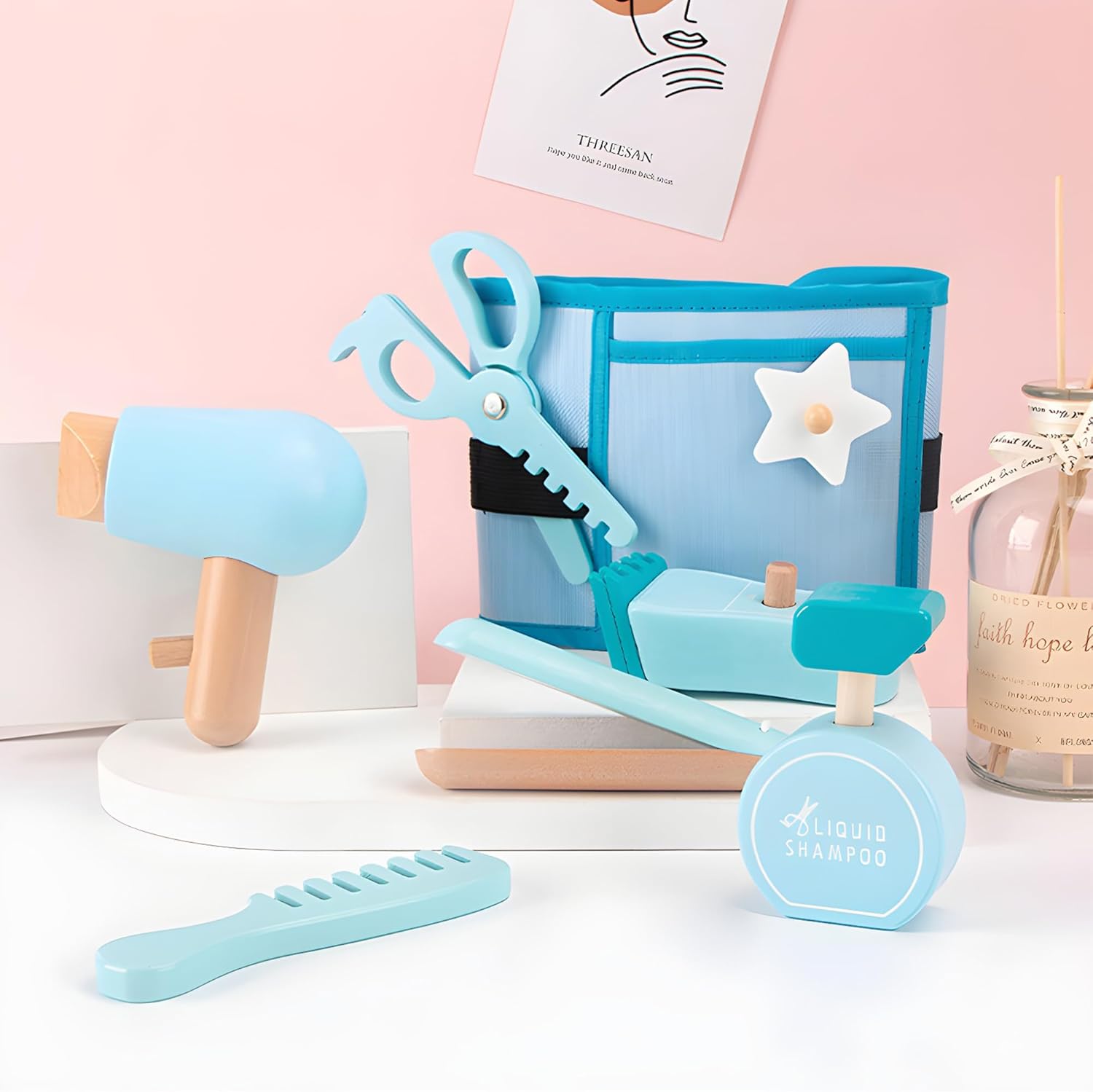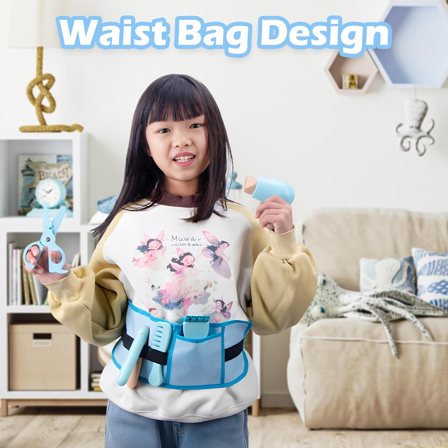 Set di giocattoli in legno di alta qualità: Il set per simulare il taglio dei capelli è realizzato in legno liscio e sicuro, senza sbavature, senza odori, senza componenti elettronici, piccolo e leggero per le manine dei vostri bambini. Set da parrucchiere per bambini: Questo set soddisfa le esigenze di un piccolo parrucchiere. Contiene un asciugacapelli, un pettine, uno shampoo, mollette liscianti, forbici e stelle. Tutti gli accessori sono in legno e adatti ai bambini. Set da parrucchiere beltpack: Cintura regolabile lunga 69,5 cm, adatta a bambini dai 3 anni in su. Lo zaino con cintura in tela è leggero e resistente, facile da trasportare e sviluppa l'abitudine all'organizzazione e alla conservazione negli oggetti nel vostro bambino. Gioco di ruolo coinvolgente: Con il set da parrucchiere, i bambini possono fingere di essere dei veri parrucchieri e dare libero sfogo alla loro fantasia. Inoltre, grazie al set da parrucchiere, i bambini interagiscono con la loro famiglia e i loro amici, il che favorisce il legame. Ottima idea regalo: Un set da parrucchiere in legno è un giocattolo attraente ed educativo che non solo stimola le capacità motorie fini, ma anche la fantasia e la collaborazione.