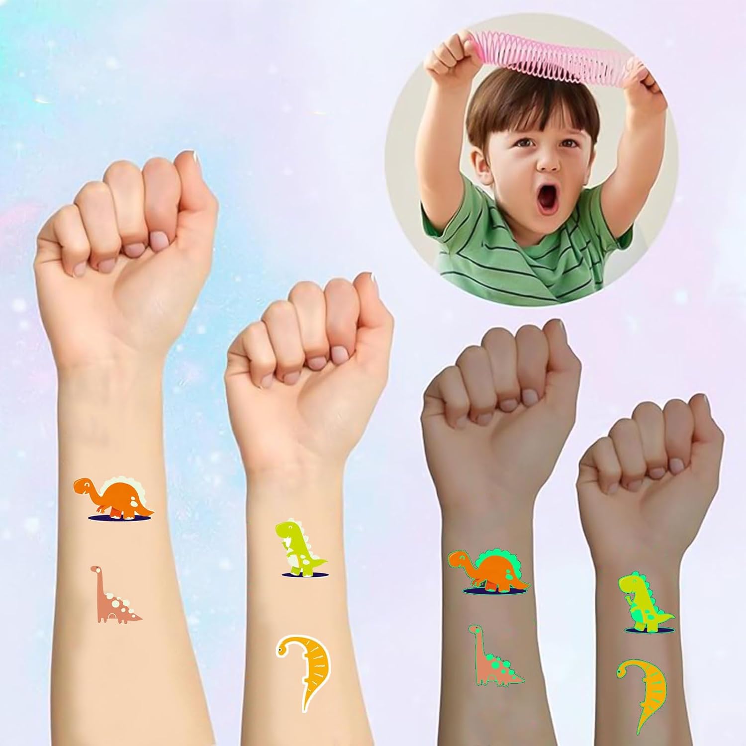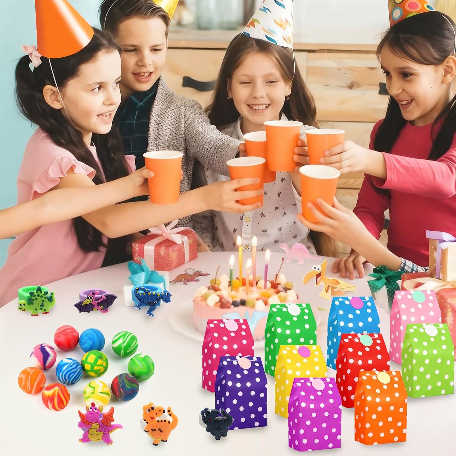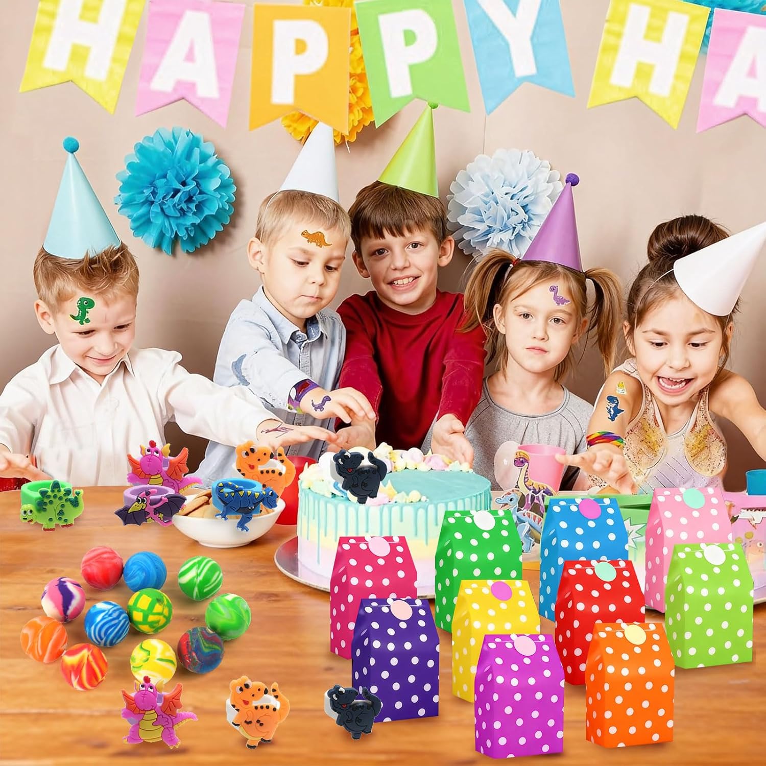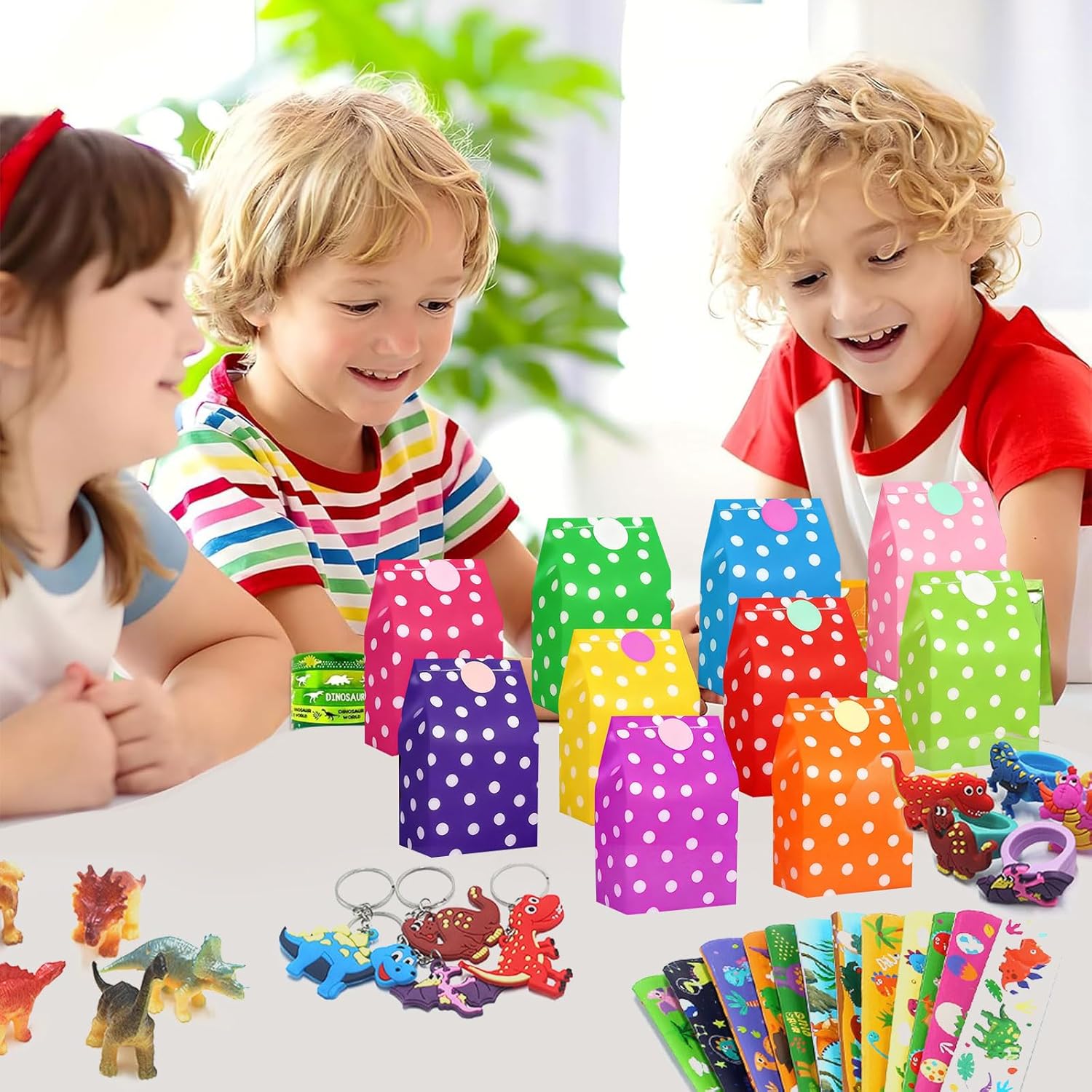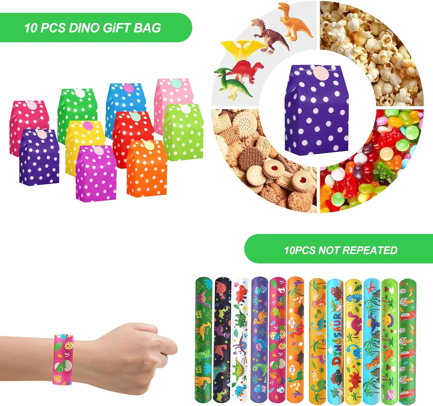 VARIETÀ DI GIOCATTOLI DINO: Questo set di compleanno per bambini Dino da 76 pezzi offre un'ampia selezione di popolari borse da festa Dino articoli per il compleanno di bambini, tra cui 12 anelli Dino, 12 portachiavi Dino, 12 braccialetti Dino in PVC, 10 sacchetti di compleanno per bambini Dino con colori colorati e adesivi con chiusura, 10 adesivi Dino con design fosforescente, 10 palline rimbalzanti e 10 mani adesive. Perfetto per aggiungere un'atmosfera allegra e colorata a qualsiasi decorazione per feste di dinosauri o decorazioni per compleanni di dinosauri. DIVERTIMENTO PER I BAMBINI: gli elementi decorativi dei dinosauri in questo set stimolano l'immaginazione dei bambini e promuovono le loro capacità motorie. Che si tratti di tatuaggi di dinosauri per bambini, adesivi di dinosauri o braccialetti di dinosauri in PVC, i bambini si divertono per ore. Questi sacchetti per feste di compleanno con dinosauri sono ideali come riempimento per sacchetti per feste, pignatte o piccoli premi. Con questo set ogni festa di compleanno per bambini sarà un'esperienza indimenticabile per ragazzi e ragazze. MATERIALE SICURO: Tutti i componenti del set di dinosauri per il compleanno dei bambini sono realizzati in plastica, carta e gomma di alta qualità. Le superfici sono lisce, senza spigoli vivi, inodore e robuste. I bambini possono utilizzare gli adesivi con i dinosauri, i tatuaggi con i dinosauri e i braccialetti senza esitazione. I materiali sono durevoli, riutilizzabili e riciclabili, per un divertimento sicuro e sostenibile con ogni decorazione della festa dei dinosauri. CONFEZIONE IDEALE: Il set contiene sacchetti Dino per feste di compleanno per bambini (24 × 13 × 8 cm) in 10 colori, ciascuno con un adesivo sigillante abbinato. Ciò significa che tutti i regalini Dino per il compleanno dei bambini possono essere confezionati direttamente come piccoli regali. I sacchetti sono stabili, hanno un fondo piatto, sono facili da riempire e sono ideali per qualsiasi decorazione di compleanno di dinosauri, sia a casa, all'asilo o a scuola. REGALO PERFETTO: questo set di borse per feste di compleanno per bambini è la scelta ideale per genitori e insegnanti che stanno organizzando una festa con i dinosauri o sono alla ricerca di piccole sorprese per i bambini. Adatto come sacchetto per la festa di compleanno di dinosauro, adesivo con dinosauro, tatuaggio di dinosauro per bambini, sacchetto di dinosauro per compleanno di bambini o decorazione di dinosauro per compleanni, feste scolastiche, carnevale, Natale, Pasqua o come premio di classe. Crea un'atmosfera festosa e rende ogni festa di compleanno per bambini con dinosauri un'esperienza speciale.