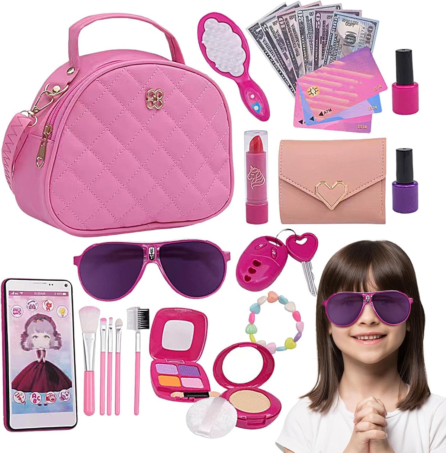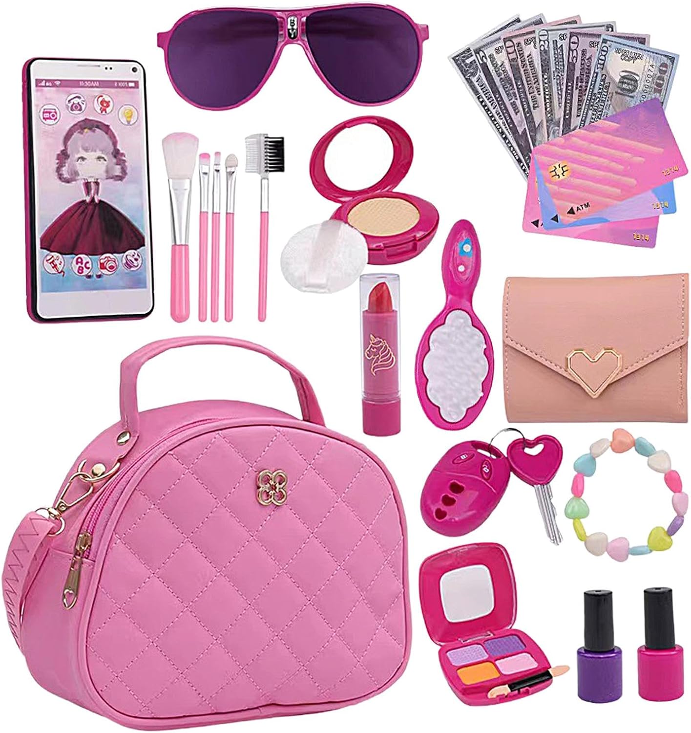Set di borsette da gioco simulate: la nostra borsetta da gioco per bambine è progettata per incoraggiare il gioco fantasioso e sviluppare la creatività. Viene fornito con un'elegante borsetta, portafoglio, cellulare, chiavi della macchina, occhiali da sole, carte di credito e set per il trucco, perfetti per consentire al tuo bambino di imitare le attività di shopping della mamma. Materiali morbidi: la nostra borsetta da gioco per bambine promuove il gioco di simulazione con un design e una sensazione realistici, con rossetti lucenti e cuscini d'aria che promuovono l'immaginazione garantendo allo stesso tempo un tempo di gioco sicuro e innocuo. Incoraggia il gioco interattivo: con suoni e luci realistici del telefono, la nostra borsa da gioco per bambine incoraggia l'immaginazione e le abilità sociali attraverso il gioco di ruolo. Lunga durata: con una tracolla morbida regolabile per un facile trasporto, la nostra borsa da gioco per bambine è realizzata con materiali robusti e di alta qualità e progettata con una cerniera in metallo liscio. L'interno spazioso è perfetto per riporre gli accessori, rendendolo una scelta pratica e conveniente per il tuo bambino. Regalo sorprendente: rendi indimenticabili compleanni, Natale, Pasqua, vacanze e altre occasioni speciali con questa borsetta da bambina. Adatto a bambini dai 3 agli 8 anni, l'opzione regalo perfetta